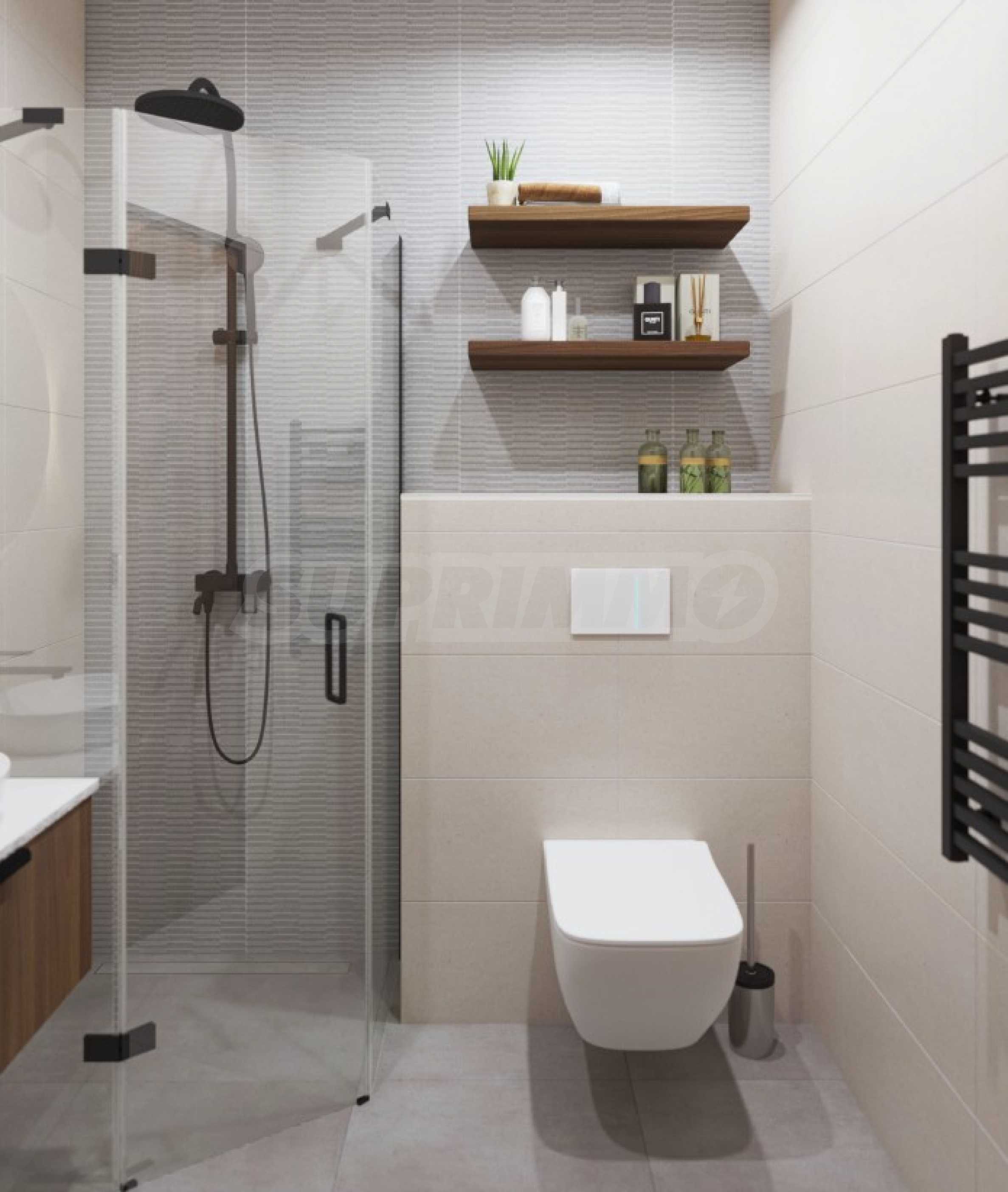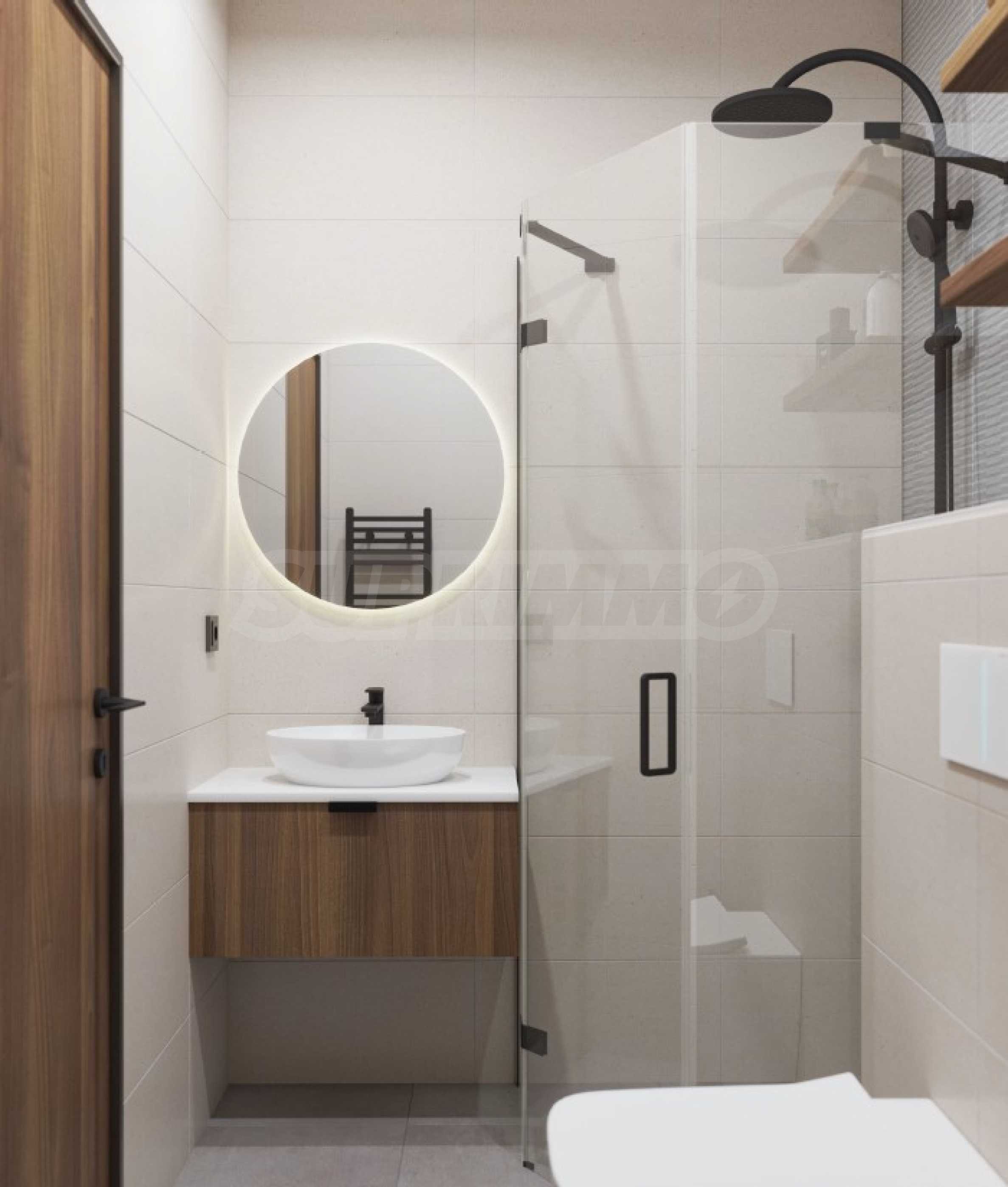 Апартаментът е разделен на две самостоятелни студиа с удобно разпределение, всяко с готови бани, настилки, латекс, интериорни врати и первази: