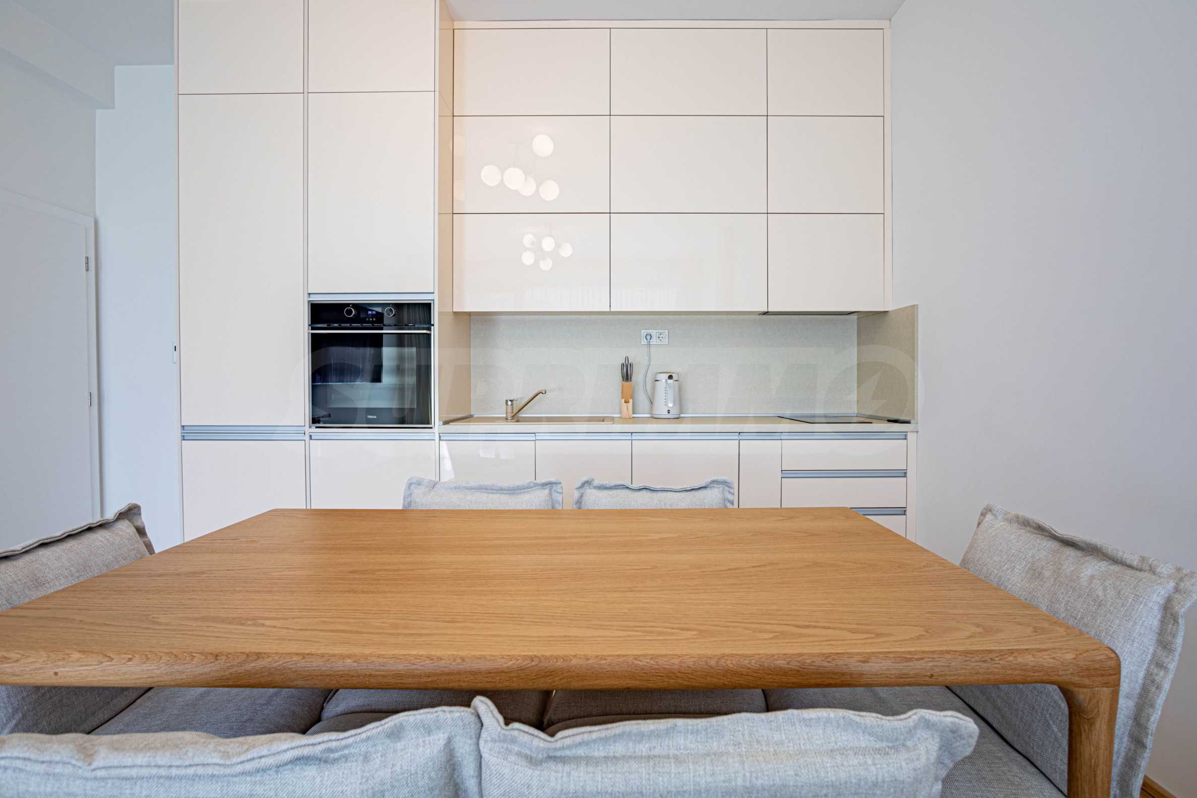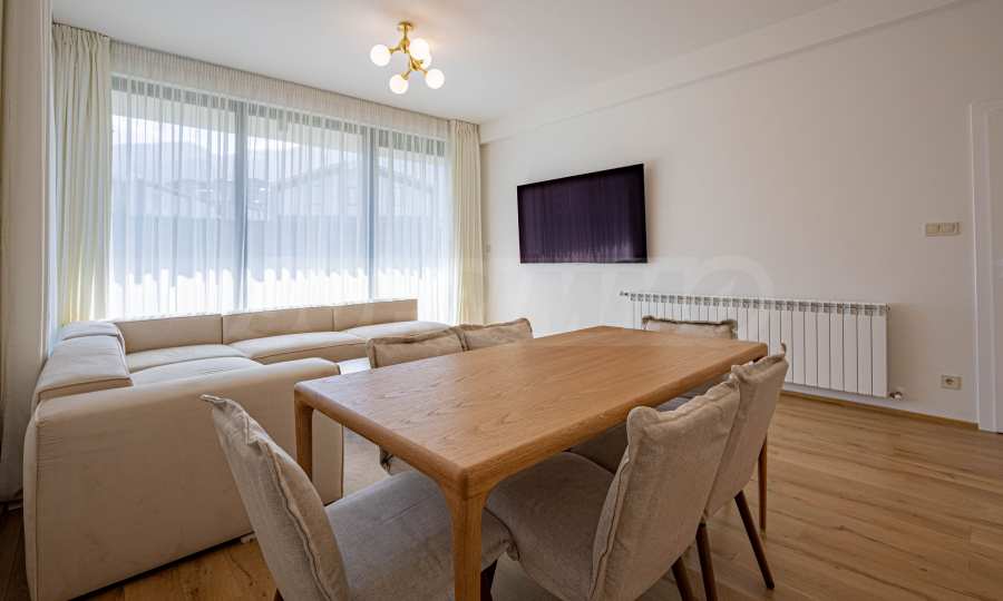 - хол с трапезарна маса, мека мебел и напълно оборудвана вградена кухня, подова настилка - естествен паркет;