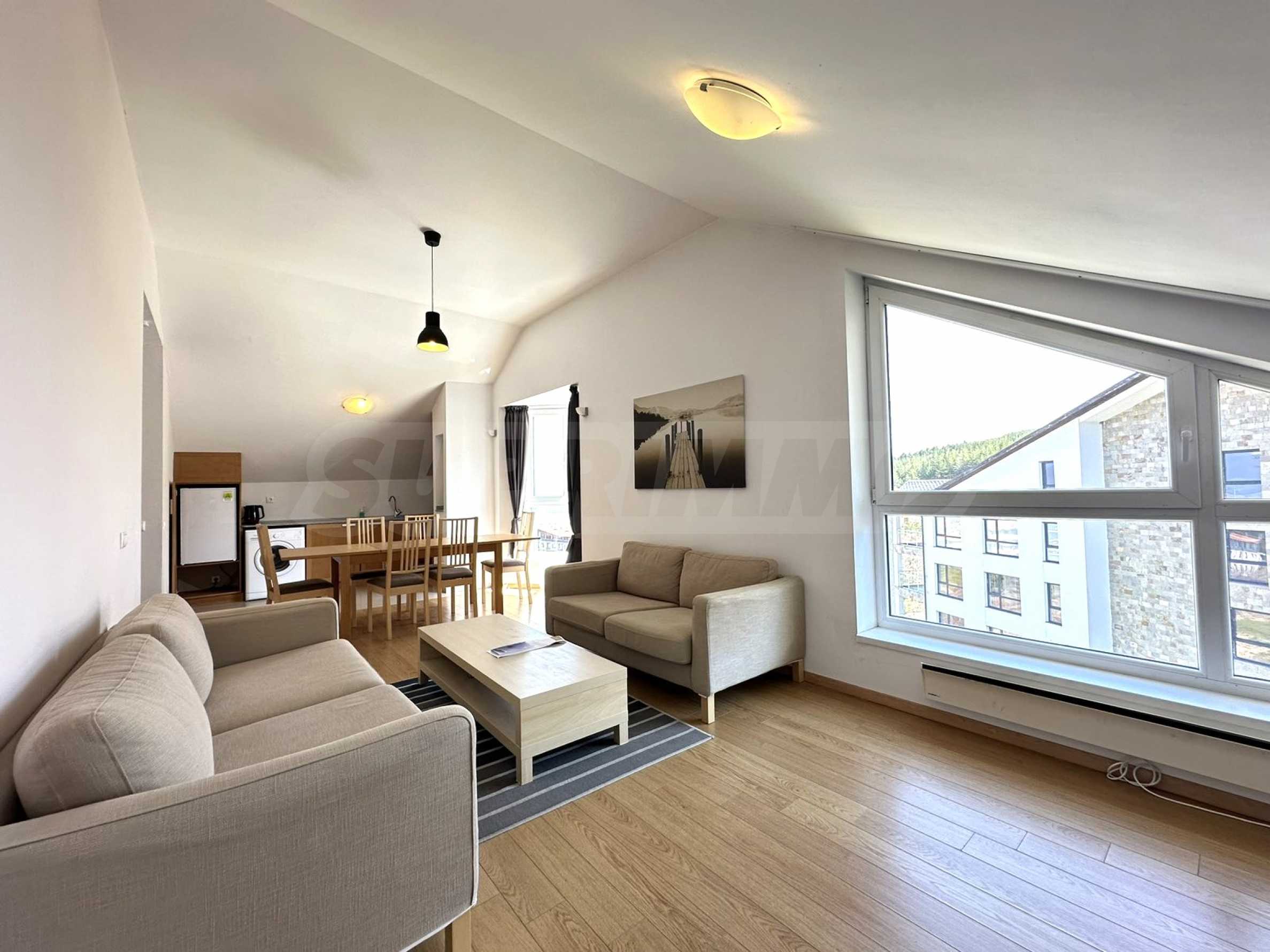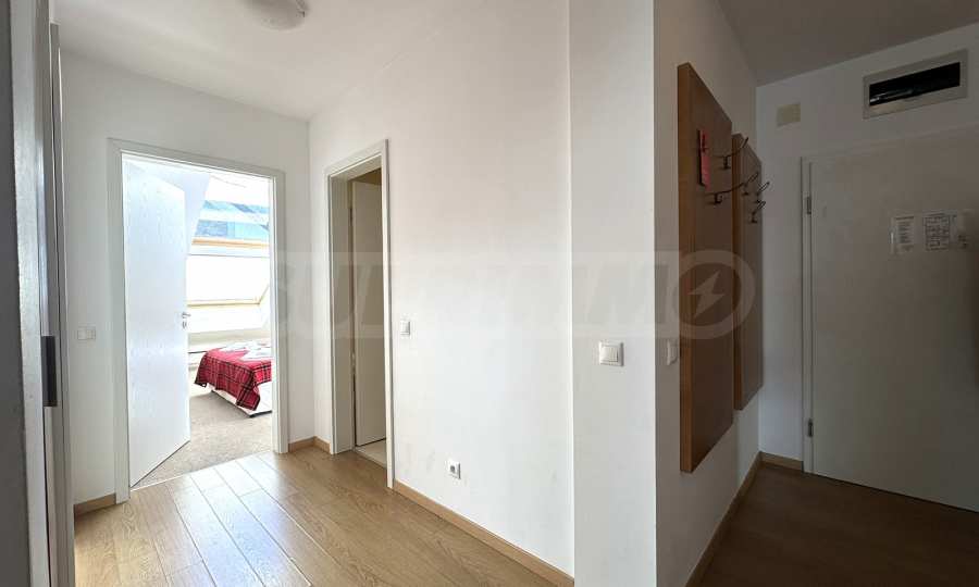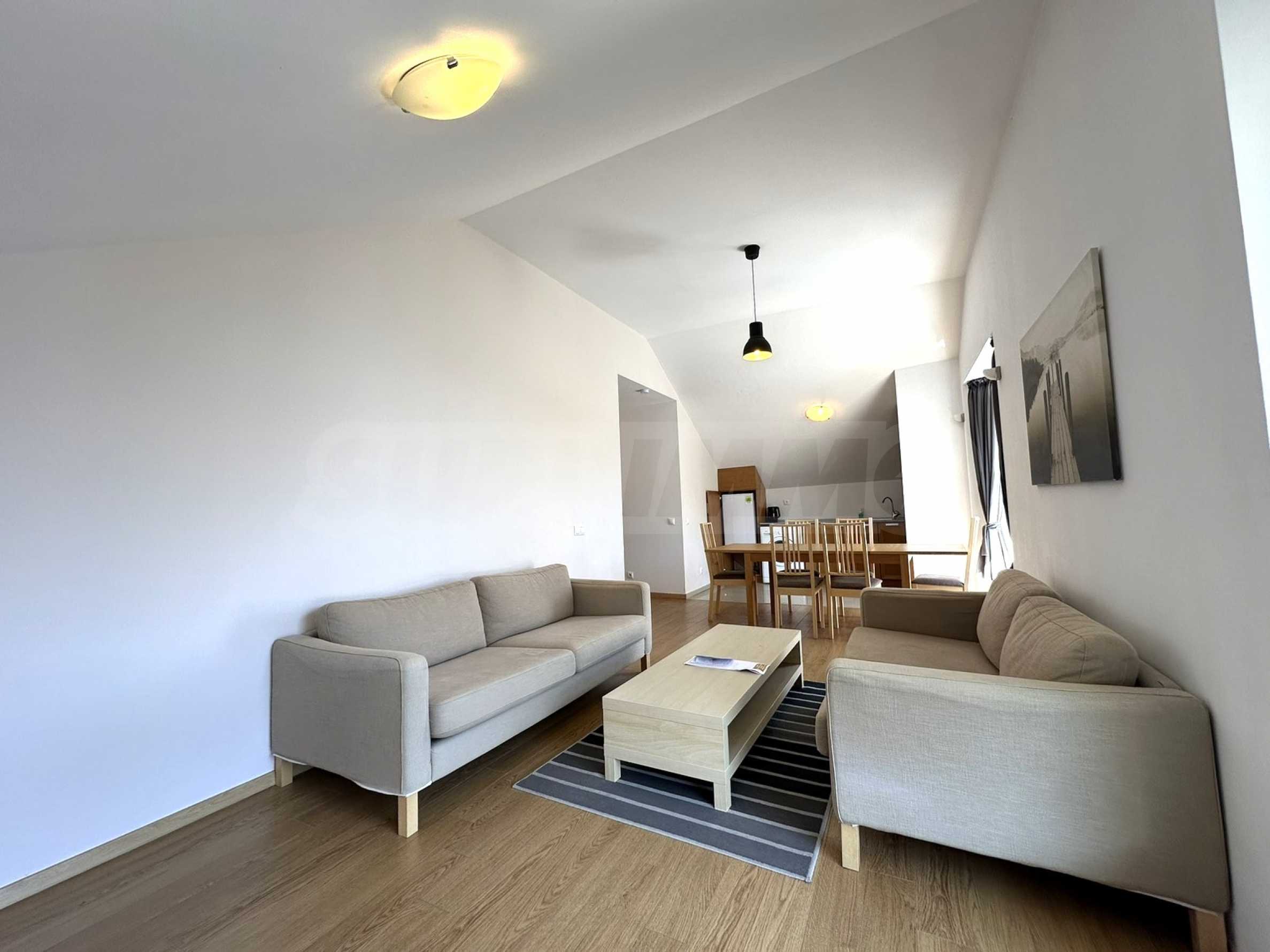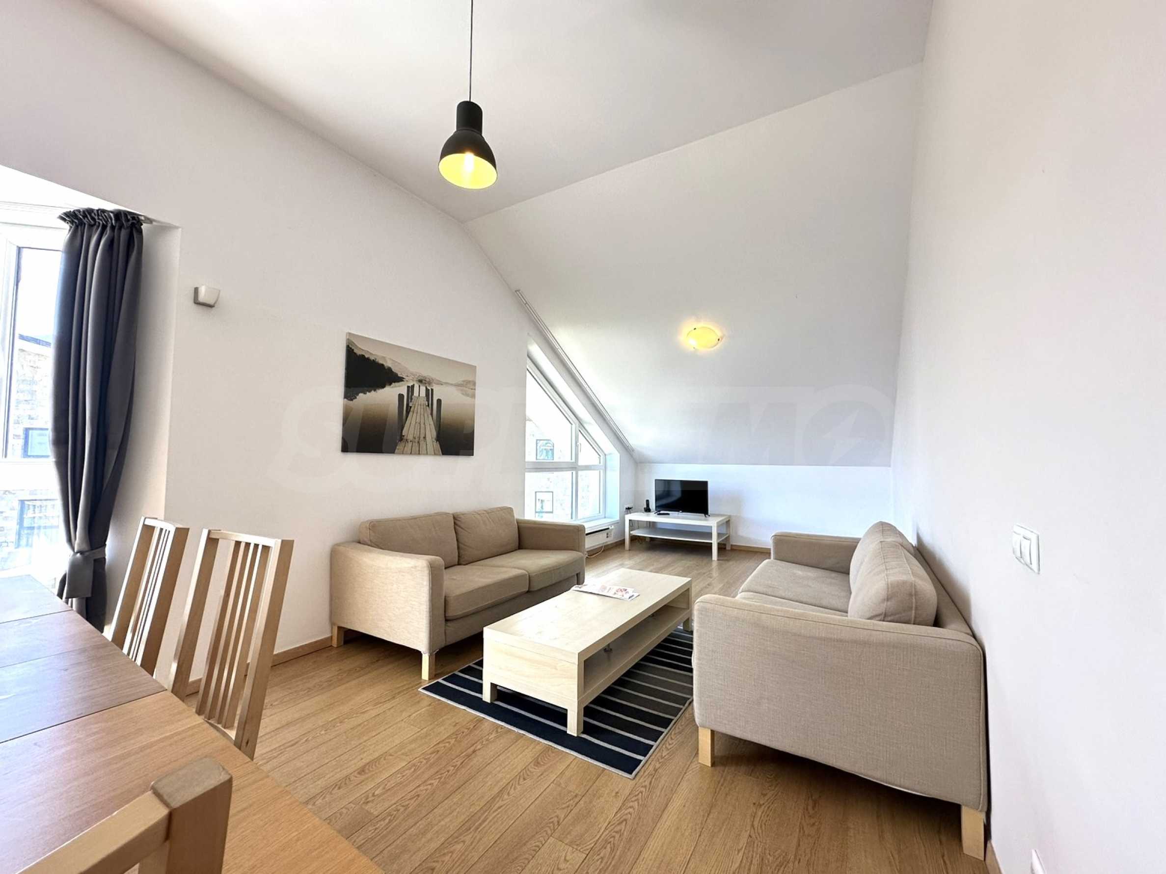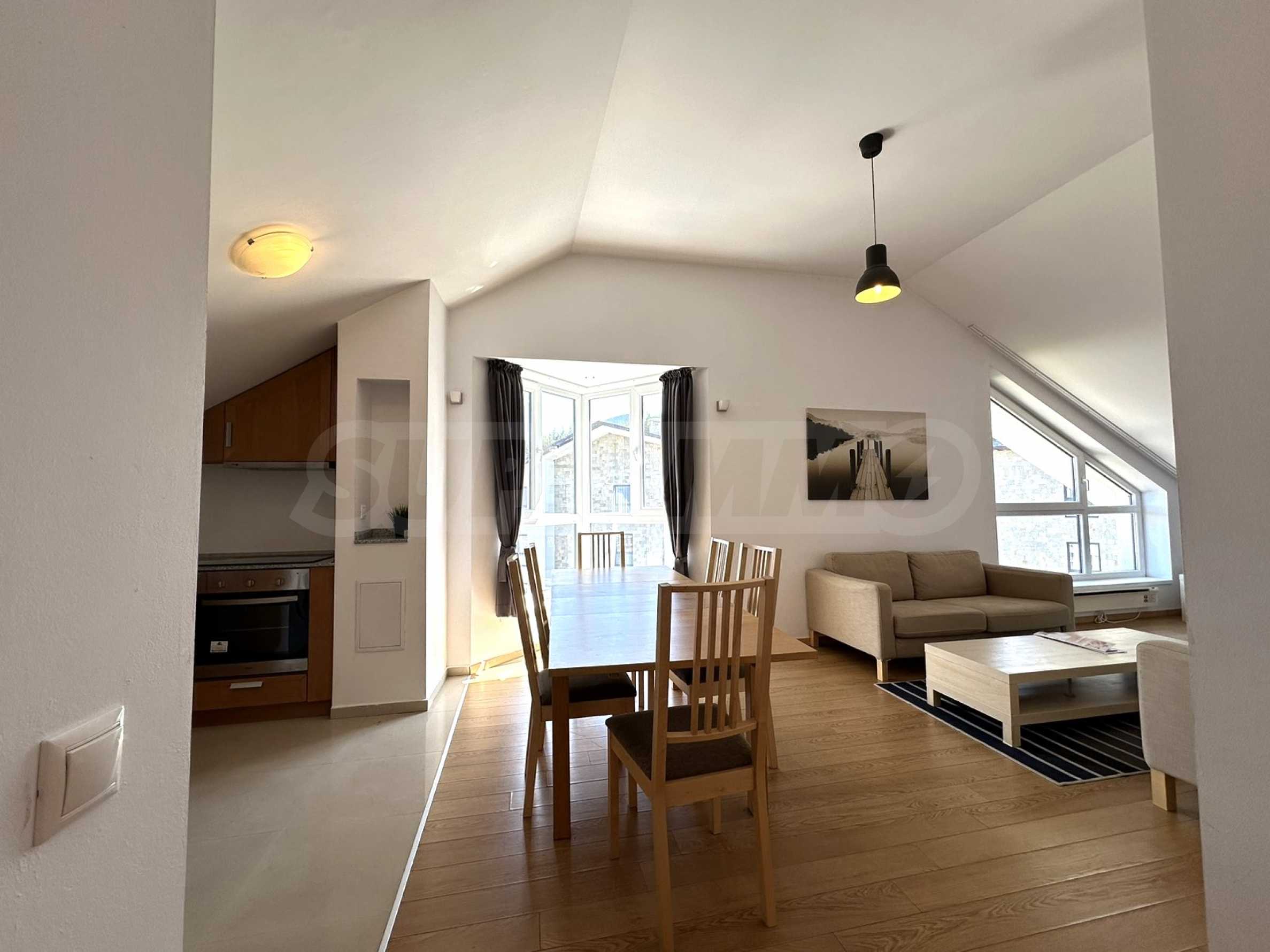 Жилището е с индивидуален дизайн, с голямо внимание към детайлите. В декорацията са използвани само най-висококачествените и естествени материали. Просторната всекидневна разполага с мека мебел и бяла кухня, която е напълно оборудвана с висок клас техника: фурна, котлони и хладилник.