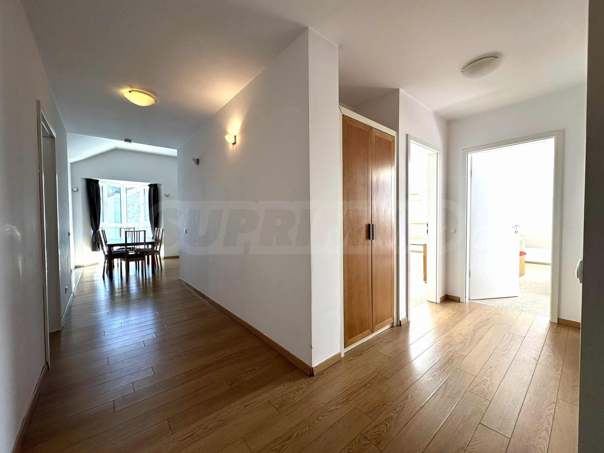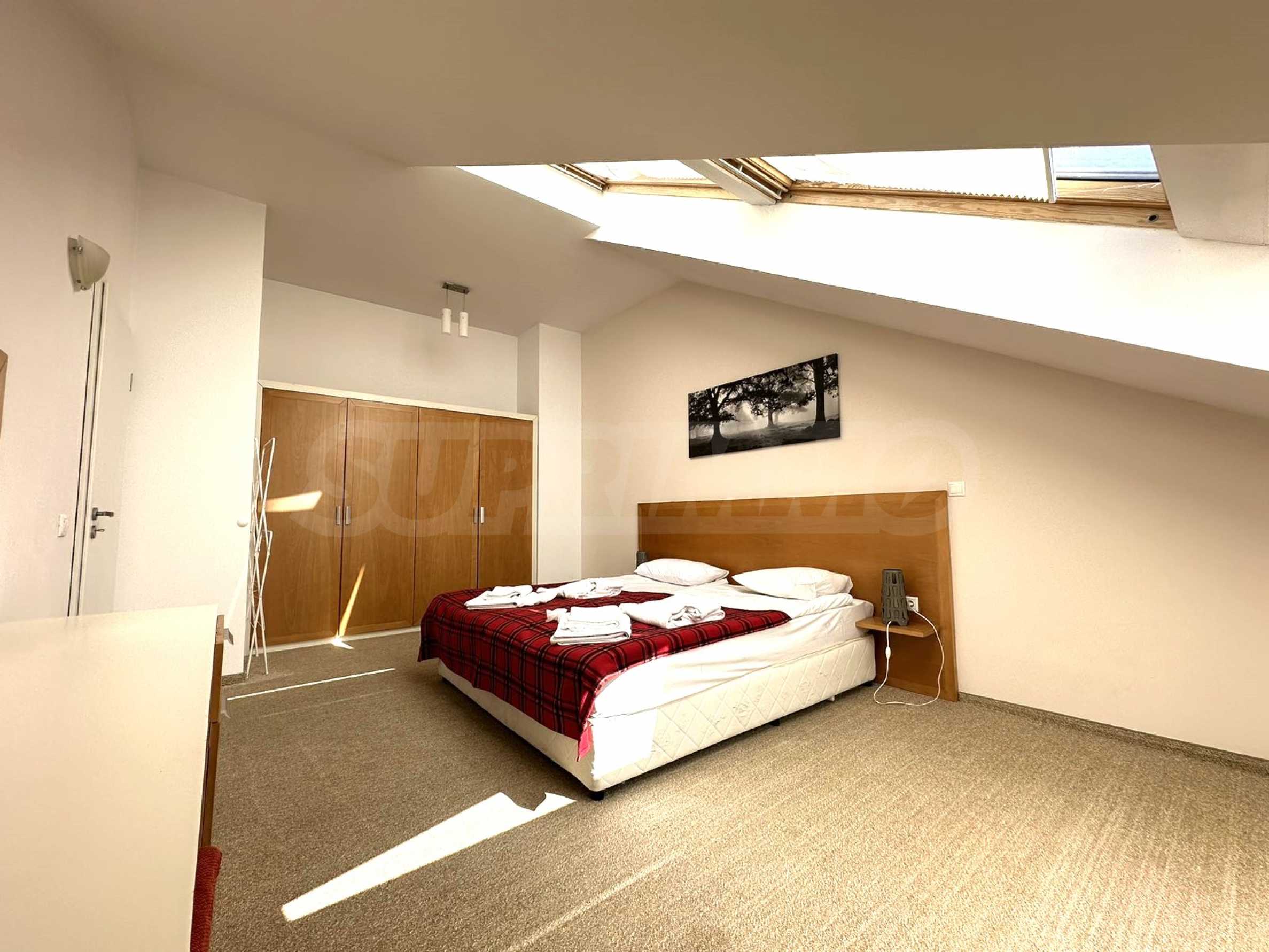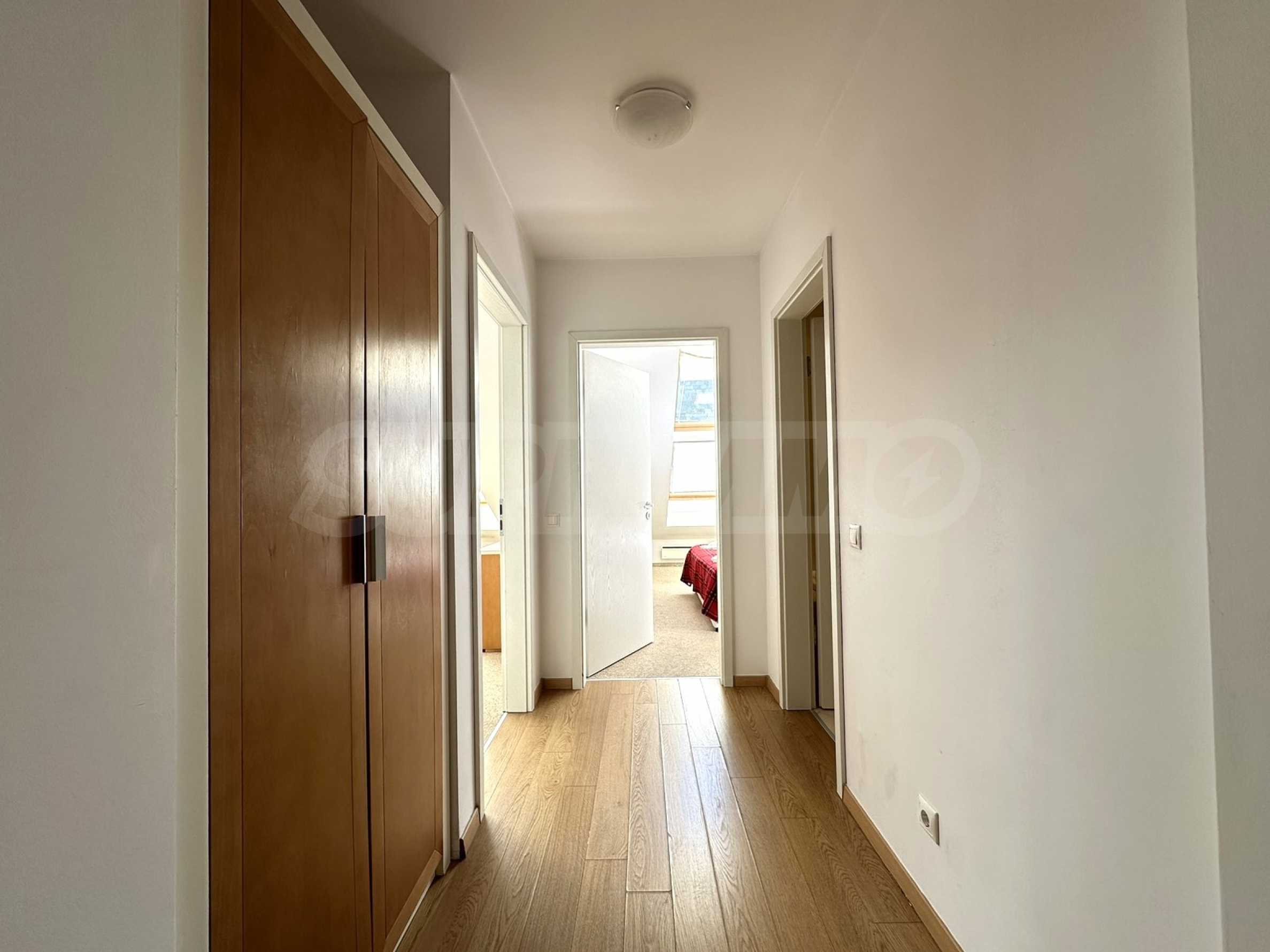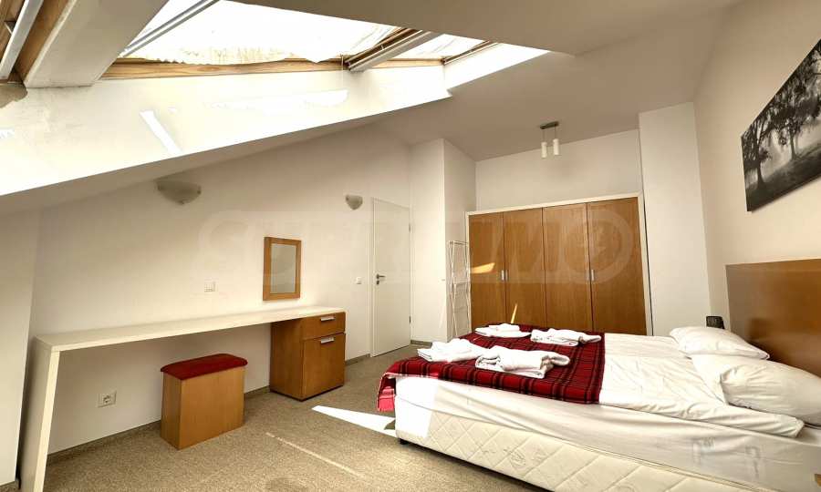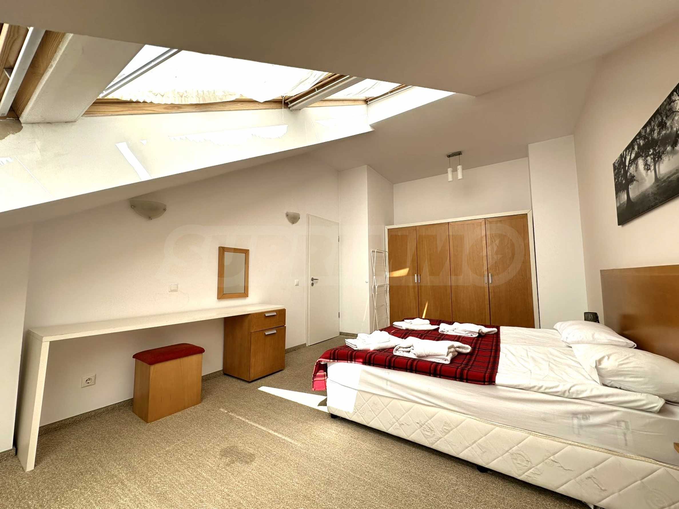 Жилището е с индивидуален дизайн, с голямо внимание към детайлите. В декорацията са използвани само най-висококачествените и естествени материали. Просторната всекидневна разполага с мека мебел и бяла кухня, която е напълно оборудвана с висок клас техника: фурна, котлони и хладилник.