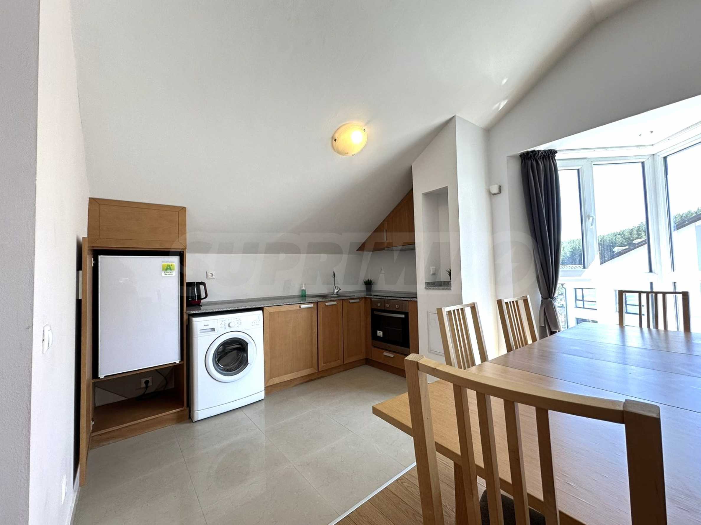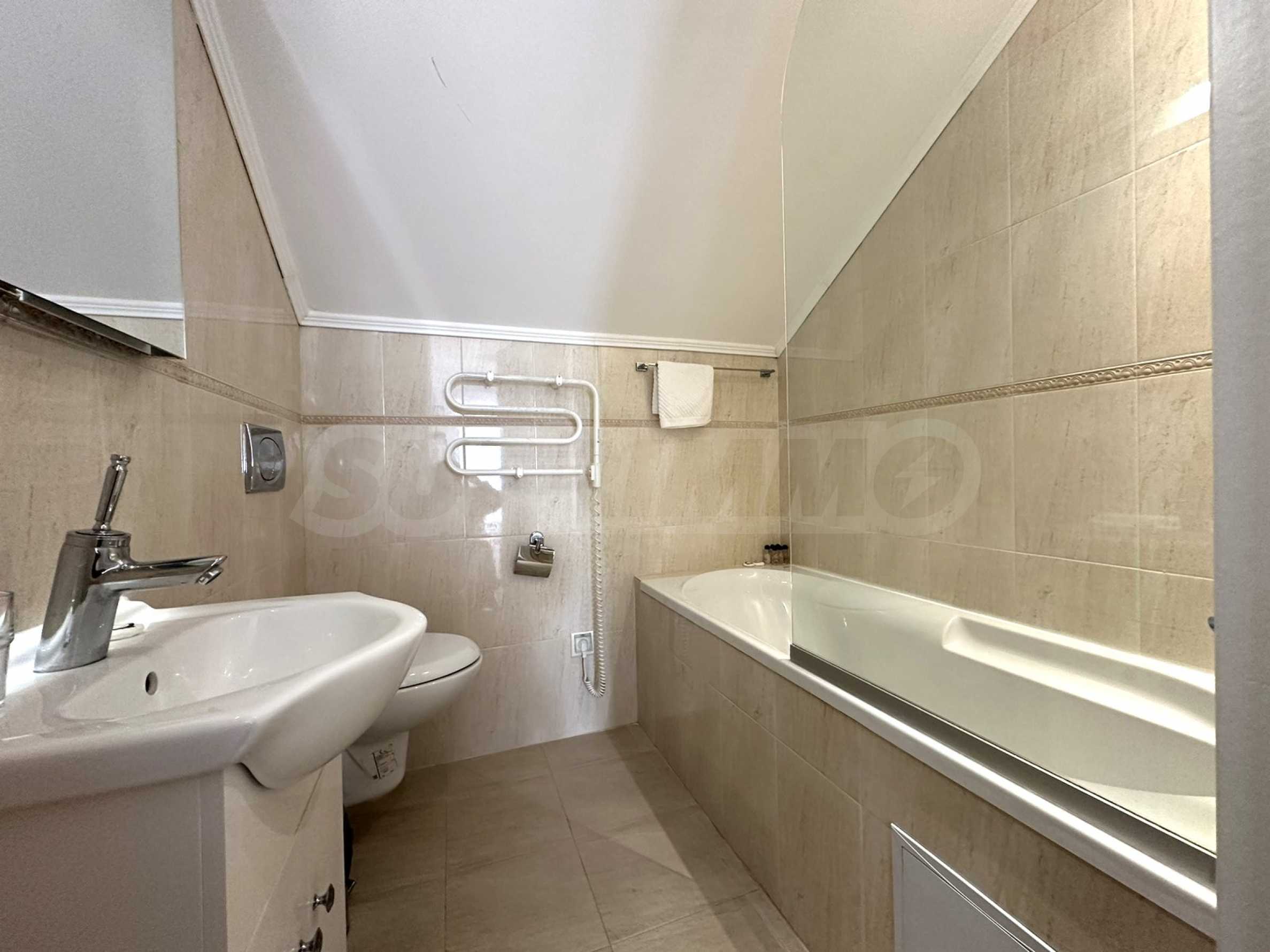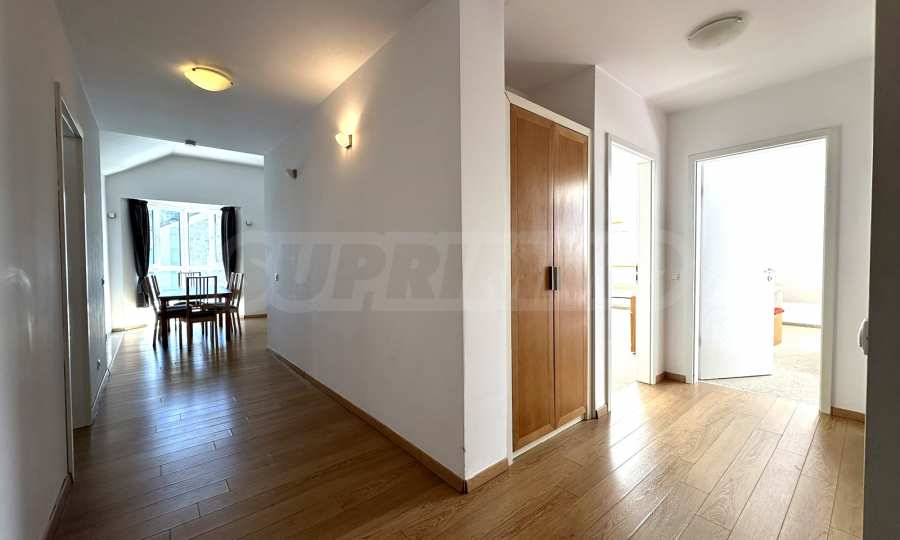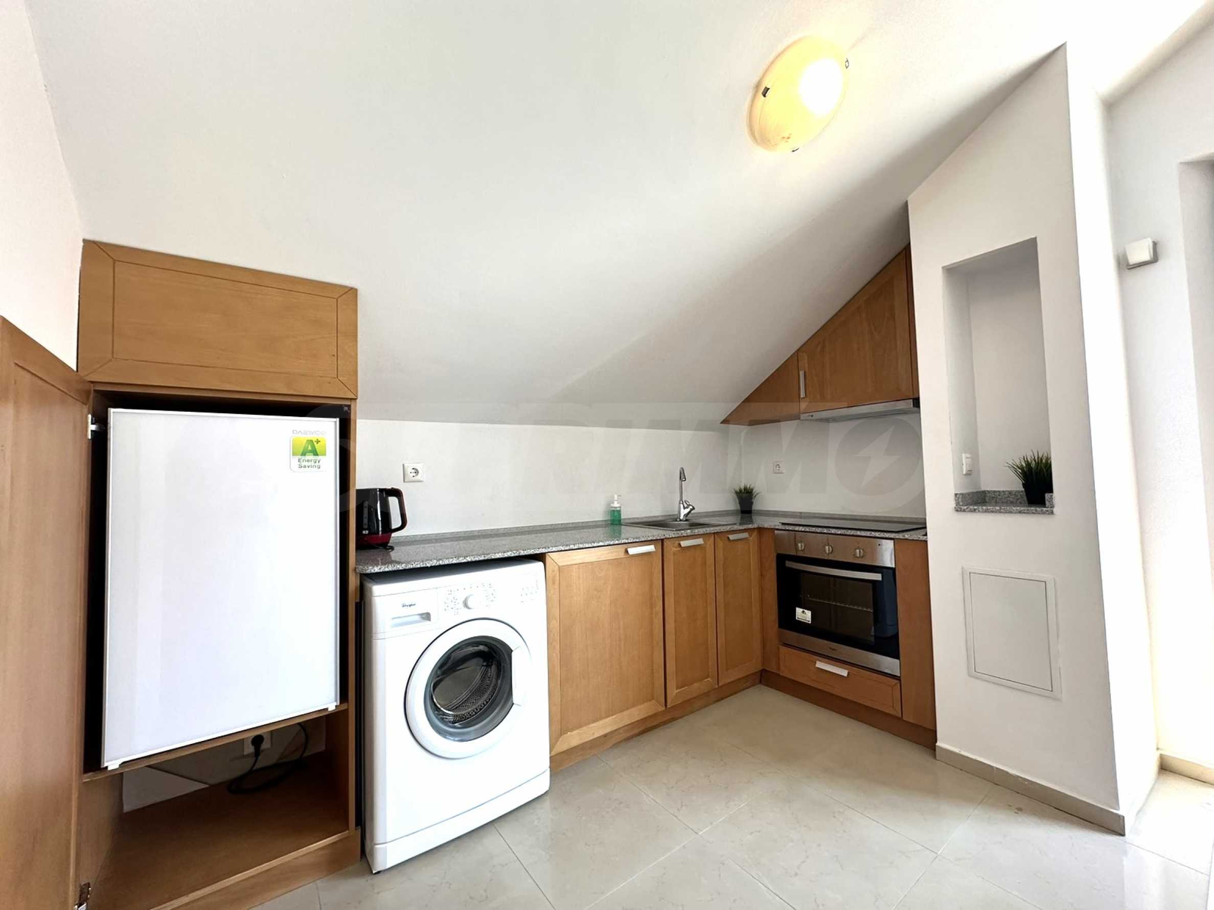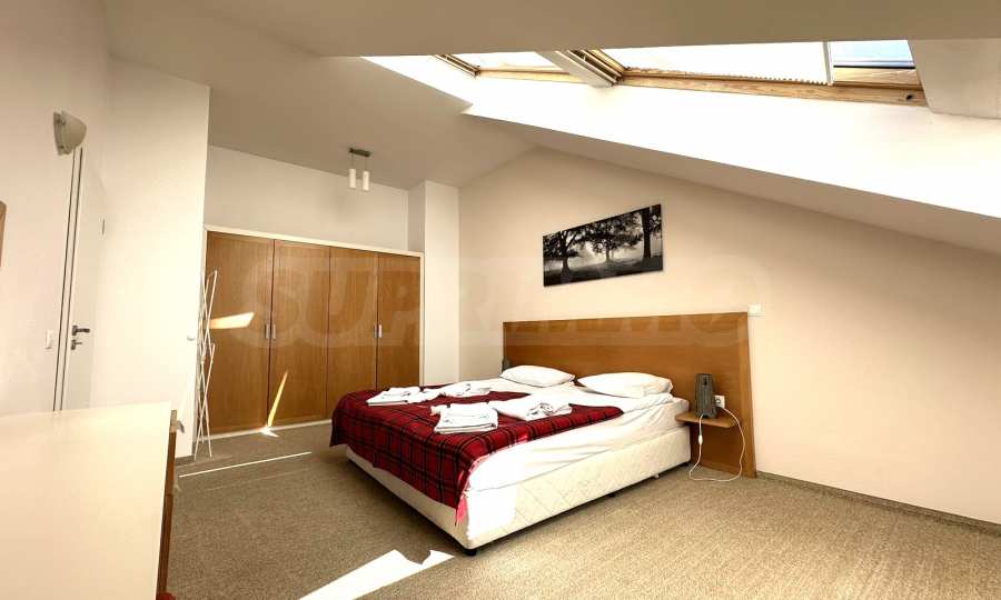 Жилището е с индивидуален дизайн, с голямо внимание към детайлите. В декорацията са използвани само най-висококачествените и естествени материали. Просторната всекидневна разполага с мека мебел и бяла кухня, която е напълно оборудвана с висок клас техника: фурна, котлони и хладилник.