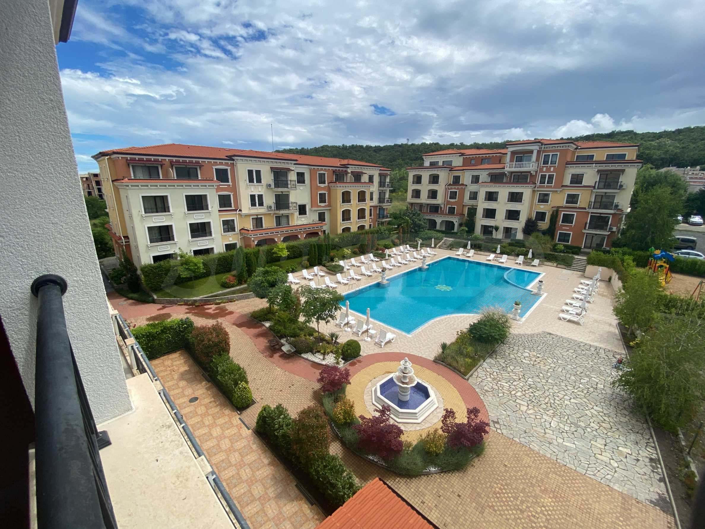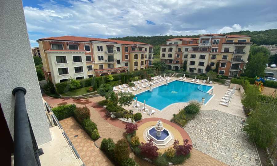 Апартаментът от 55.96 кв.м се намира на 4-ти етаж и има гледка към басейна.