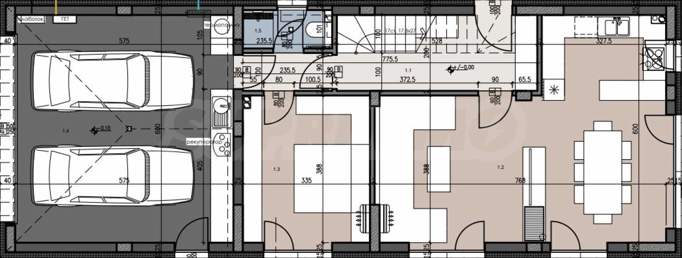 - първият етаж е 122 кв.м и се състои от антре, дневна, спалня, баня с тоалетна и гараж с техническо помещение;