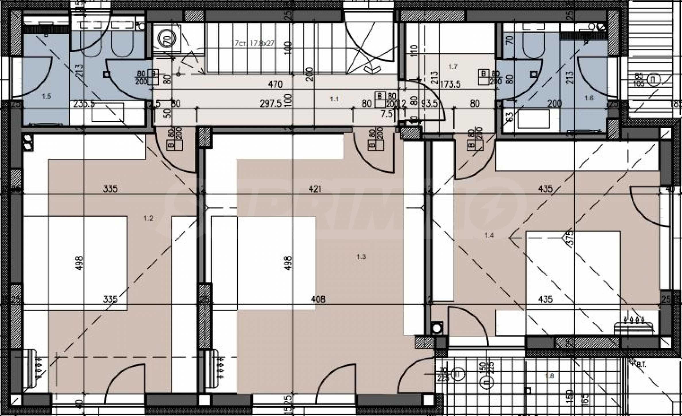- вторият етаж е 101 кв.м и разполага с коридор, три спални, две бани с тоалетна, килер и тераса.