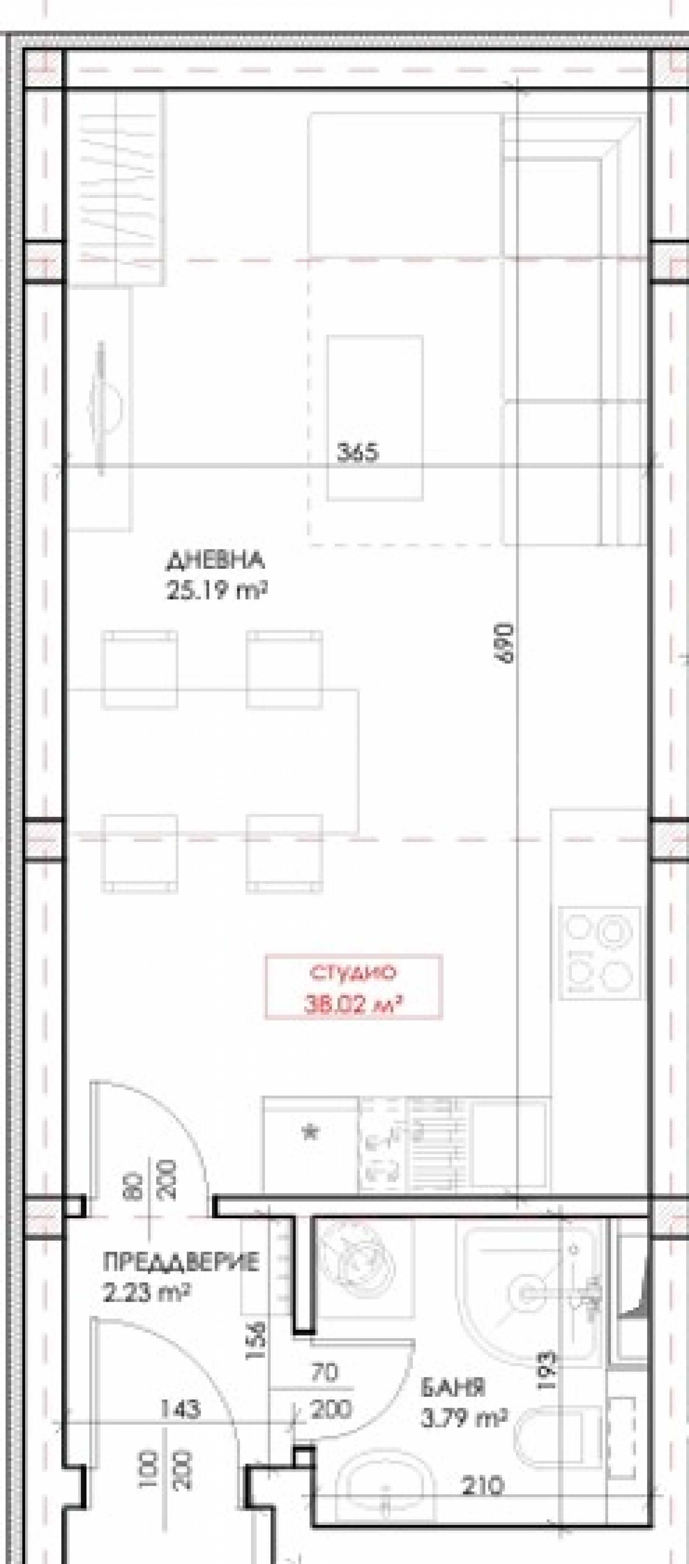 Имотът е с обща площ от 38,21 кв.м, разположен на партерен етаж с гледка към града и морето. Състои се от антре, дневна и баня с тоалетна, издава се в степен на завършеност по БДС, на шпакловка и замазка.
