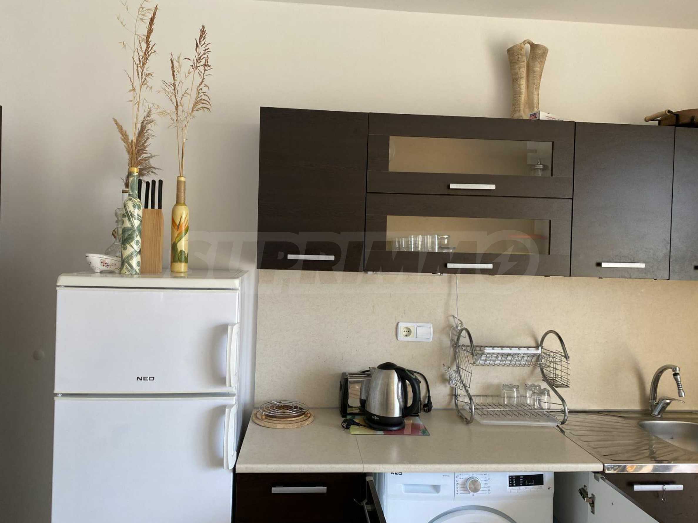Дневната е обзаведена с ъглов диван, холна гарнитура, маса за хранене със столове и телевизор. Кухнята е напълно оборудвана, с хладилник, котлони и аспиратор.