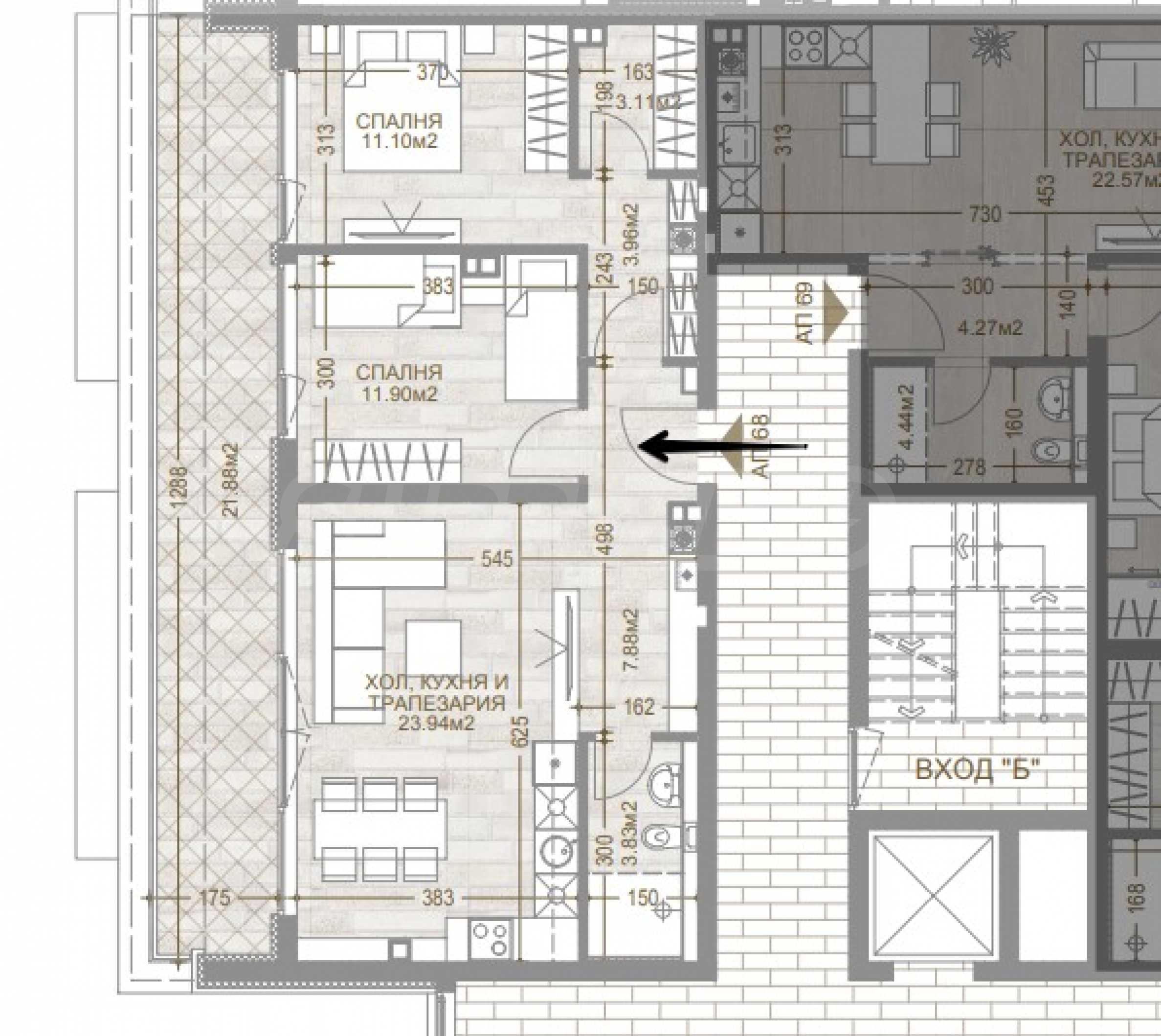 - хол с кухня и трапезария и тераса, с излаз от всички стаи.