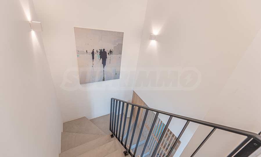 На първия етаж ще откриете просторна кухня, и уютен хол с камина, създаващ уникална атмосфера на топлина и уют. Допълнително, за удобство на този етаж има и баня за гости.