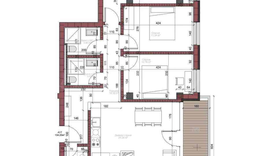 В апартамента има общо три спални и две бани.