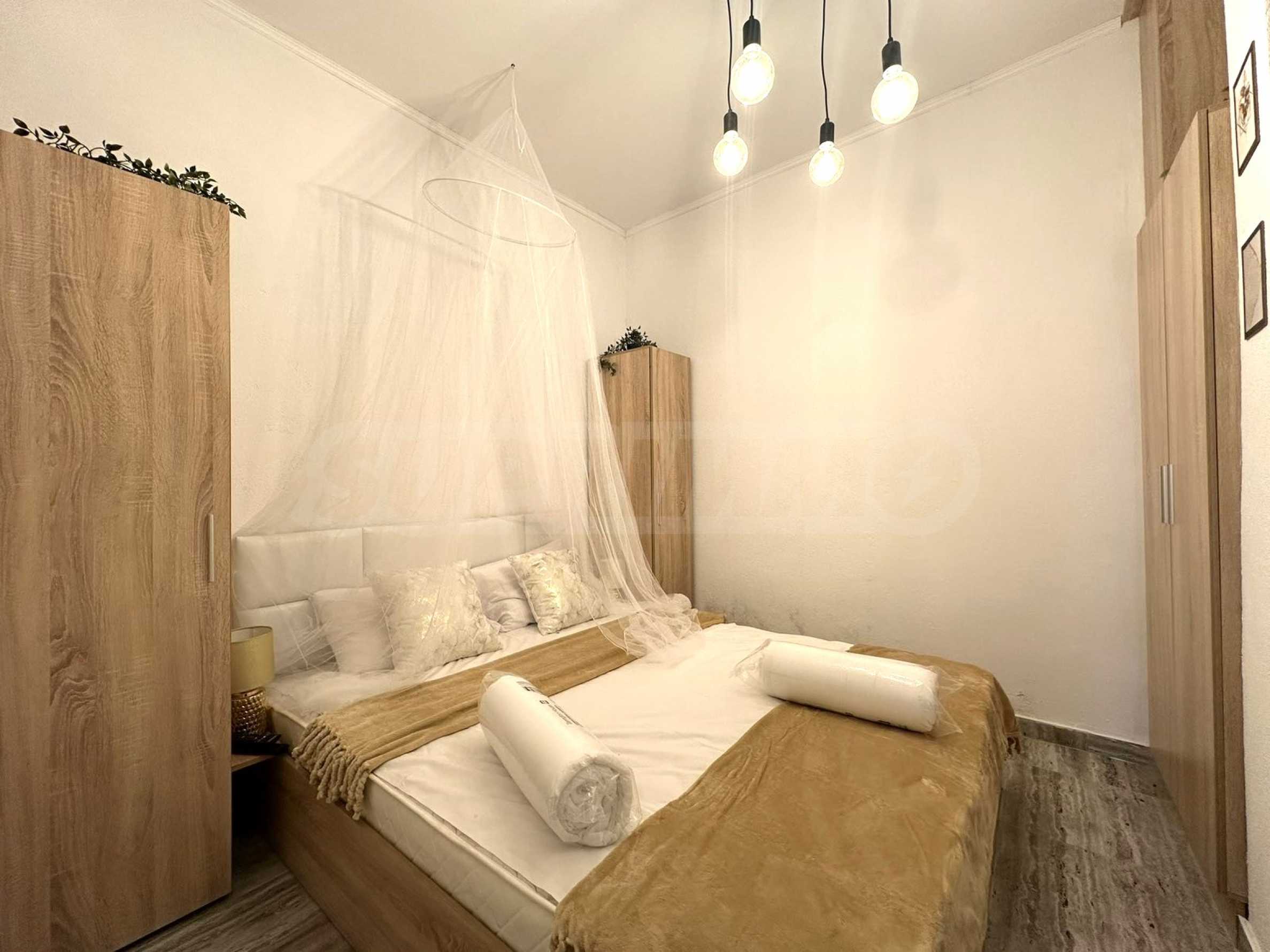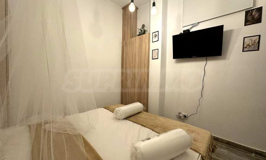 Ситуиран от: Дневна с диван, холна маса, маса за хранене, ТВ шкаф и телевизор, обособен кухненски бокс с печка, хладилник, кафемашина и кана за вода, просторна баня душ кабина и тоалетна, спалня, гардероб, ТВ шкаф;