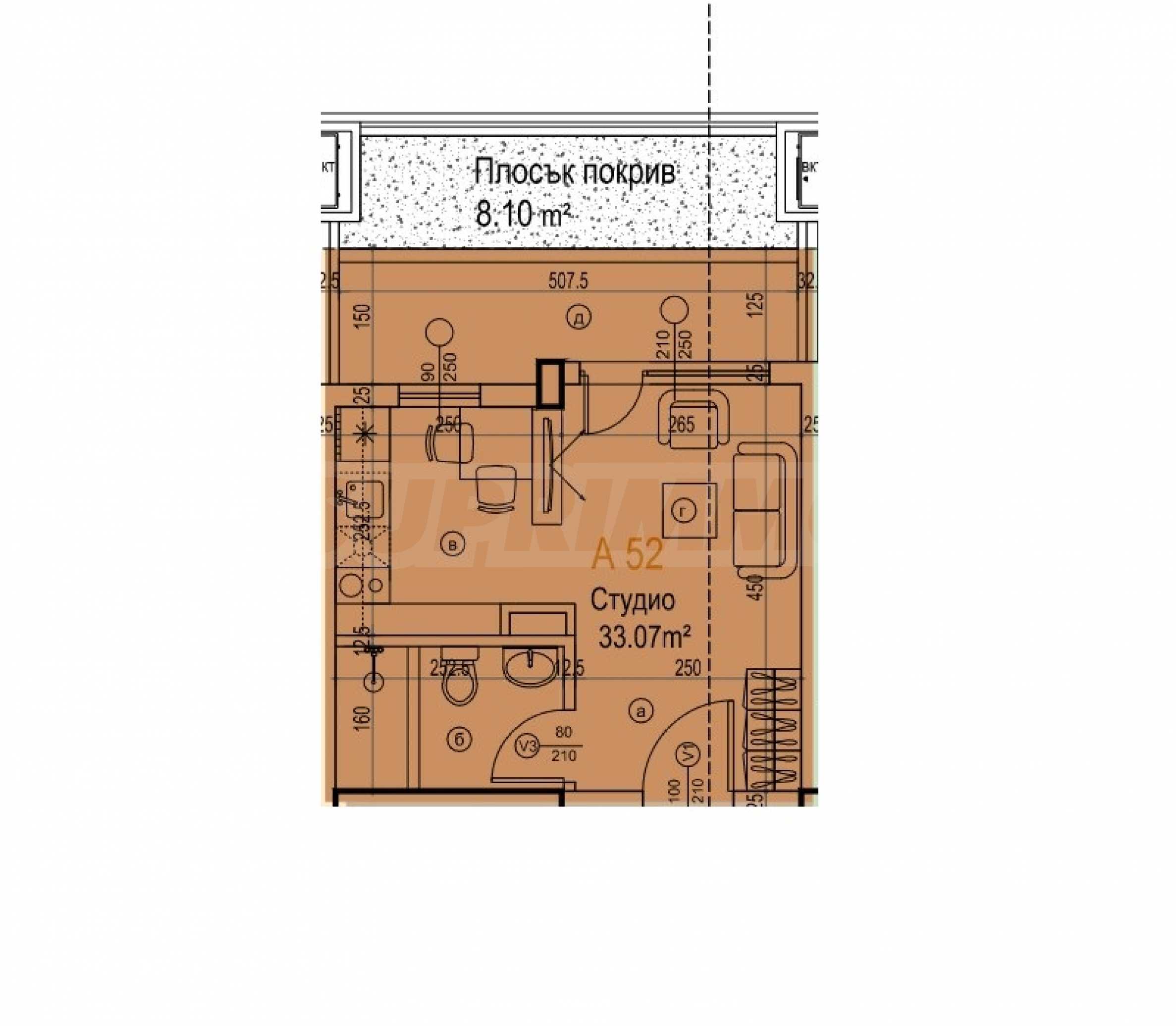 Жилището е на пети етаж и предлага обща площ 45.50 кв.м, от които 33.08 кв.м чиста площ, 4.33 кв.м общи части и 8.10 кв. тераса.