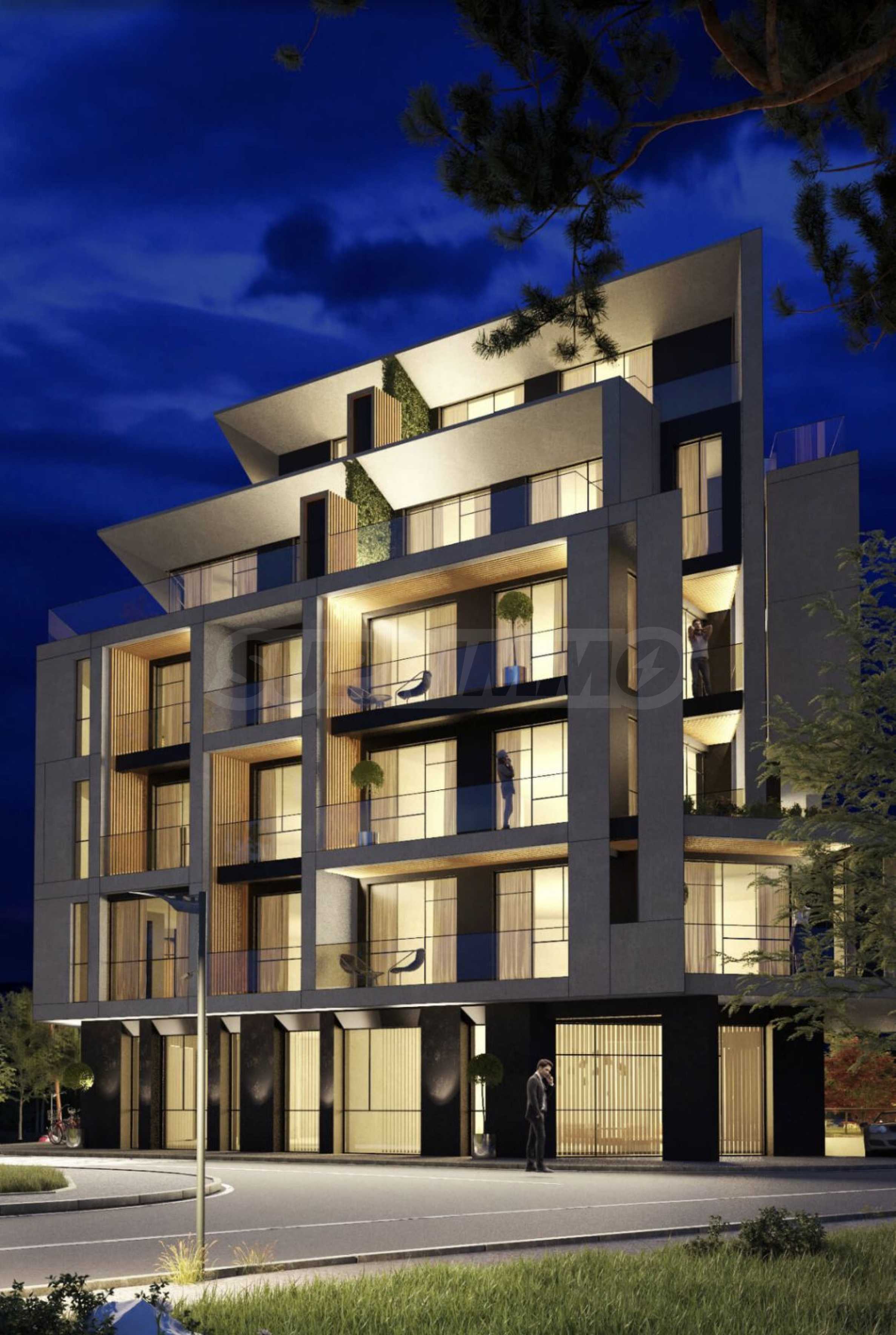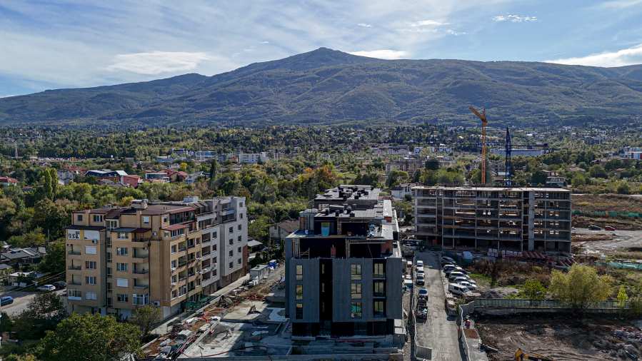 Сградата впечатлява с елегантен дизайн с изчистени линии, комбинация от травертин и дърво, и френски прозорци, които не само гарантират изобилие от естествена светлина, но и откриват гледки към Витоша и зелените площи около комплекса. На разположение на собствениците ще има богато озеленен двор с алеи за разходки и места за отдих, оформени с висока и ниска растителност и водни ефекти, както и ограничен достъп за повече сигурност и спокойствие. Паркирането е решено с подземни паркоместа, а на ниво партер ще се помещава голям супермаркет.