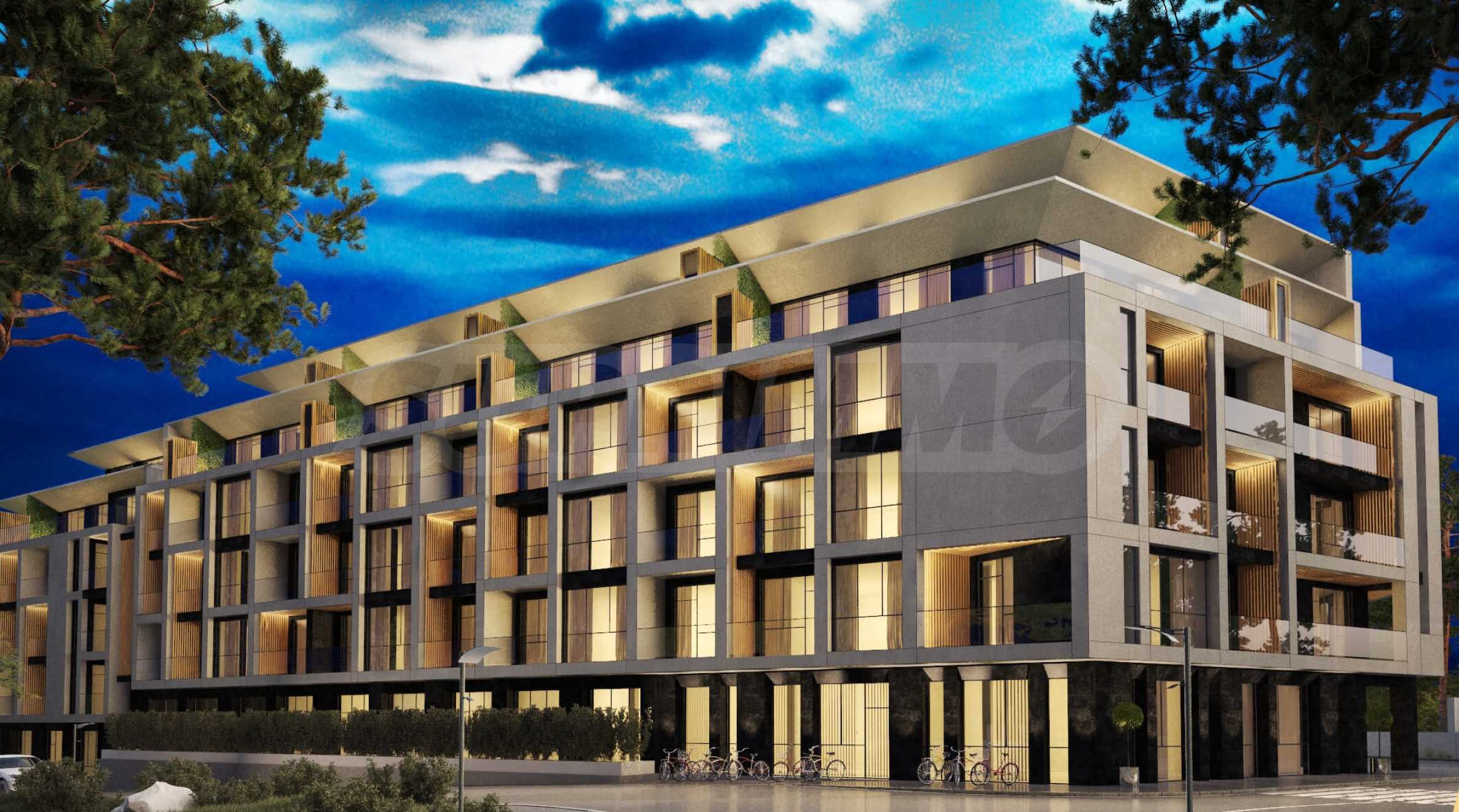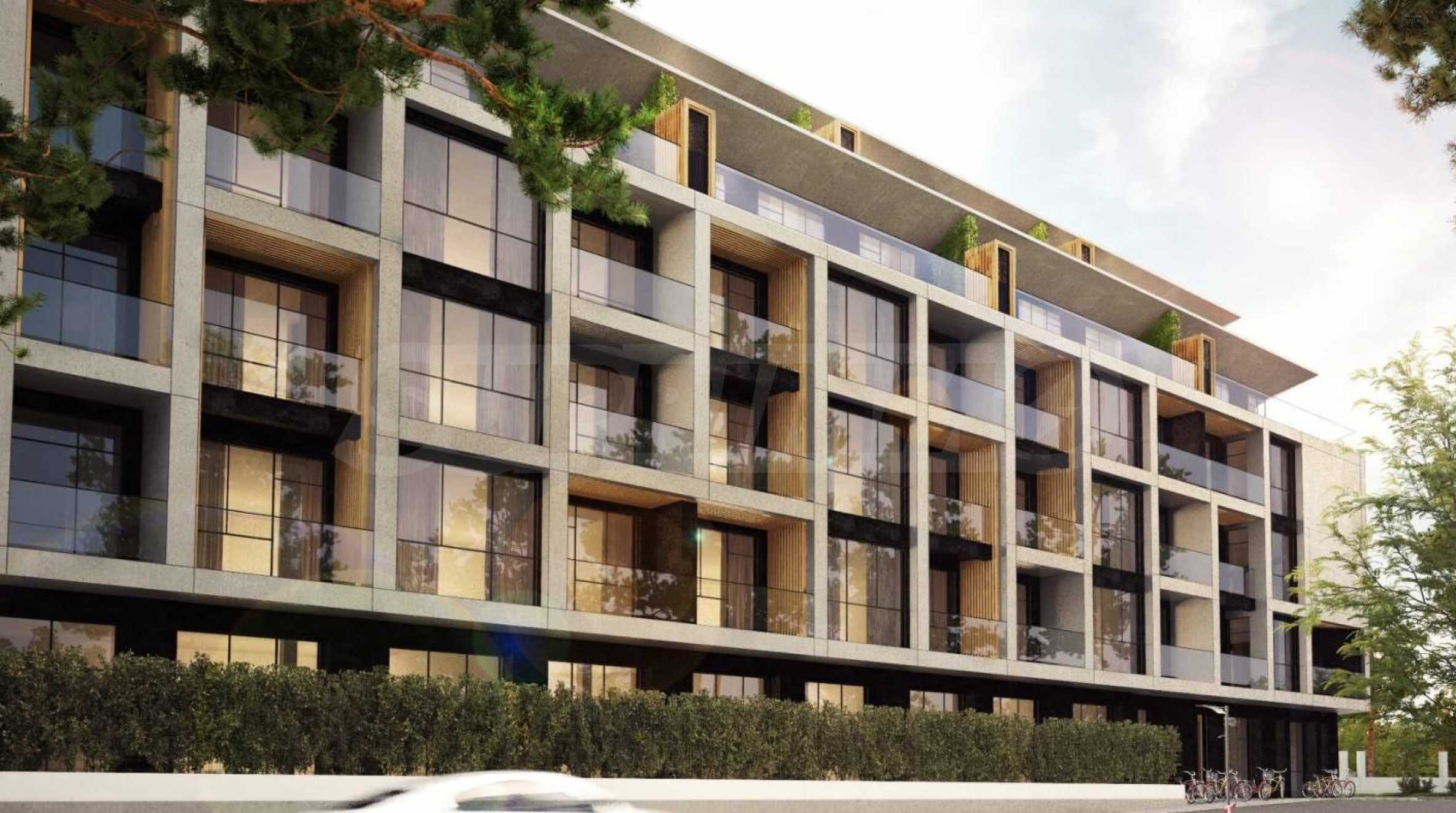 Сградата впечатлява с елегантен дизайн с изчистени линии, комбинация от травертин и дърво, и френски прозорци, които не само гарантират изобилие от естествена светлина, но и откриват гледки към Витоша и зелените площи около комплекса. На разположение на собствениците ще има богато озеленен двор с алеи за разходки и места за отдих, оформени с висока и ниска растителност и водни ефекти, както и ограничен достъп за повече сигурност и спокойствие. Паркирането е решено с подземни паркоместа, а на ниво партер ще се помещава голям супермаркет.