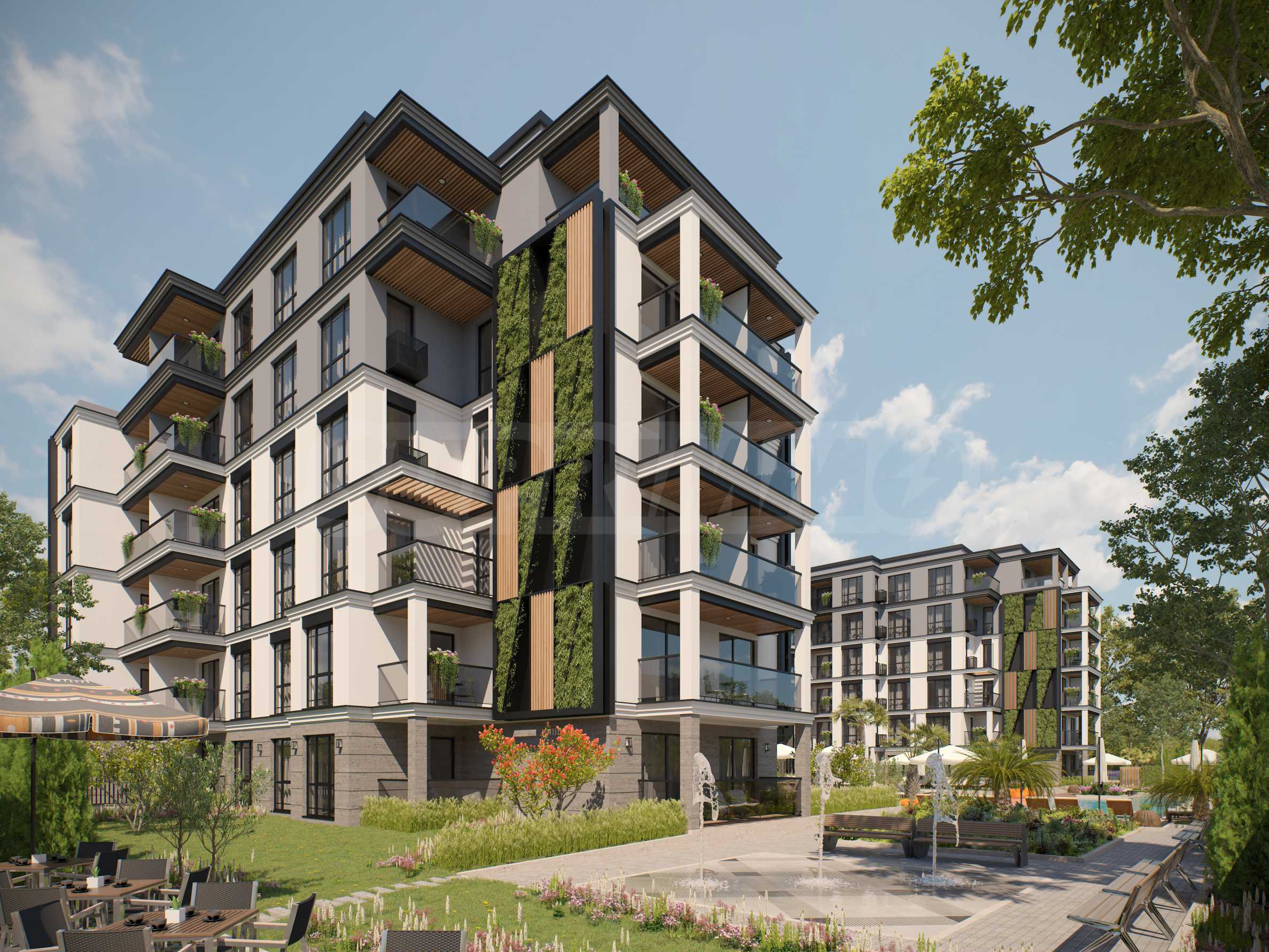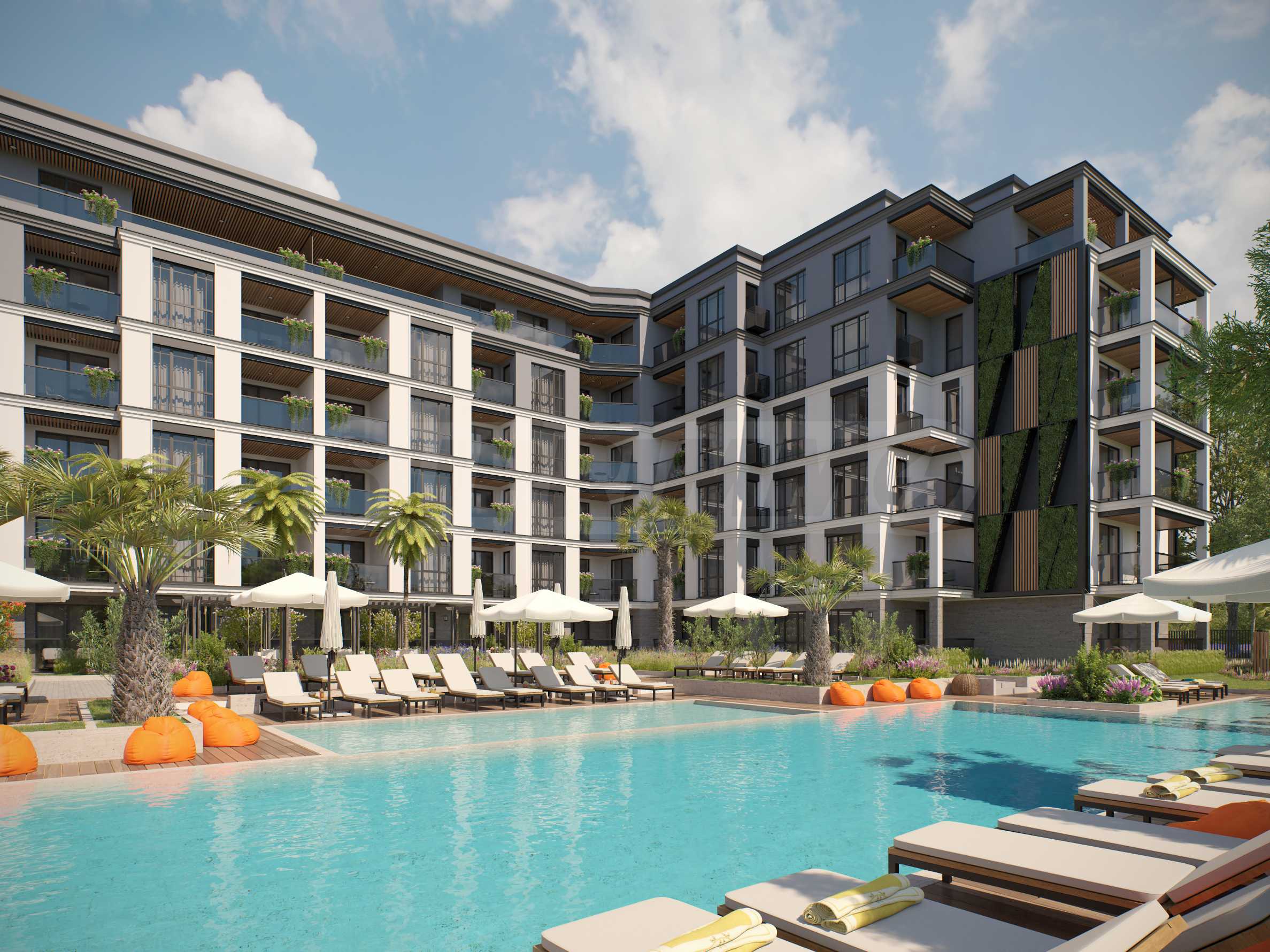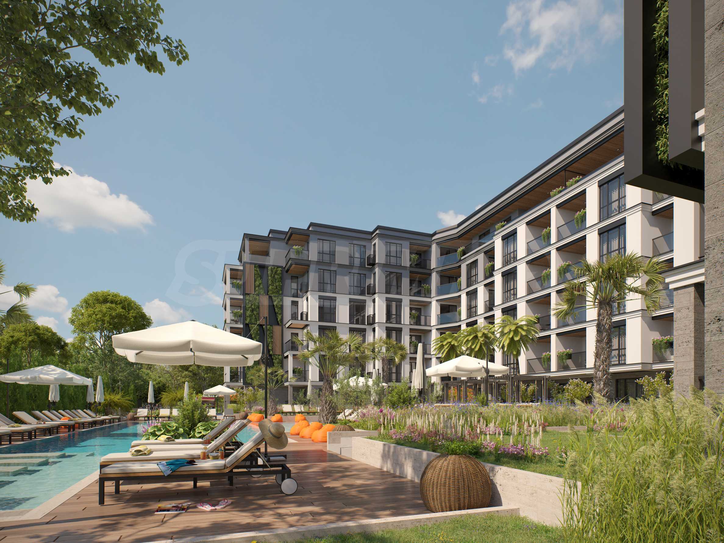 Външната рецепция ще свързва Сгради 2 и 3 и ще обслужва менажирането на комплекса и отдаване на апартаментите под наем за клиентите, които са избрали да закупят имота си с инвестиционна цел. Всяка от двете сгради ще се състои от 31 бр. апартаменти, разпределени на 6 етажа. В централната част на комплекса ще бъде разположен басейн за възрастни в азиатски стил, заобиколен от екзотични растения, създаващи усещането за спокойствие в райско кътче!