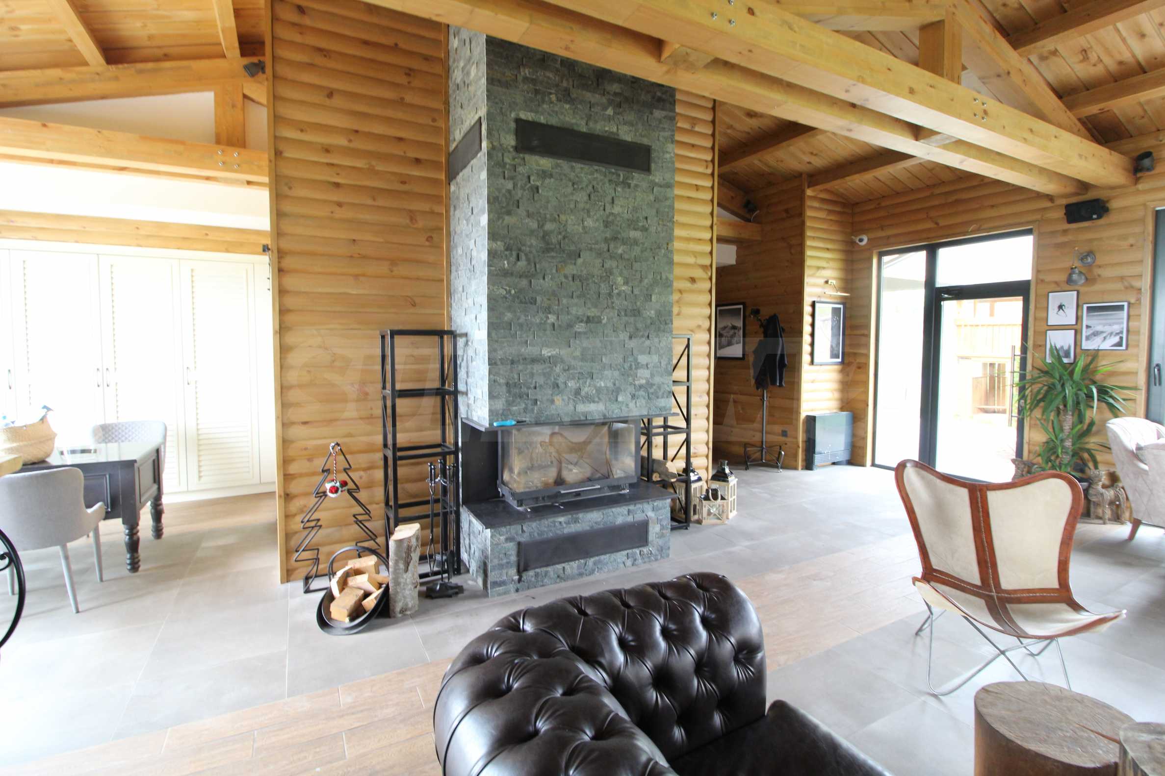 Светъл дневен тракт с удобни мебели, плоскоекранен телевизор и панорамни прозорци;