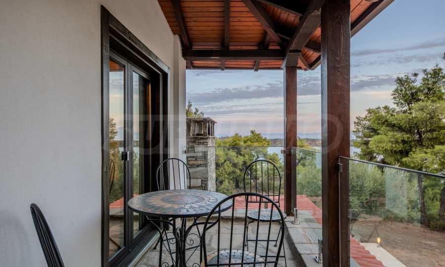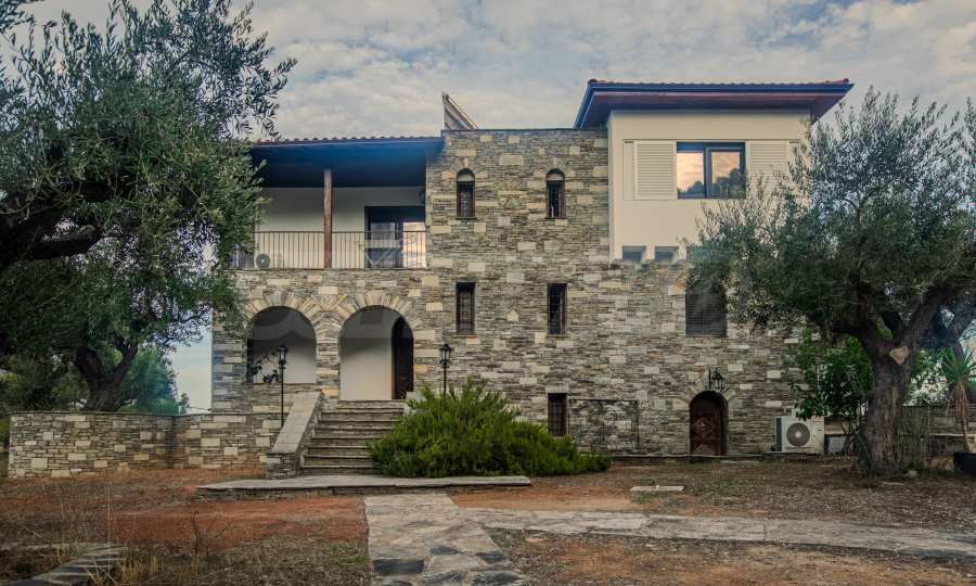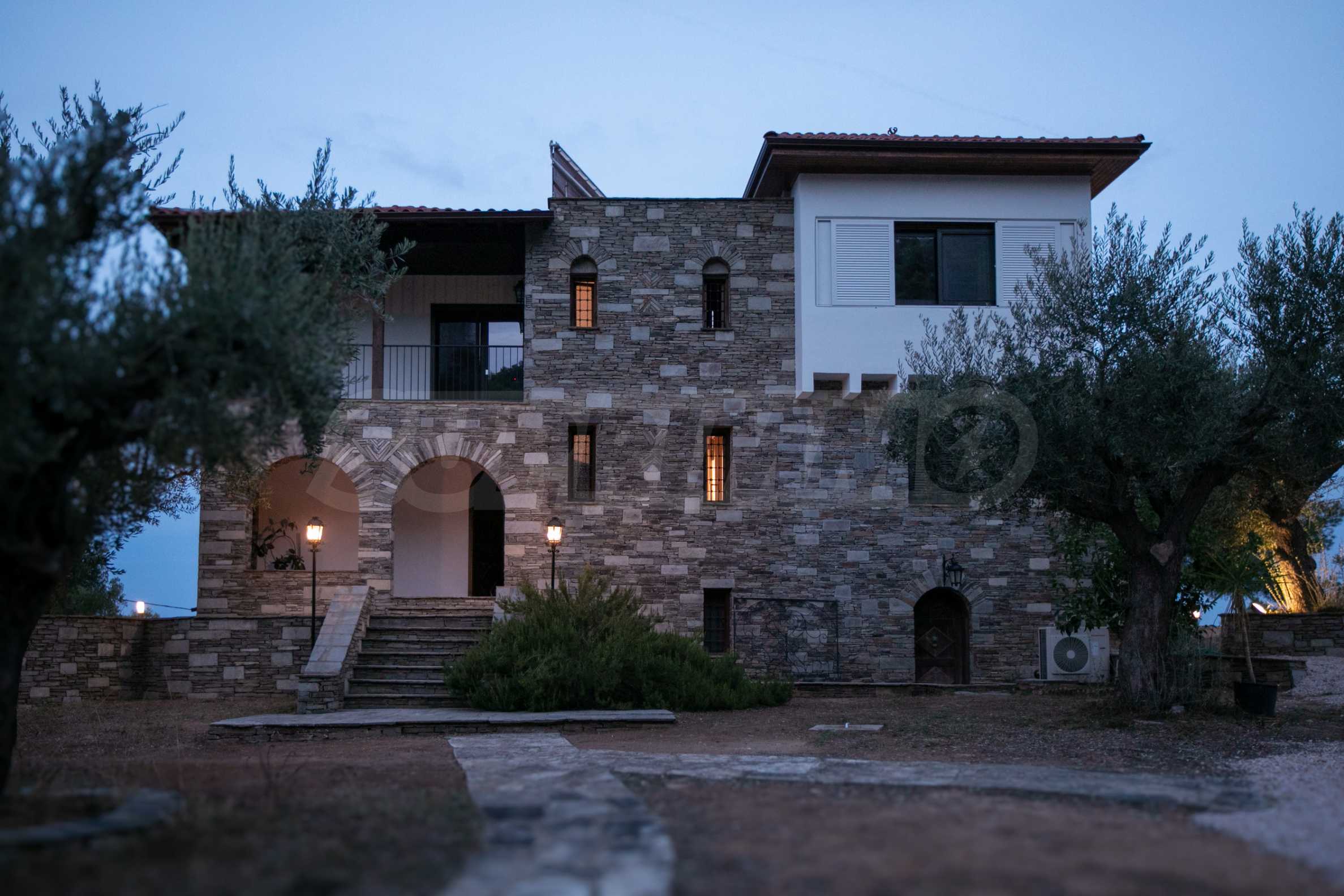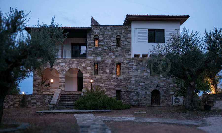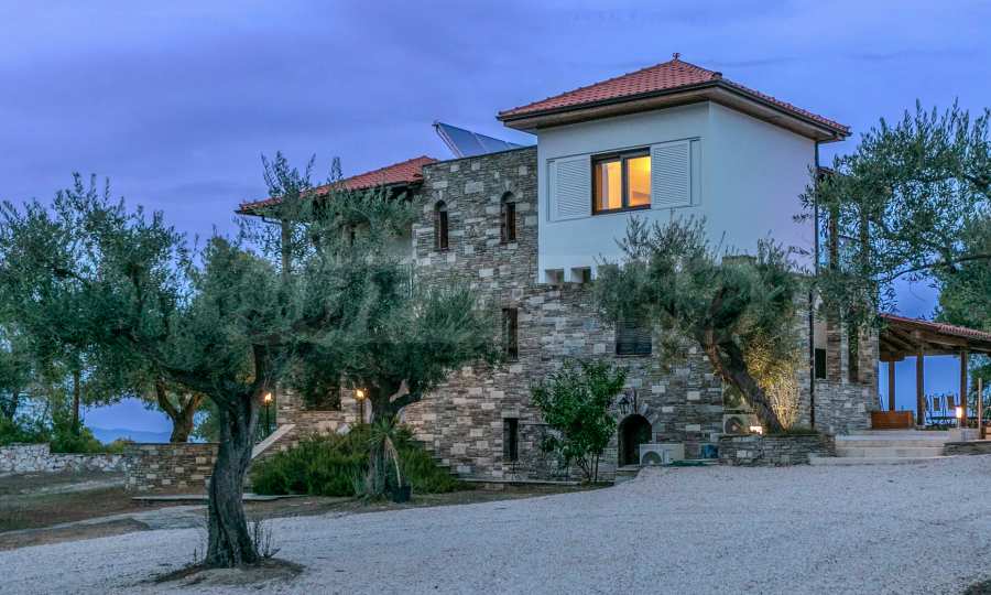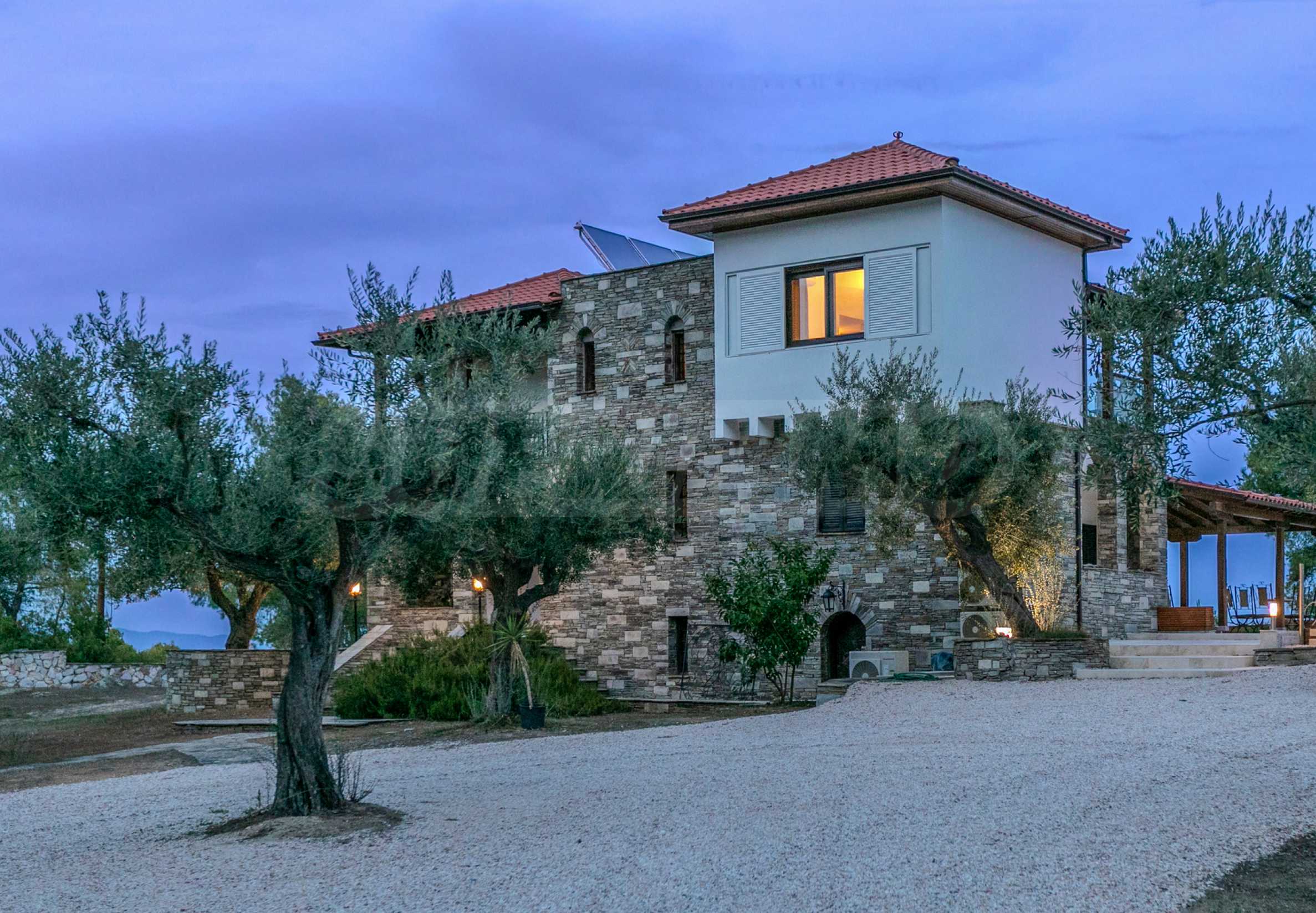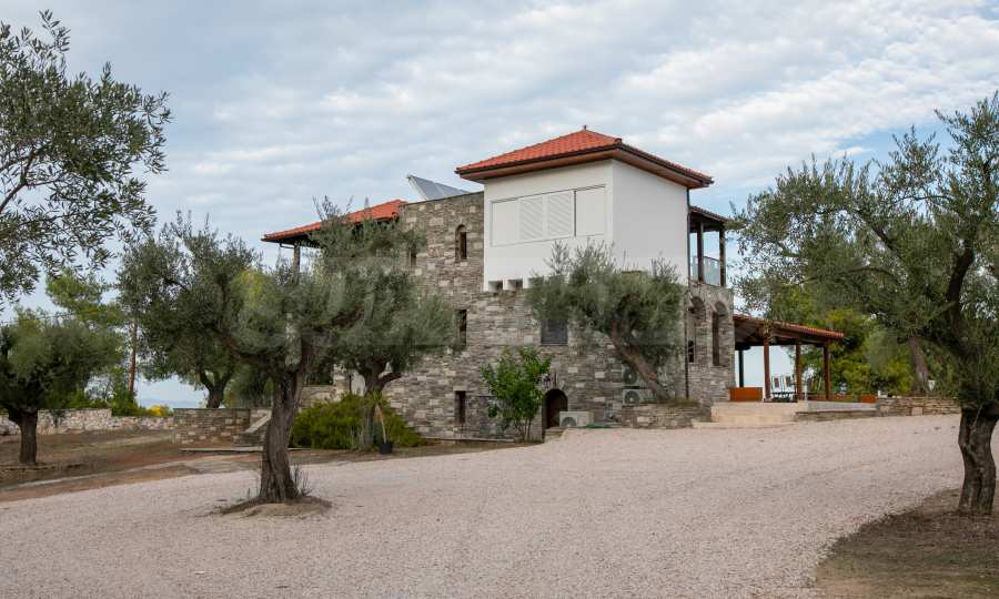 Величествената, изцяло реновирана вила се извисява над кристалночистите води на Егейско море и предлага зашеметяващи изгледи, и пейзажи простиращи се над о-в Диапорос до свещената планина на Атон/Света Гора.