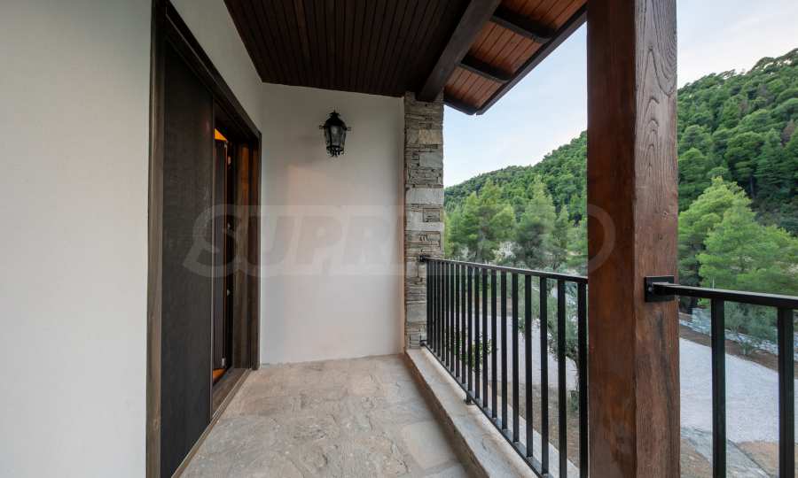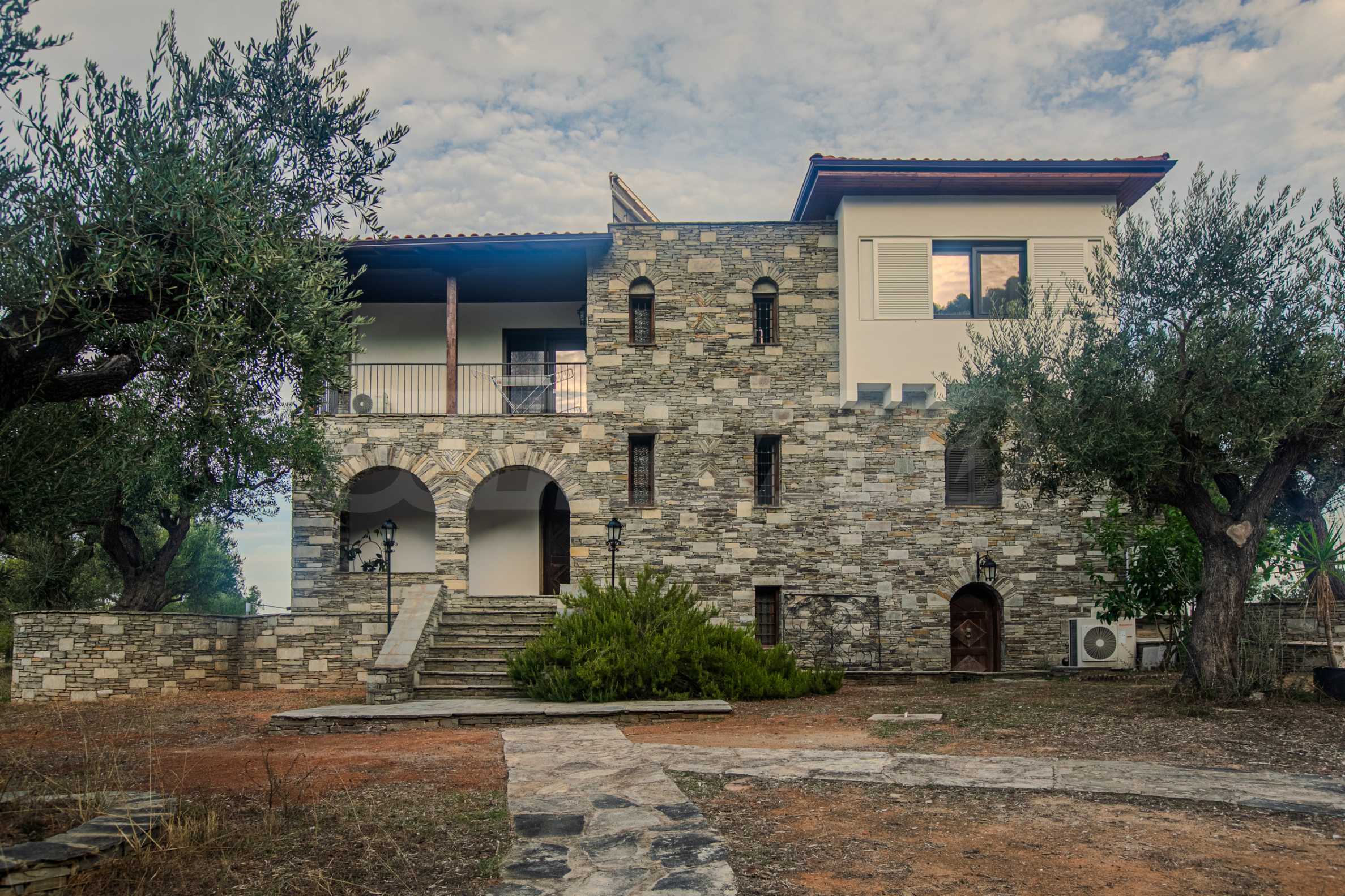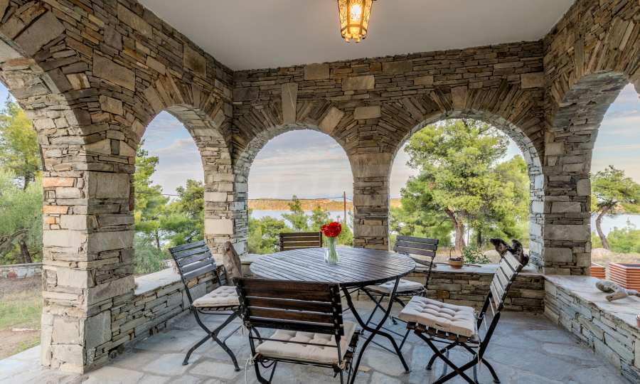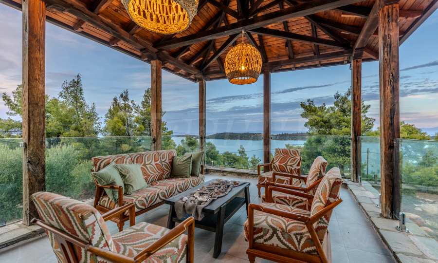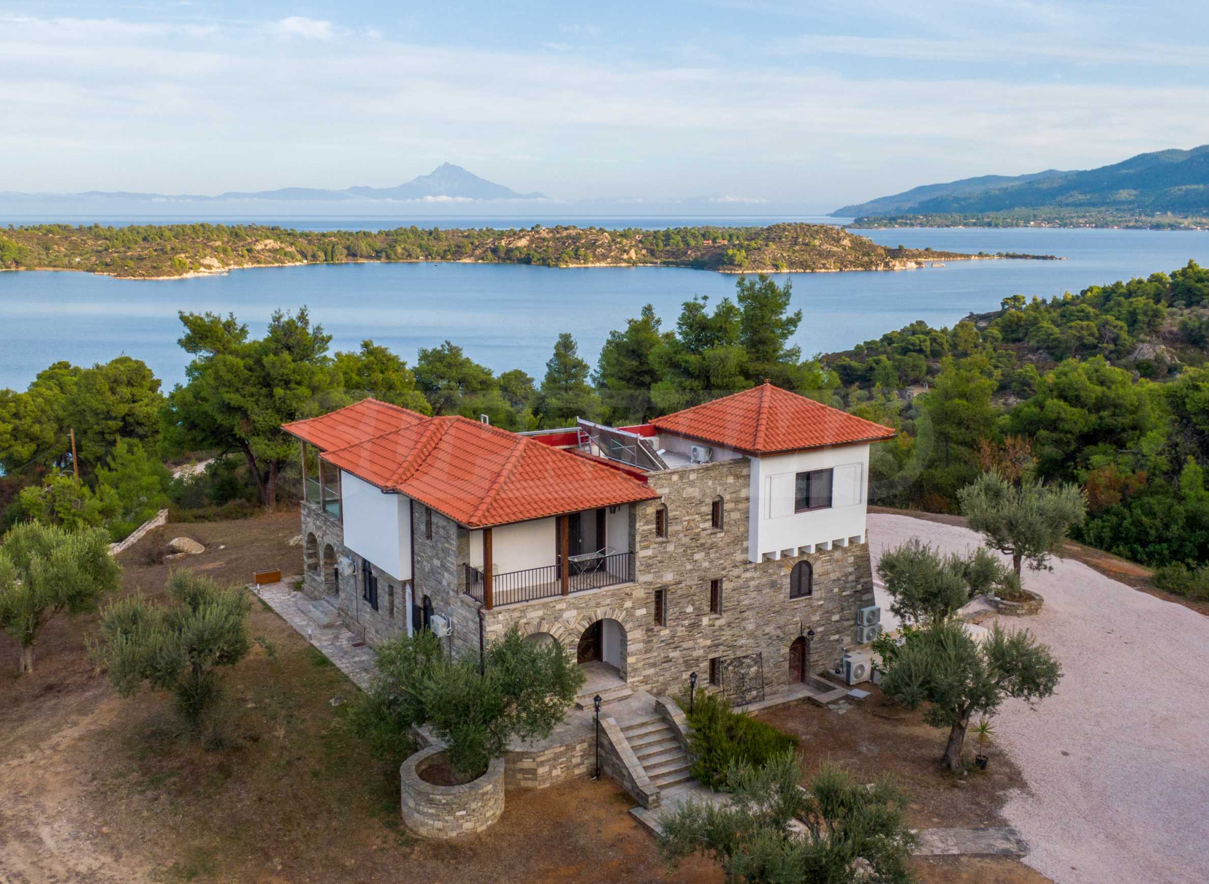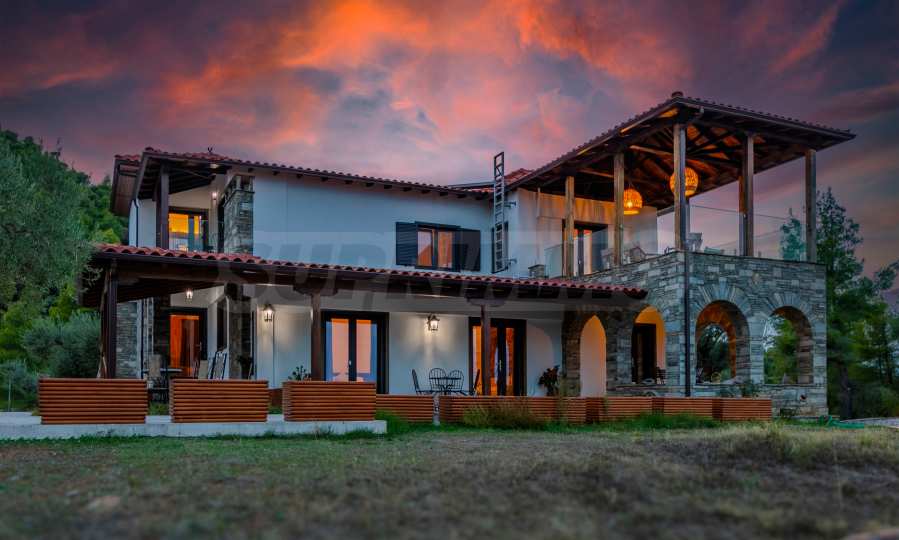 Величествената, изцяло реновирана вила се извисява над кристалночистите води на Егейско море и предлага зашеметяващи изгледи, и пейзажи простиращи се над о-в Диапорос до свещената планина на Атон/Света Гора.