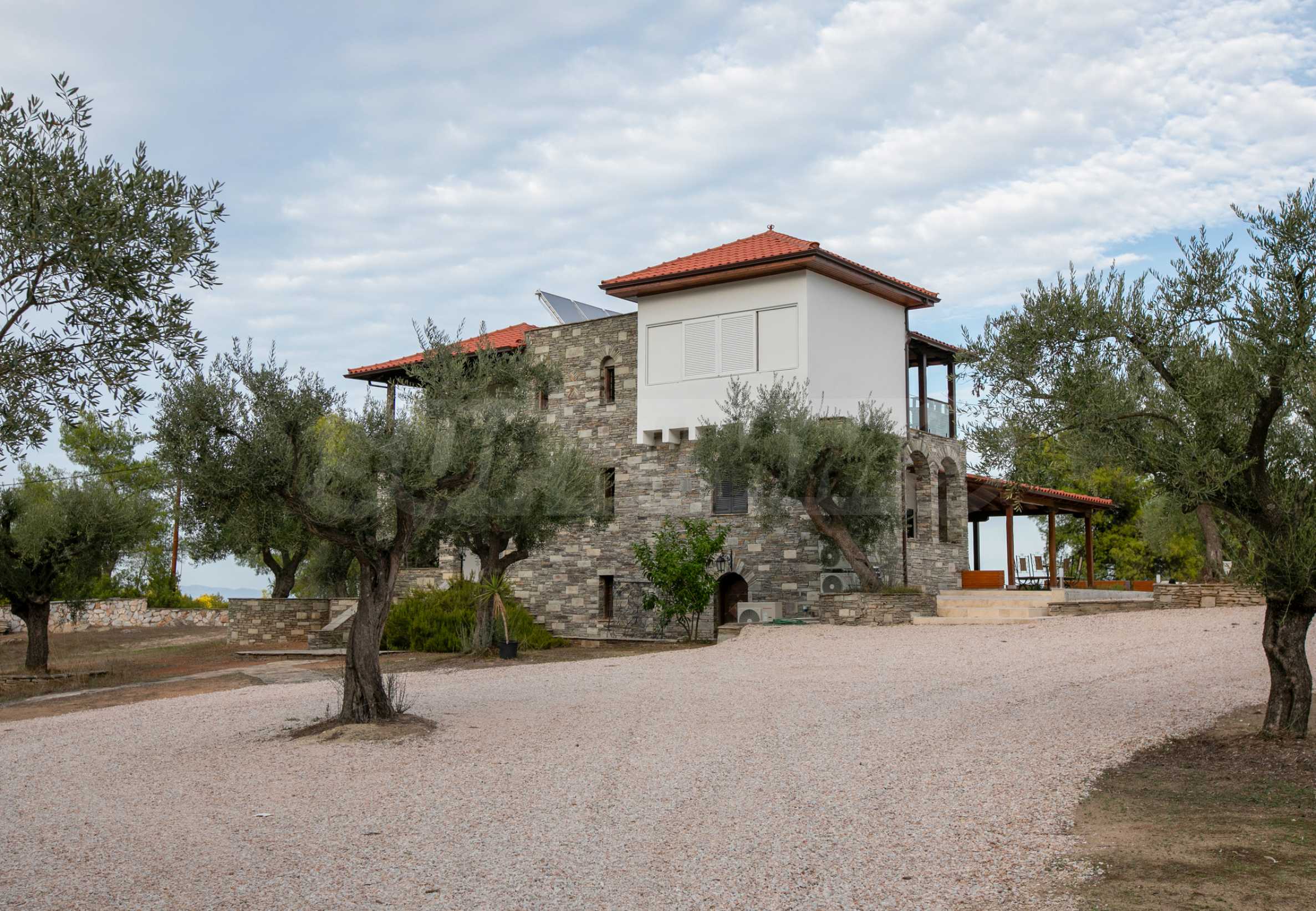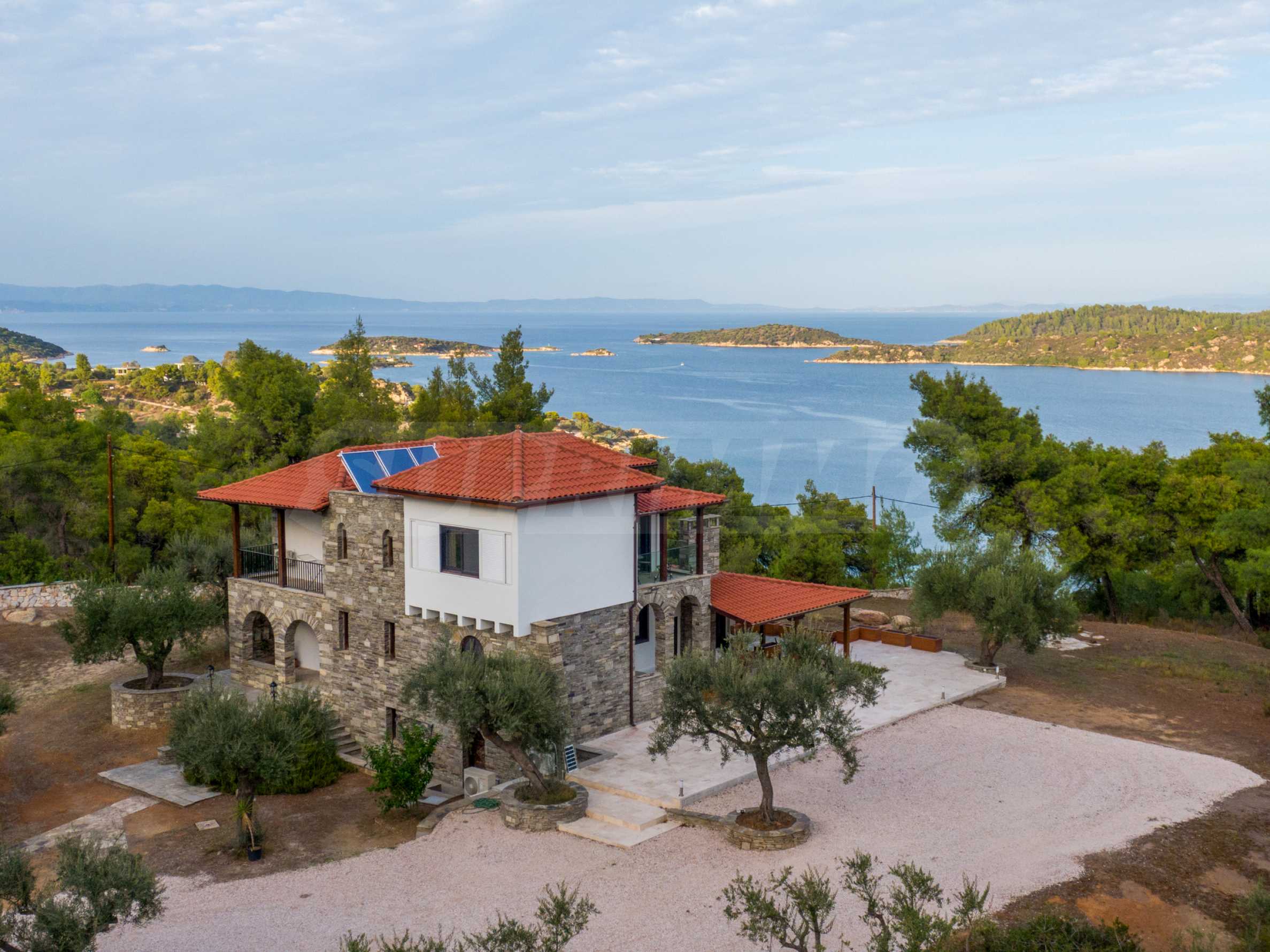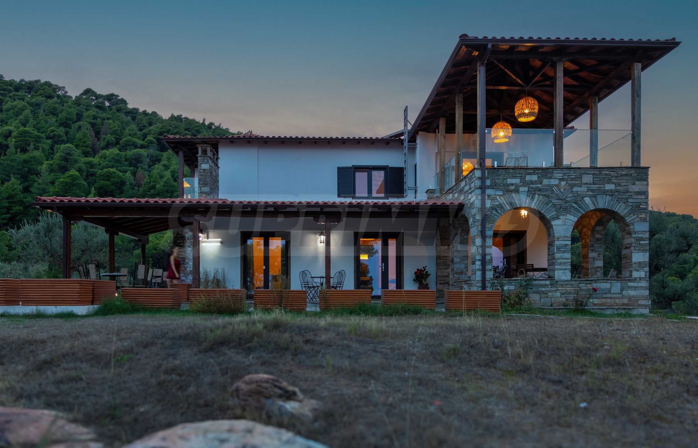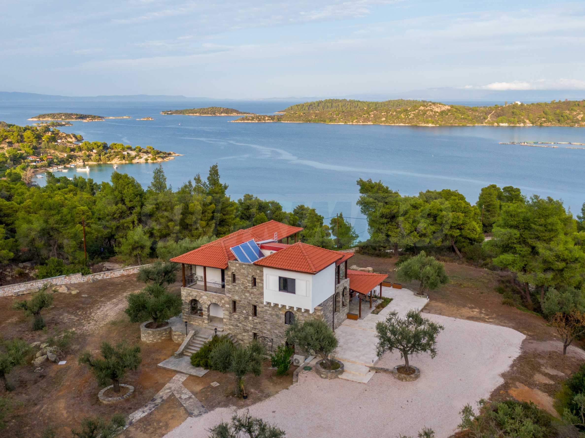 Величествената, изцяло реновирана вила се извисява над кристалночистите води на Егейско море и предлага зашеметяващи изгледи, и пейзажи простиращи се над о-в Диапорос до свещената планина на Атон/Света Гора.