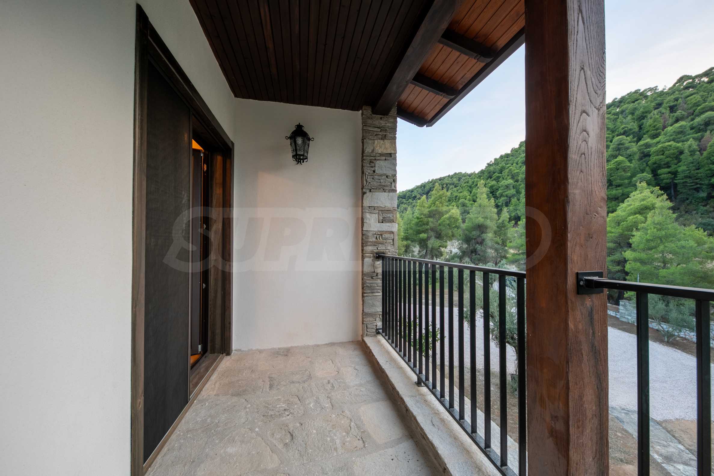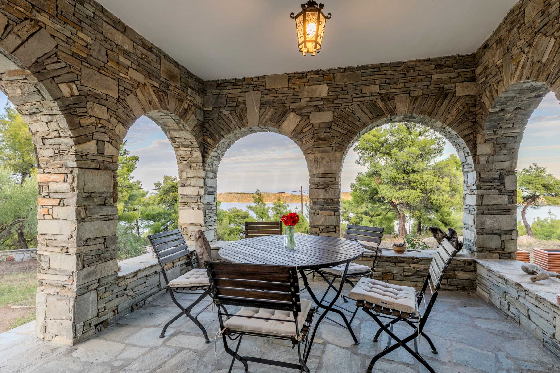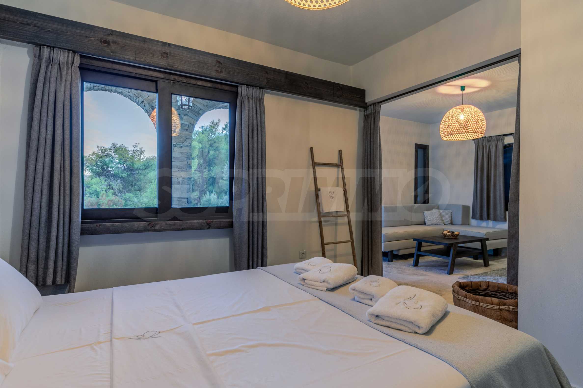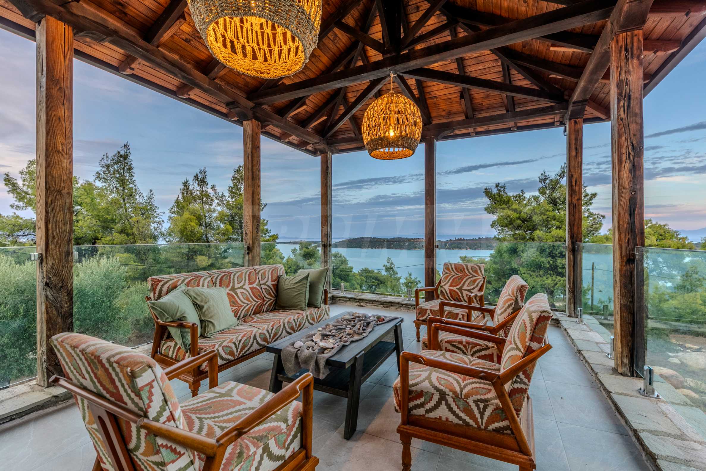 Величествената, изцяло реновирана вила се извисява над кристалночистите води на Егейско море и предлага зашеметяващи изгледи, и пейзажи простиращи се над о-в Диапорос до свещената планина на Атон/Света Гора.