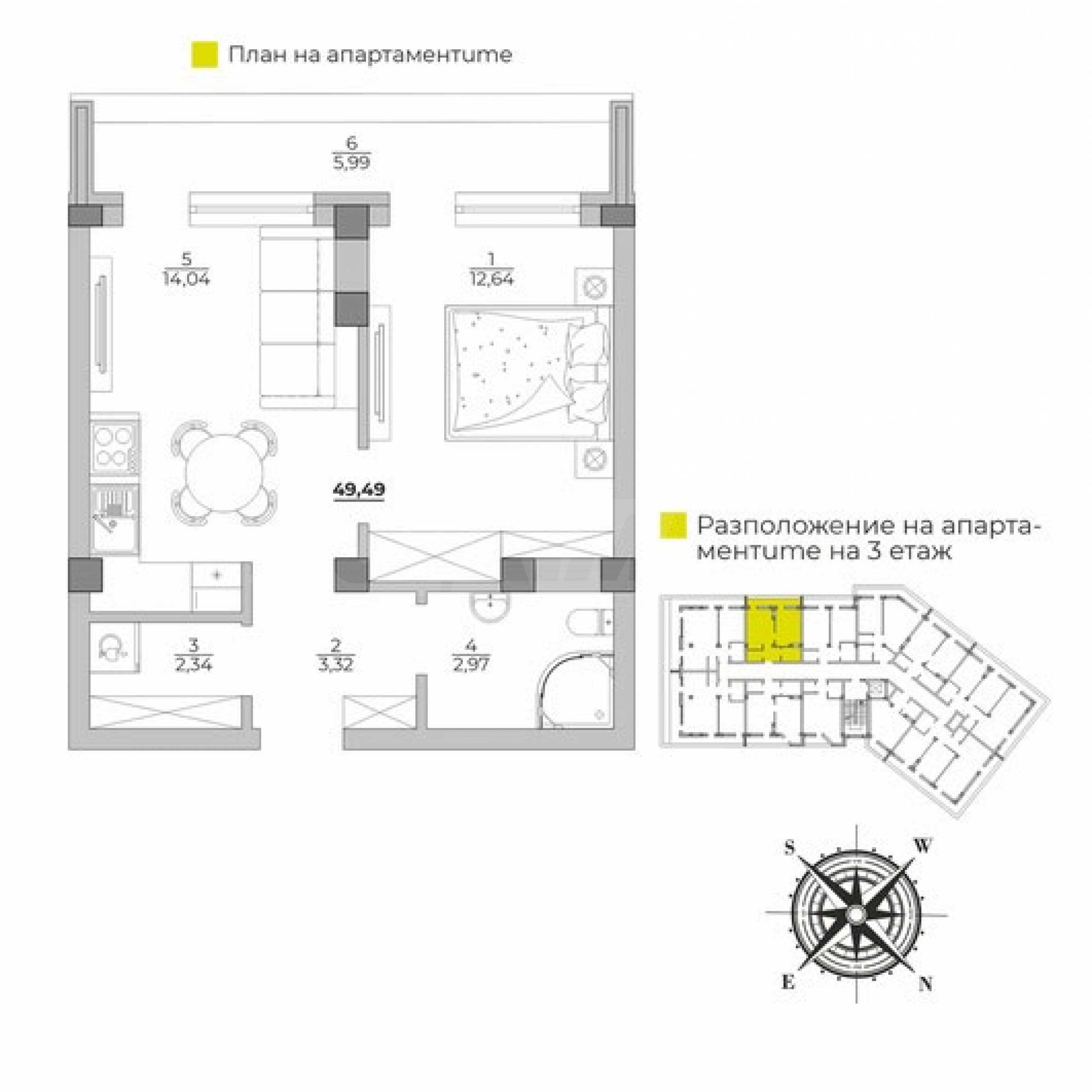 Имотът с обща площ от 49.49 кв.м се намира на партерен етаж и разполага със собствена закрита тераса и излаз към двор.
