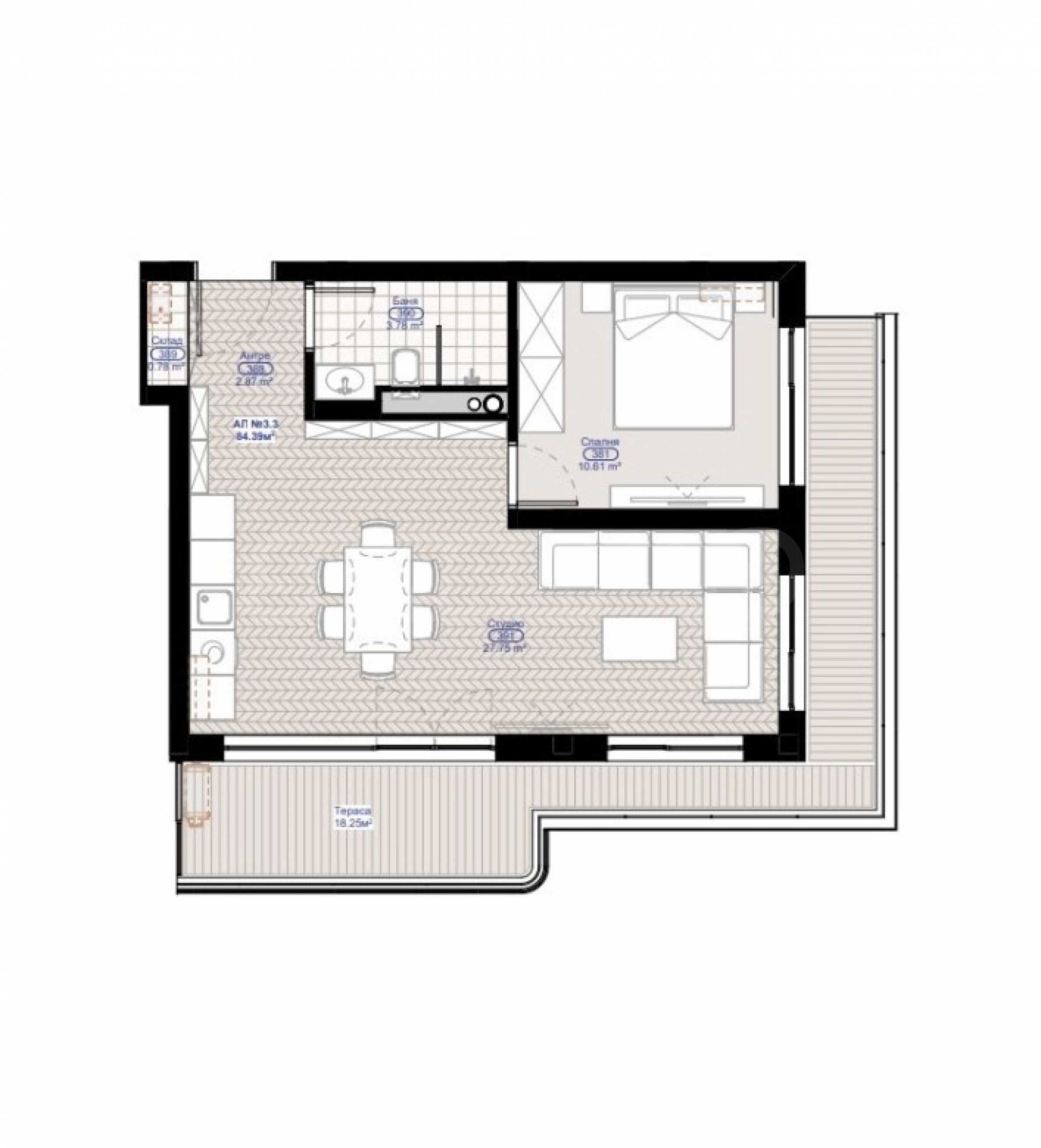 Имотът е с площ от 84.38 кв.м, разположен на 3-ти етаж с изложение изток/юг и се състои от: антре, всекидневна с кухня, спалня, баня с тоалет, килер и просторна тераса. Издава се в степен на завършеност по БДС, на шпакловка и замазка.