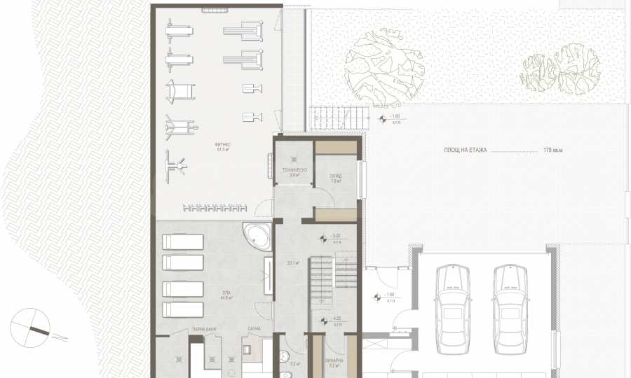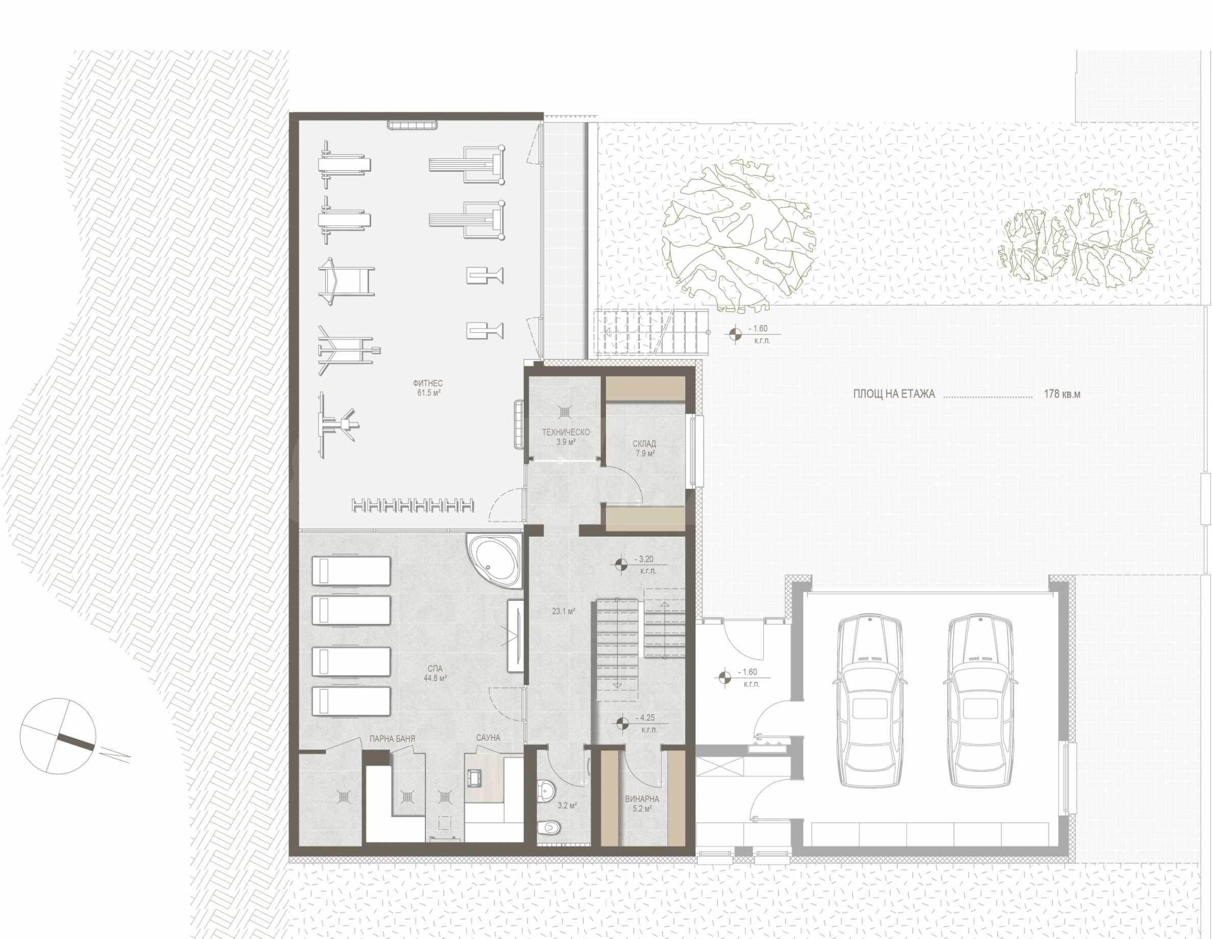 Сутерен: СПА зона, фитнес с богато остъкляване и тераса, тоалетна, винарна, три технически помещения .;