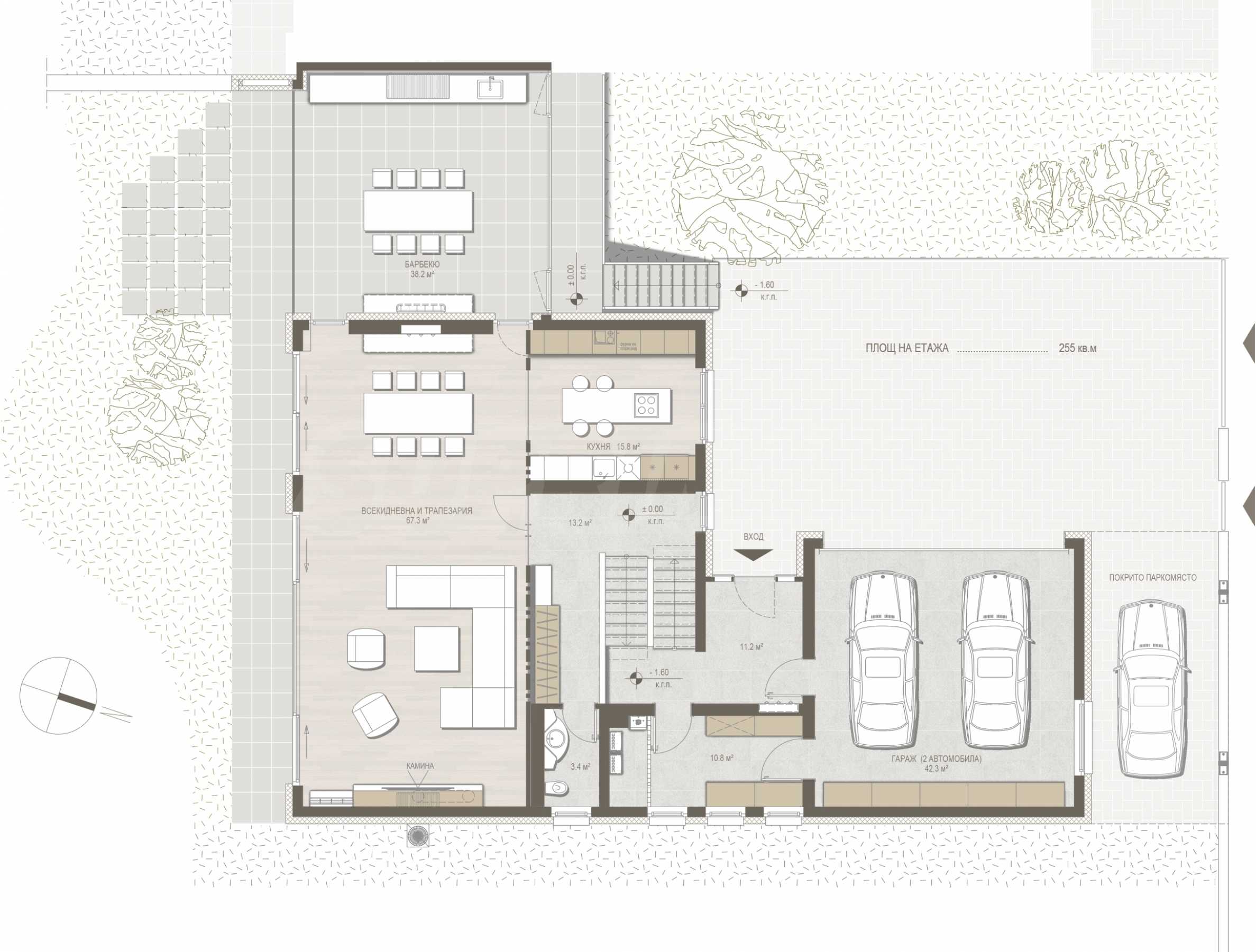 Първи етаж: дневна и столова на нивото на двора от юг и с южно изложение, кухня, тоалетна, барбекю, на полу-ниво: два гаража за два автомобила, дрешник, входно преддверие, още едно покрито паркомясто в двора;