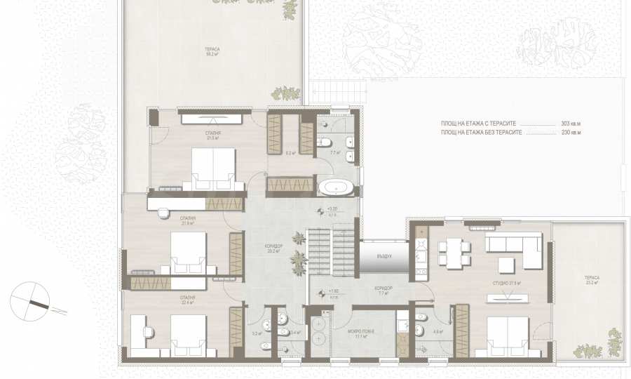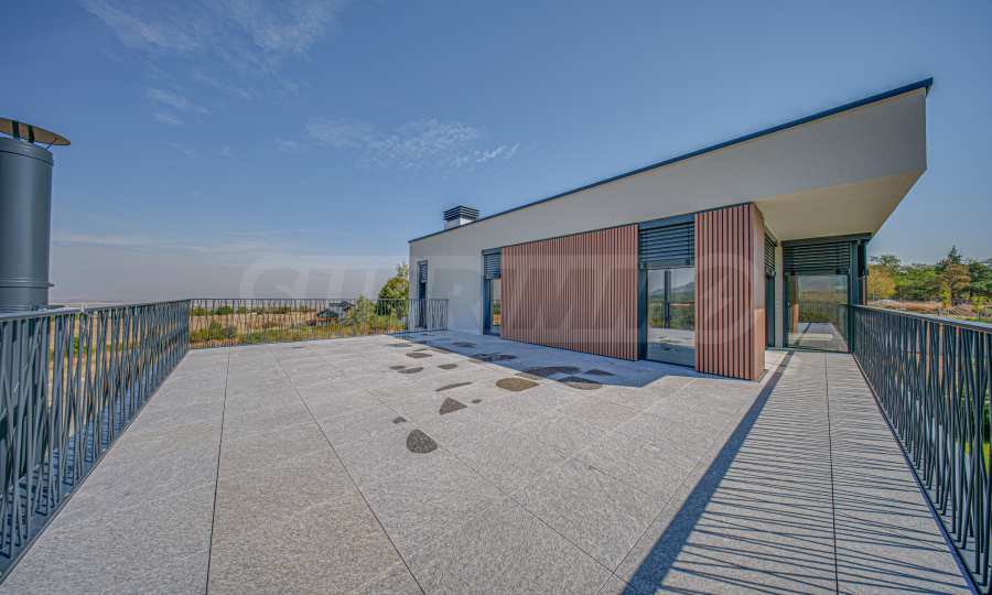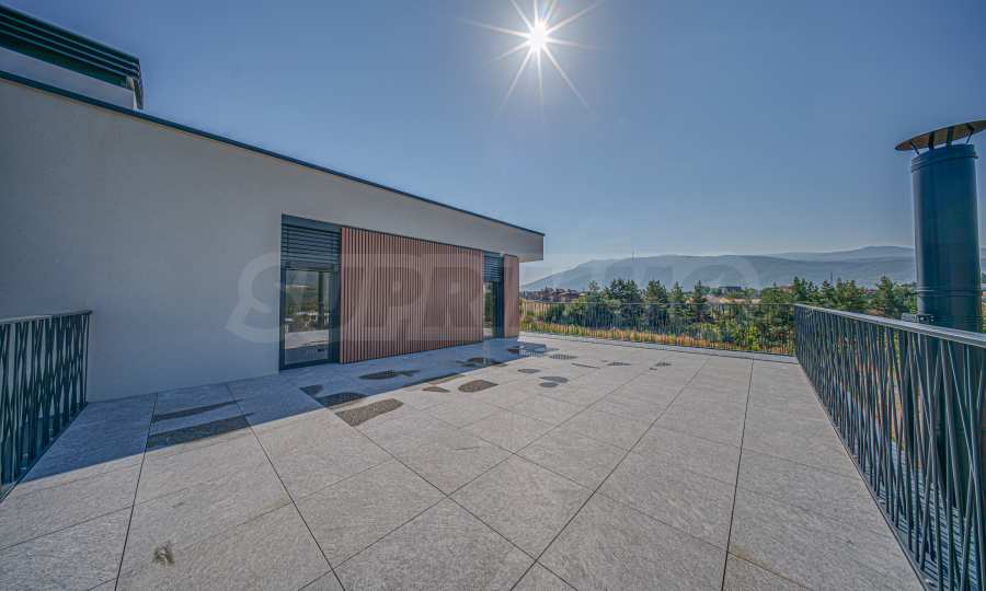 Втори етаж: родителска спалня с дрешник, баня и тераса, две спални, всички с южно изложение, две бани, на полу-ниво: студио с баня и тераса и мокро помещение.