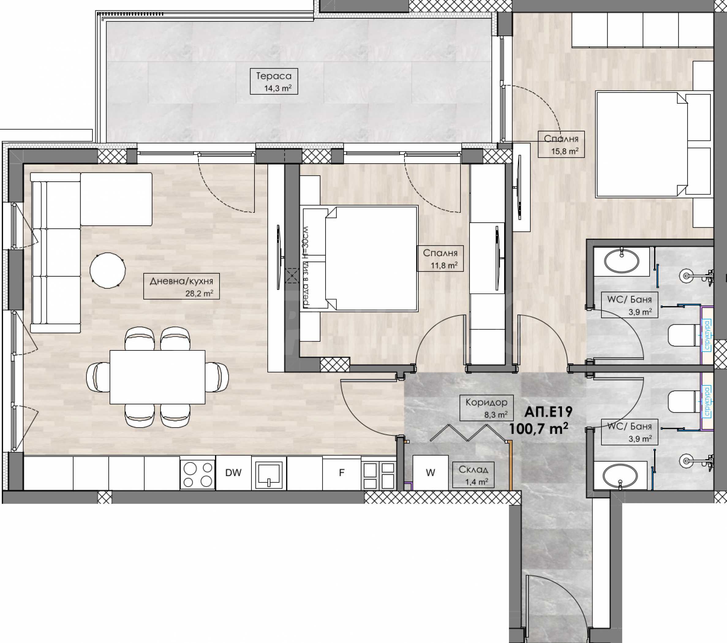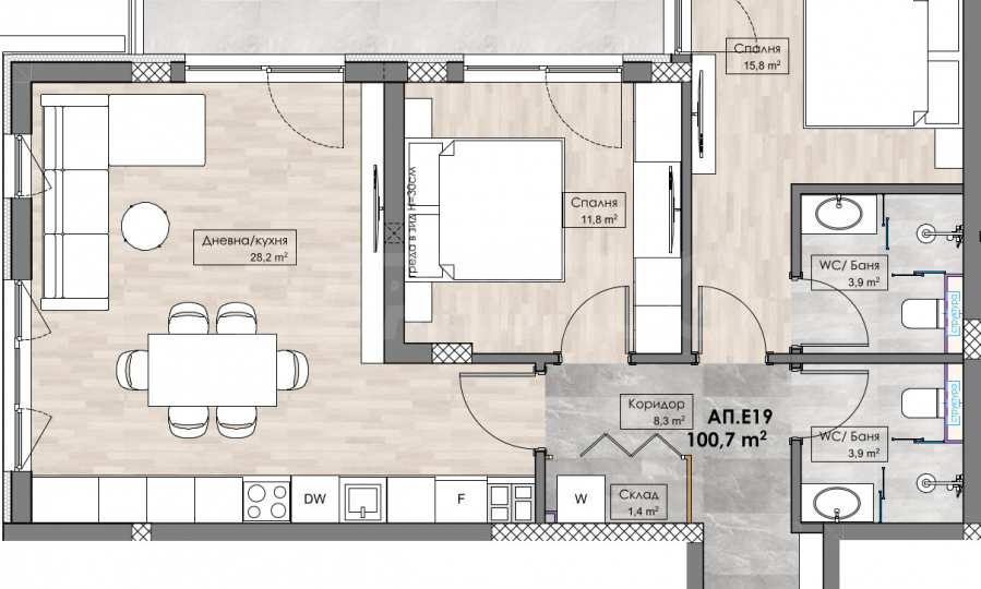 Жилищата се предават на шлайфан бетон и машинна гипсова мазилка.