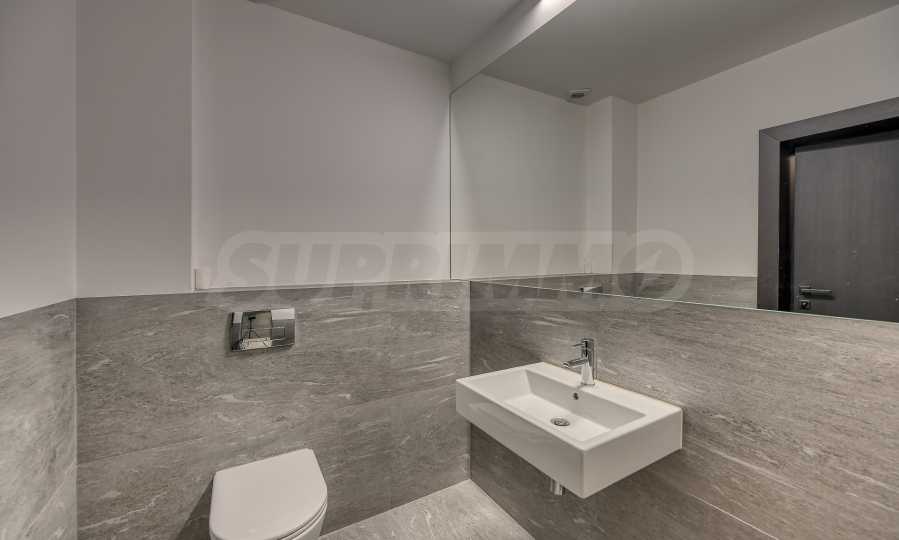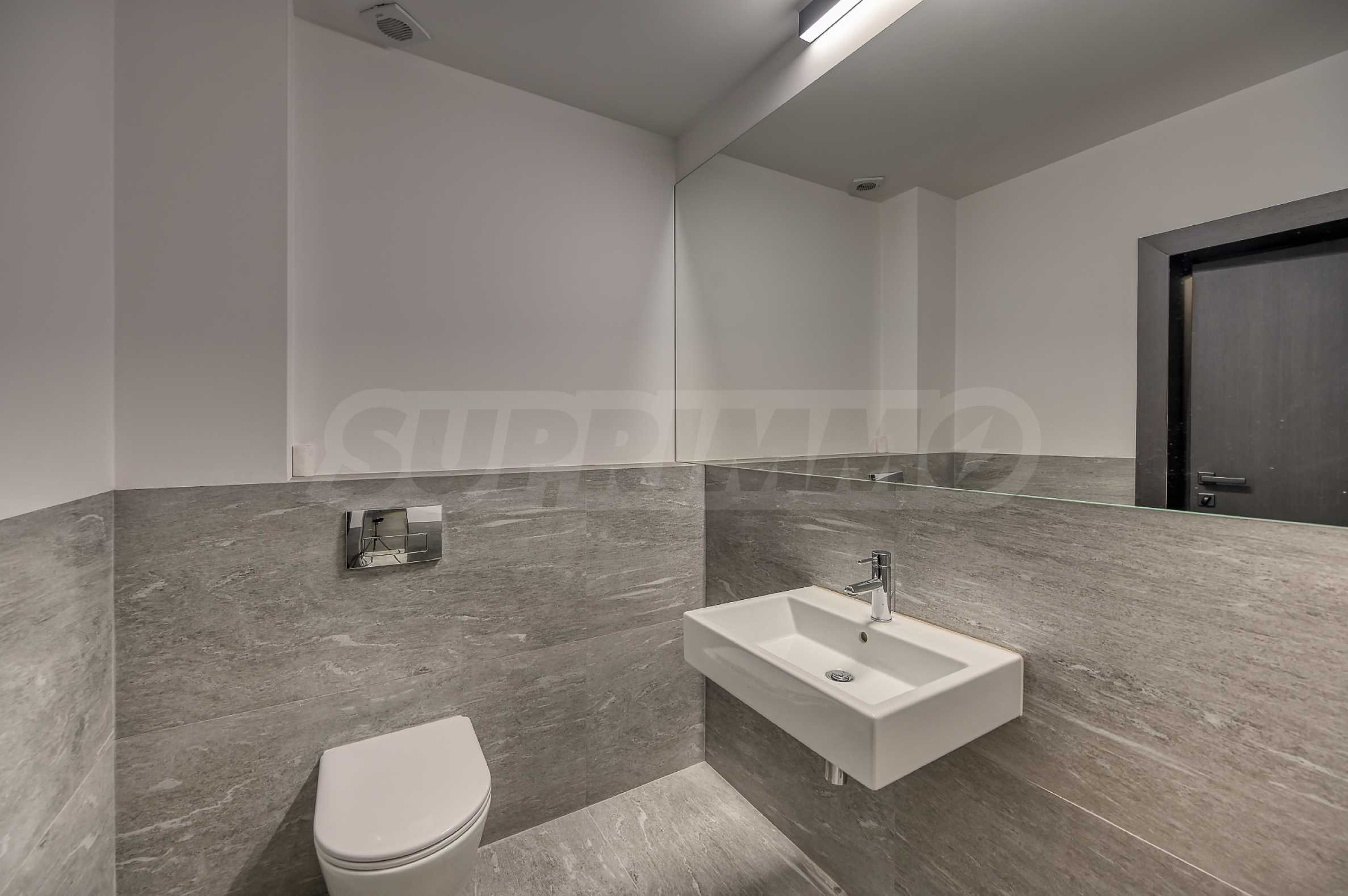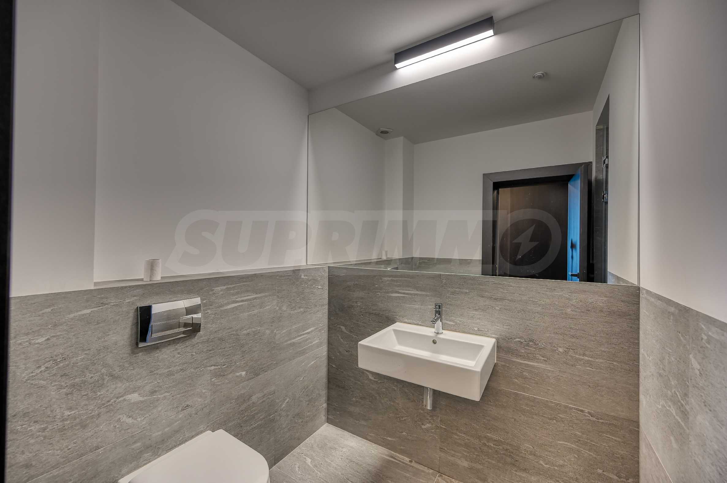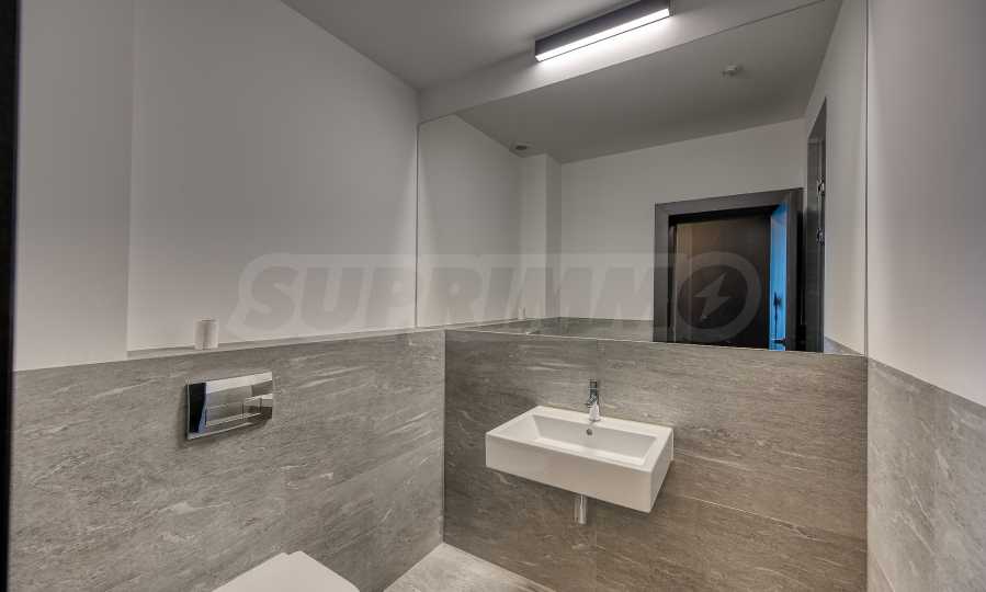 Банята с тоалетна е модерно оборудвана, съчетаваща стил и функционалност. Висококачествените материали и естетиката на интериора подчертават вниманието към детайла, характерно за целия офис.