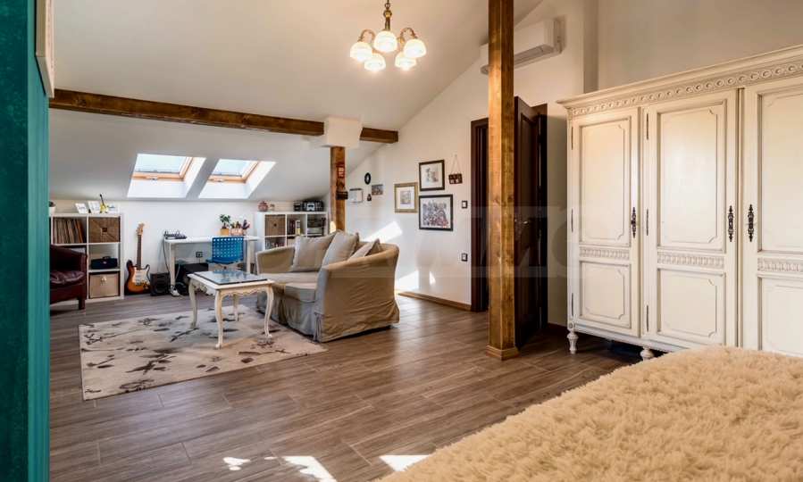 Изложението е благоприятно - юг, югозапад и изток. Предлага супер просторни стаи и високи тавани - 3 метра, с отлично разпределение. Къщата разполага с приземен и мансарден етаж, с обширна дневна и трапезария, големи спални.