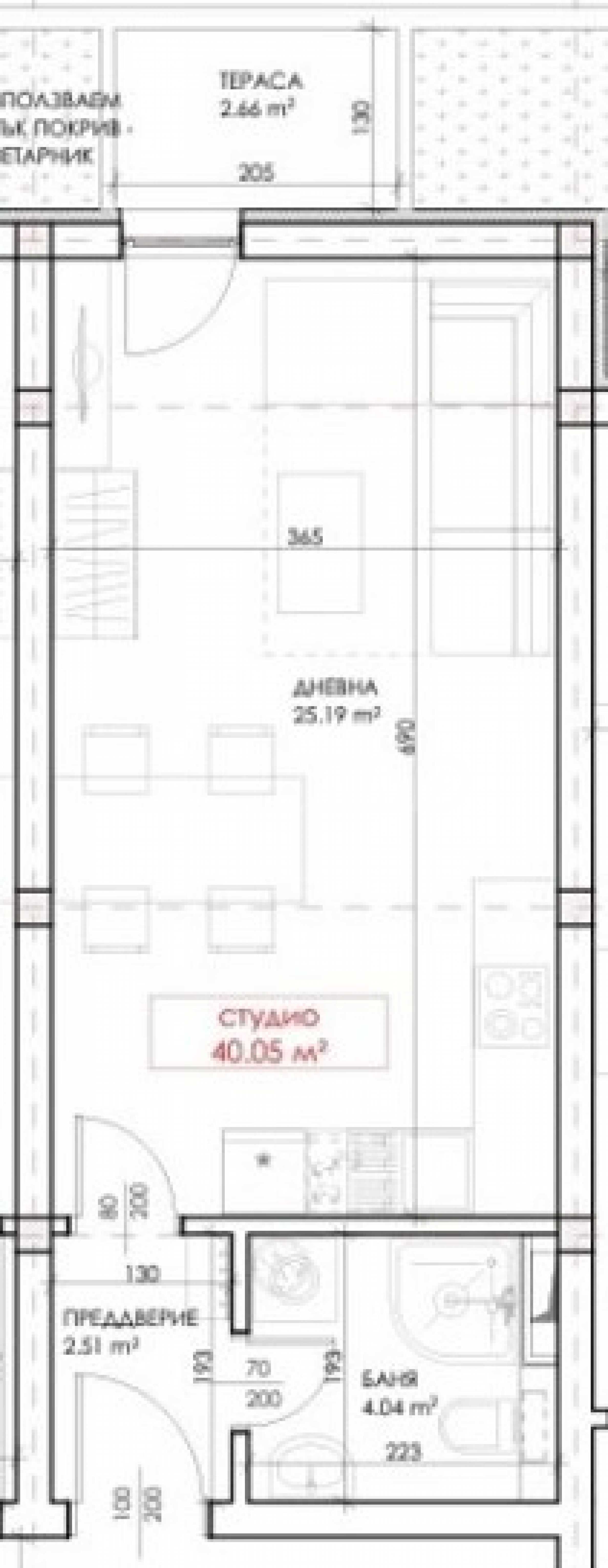 Имотът е с обща площ от 44,68 кв.м, разположен на 3-ти етаж с гледка към града и морето. Състои се от антре, дневна и баня с тоалетна, издава се в степен на завършеност по БДС, на шпакловка и замазка.