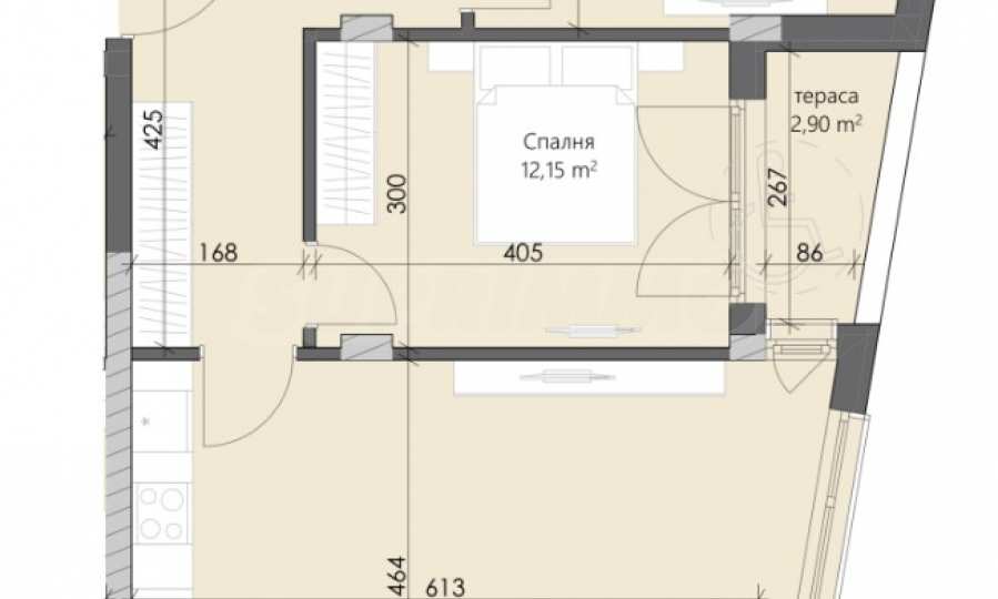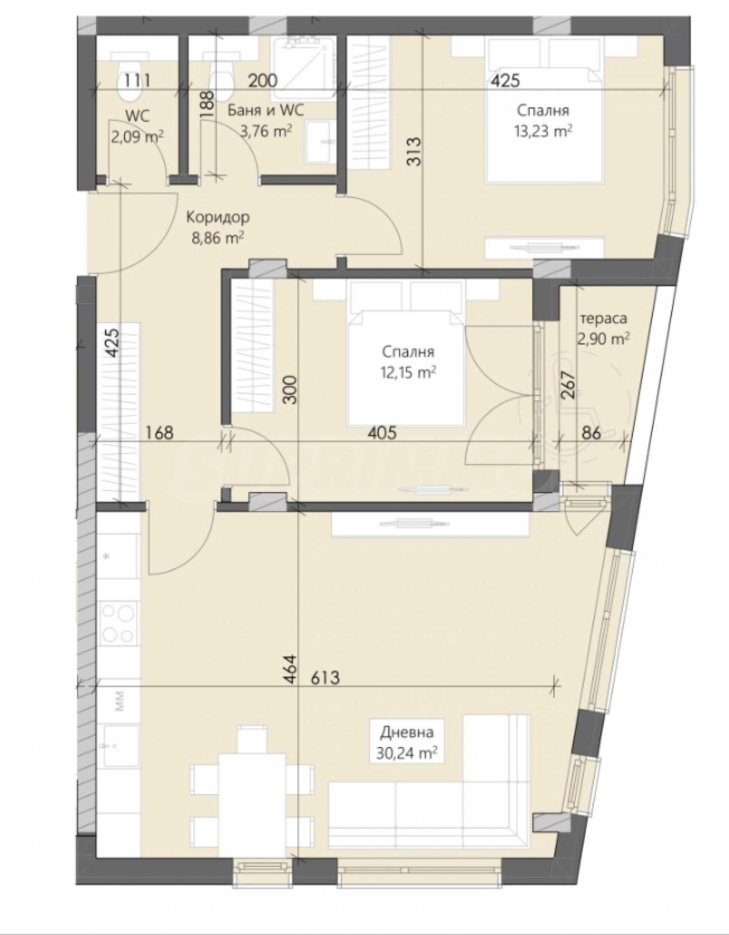 - две спални - 12.15 кв.м и 13.23 кв.м;