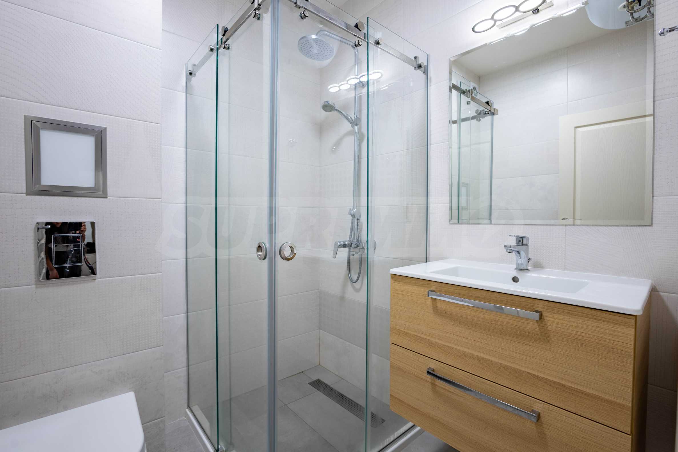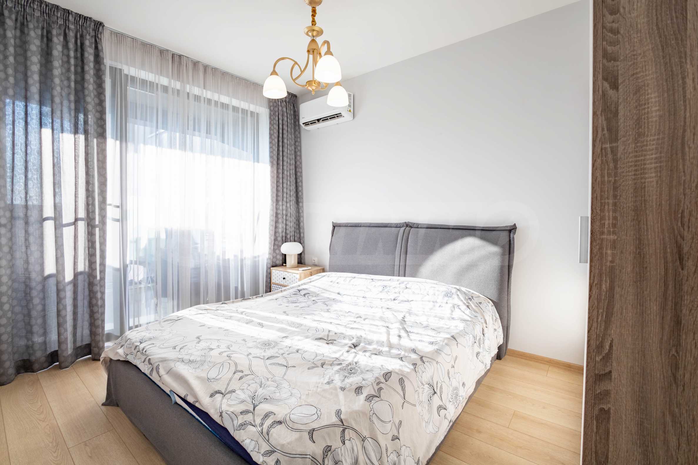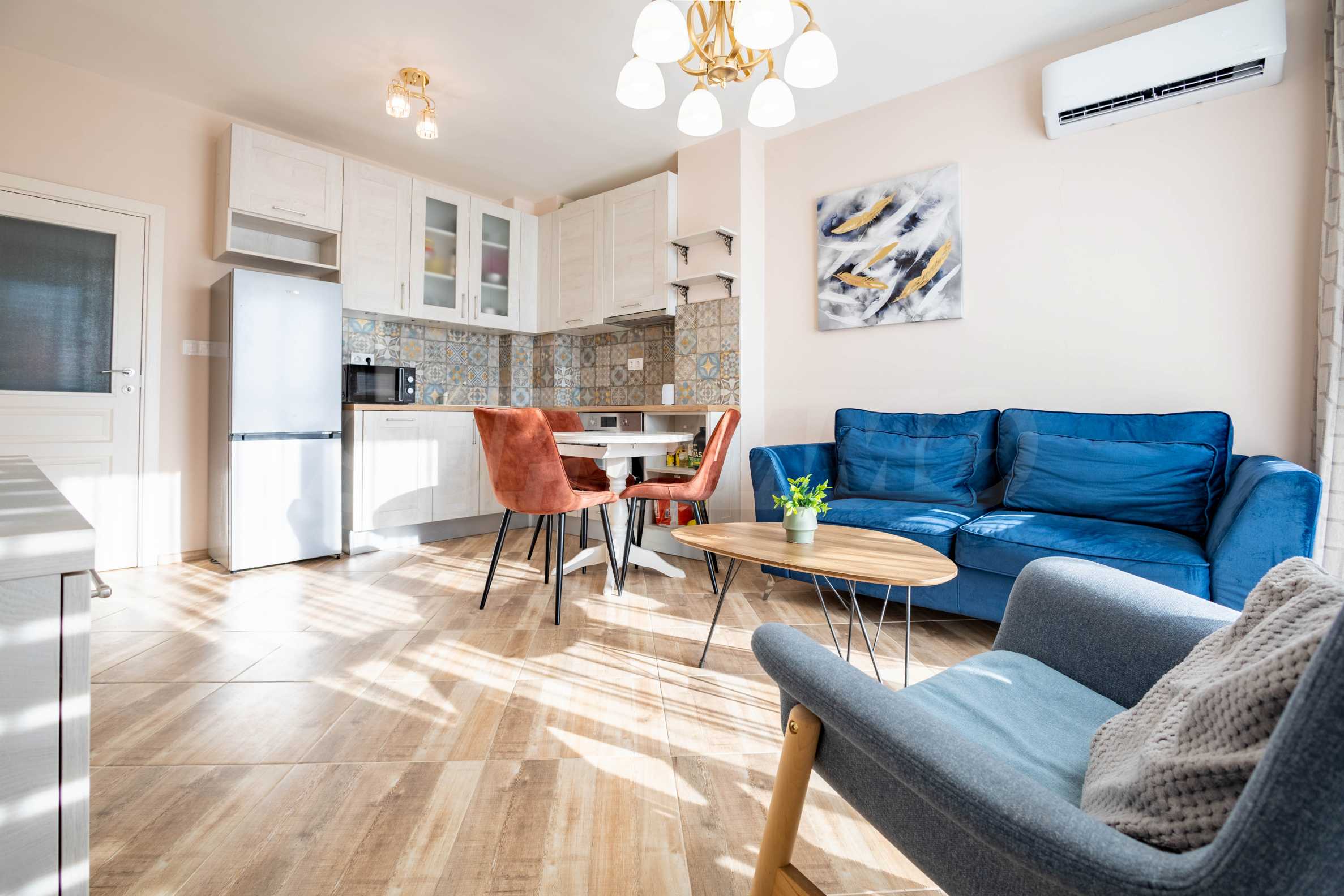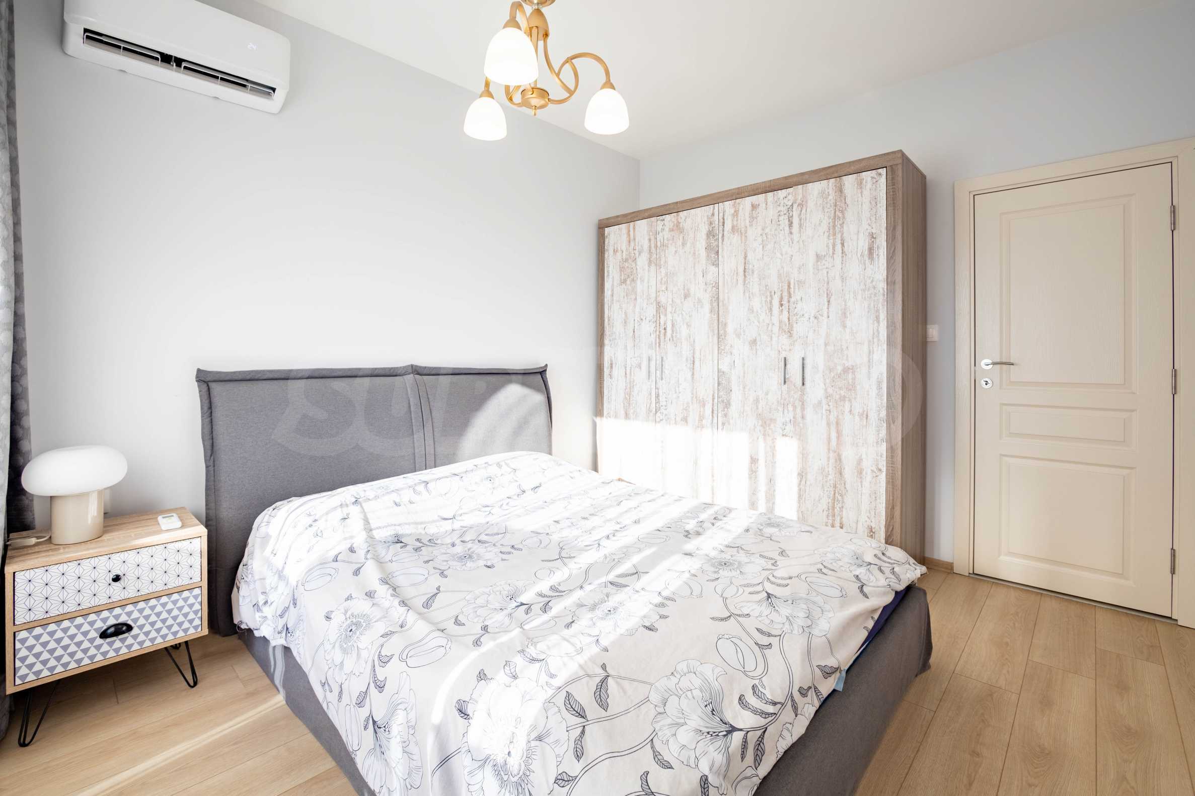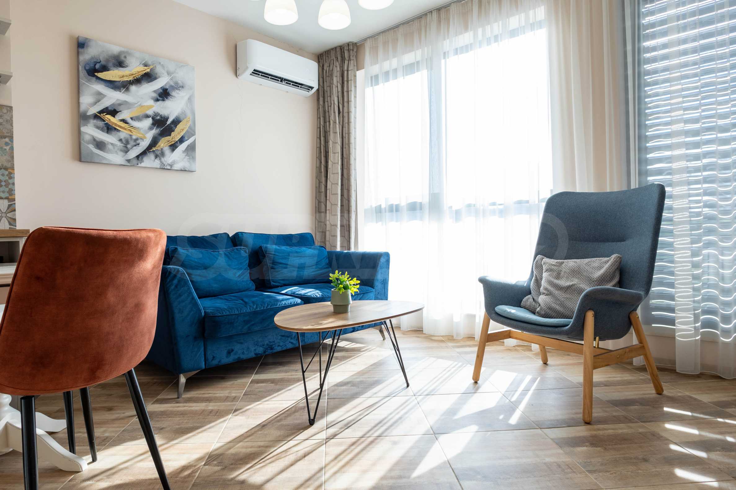 Жилището е с модерно обзавеждане, което съчетава комфорт и стил. Кухнята е напълно оборудвана с висококачествени уреди, включително фурна, хладилник, микровълнова фурна, миялна машина и пералня със сушилня. Спалнята е уютна и функционална с удобно легло и достатъчно място за съхранение на лични вещи.