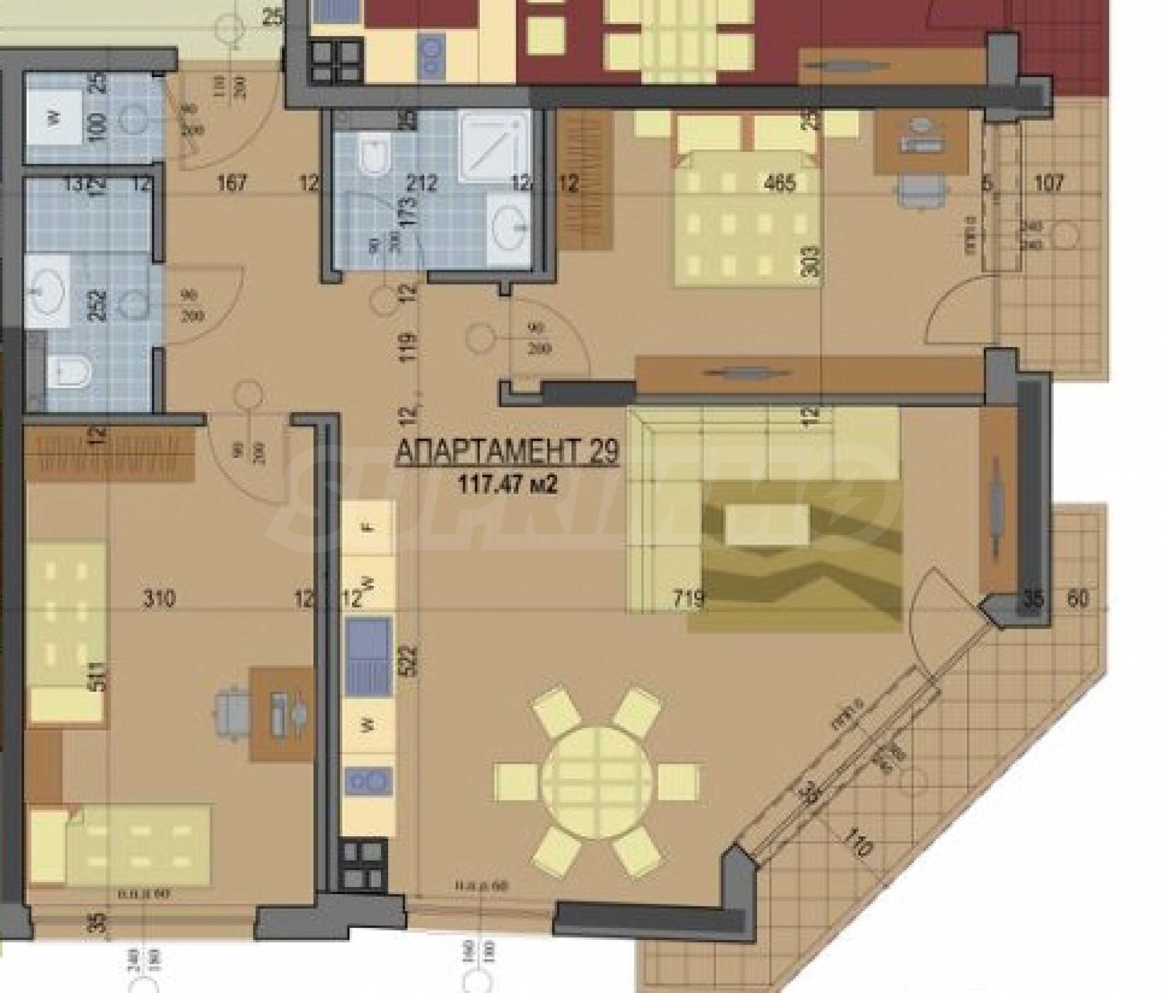Апартаментът е тристаен, с обща площ 117.47 кв.м. (нетна площ 101.12 кв.м. + общи части 16.35 кв.м.) и е разположен на шести етаж.