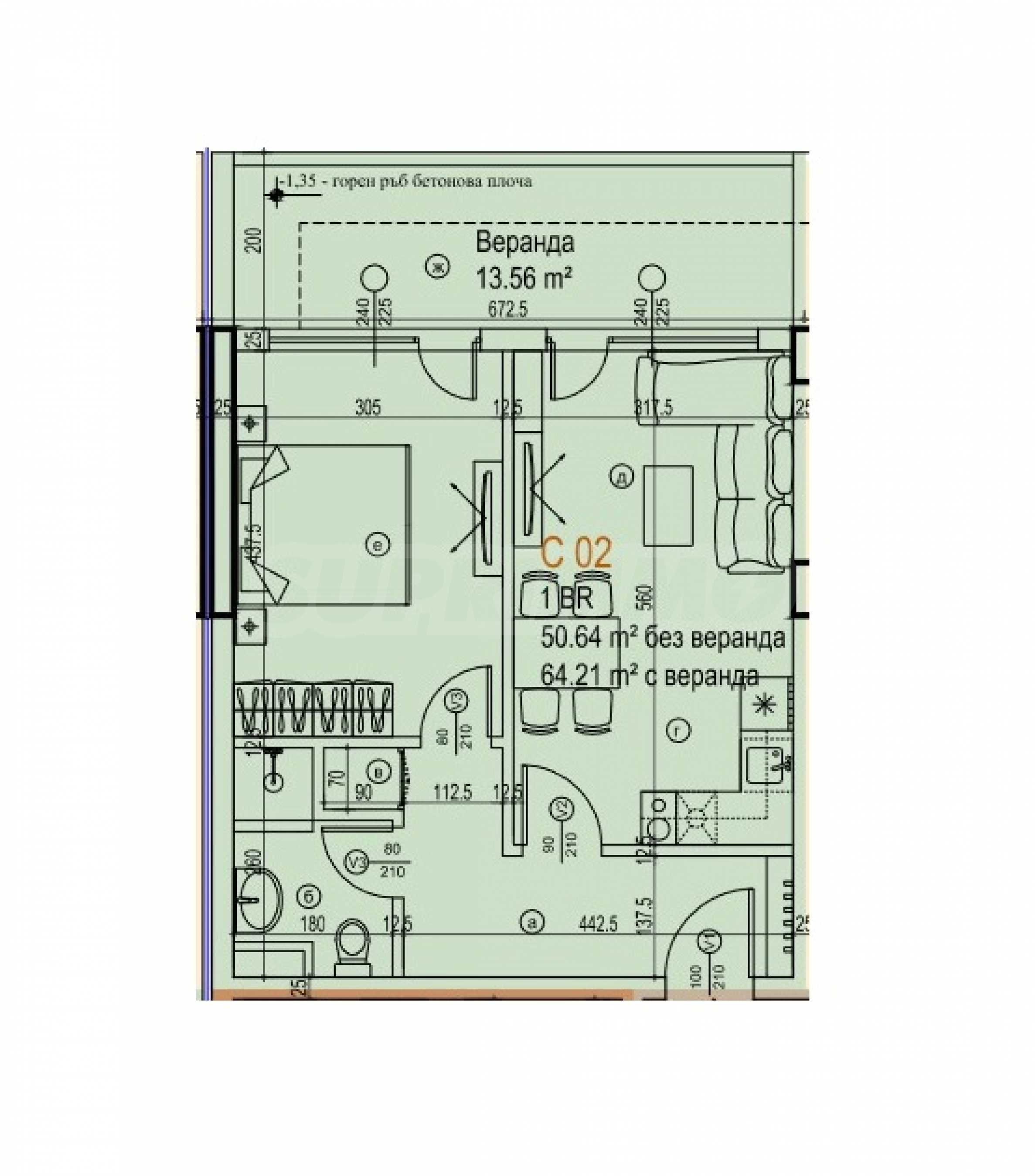 Жилището е ситуирано на партерен етаж и предлага 70.32 кв.м обща площ, от които 6.12 кв.м общи части и 13.56 кв.м веранда.