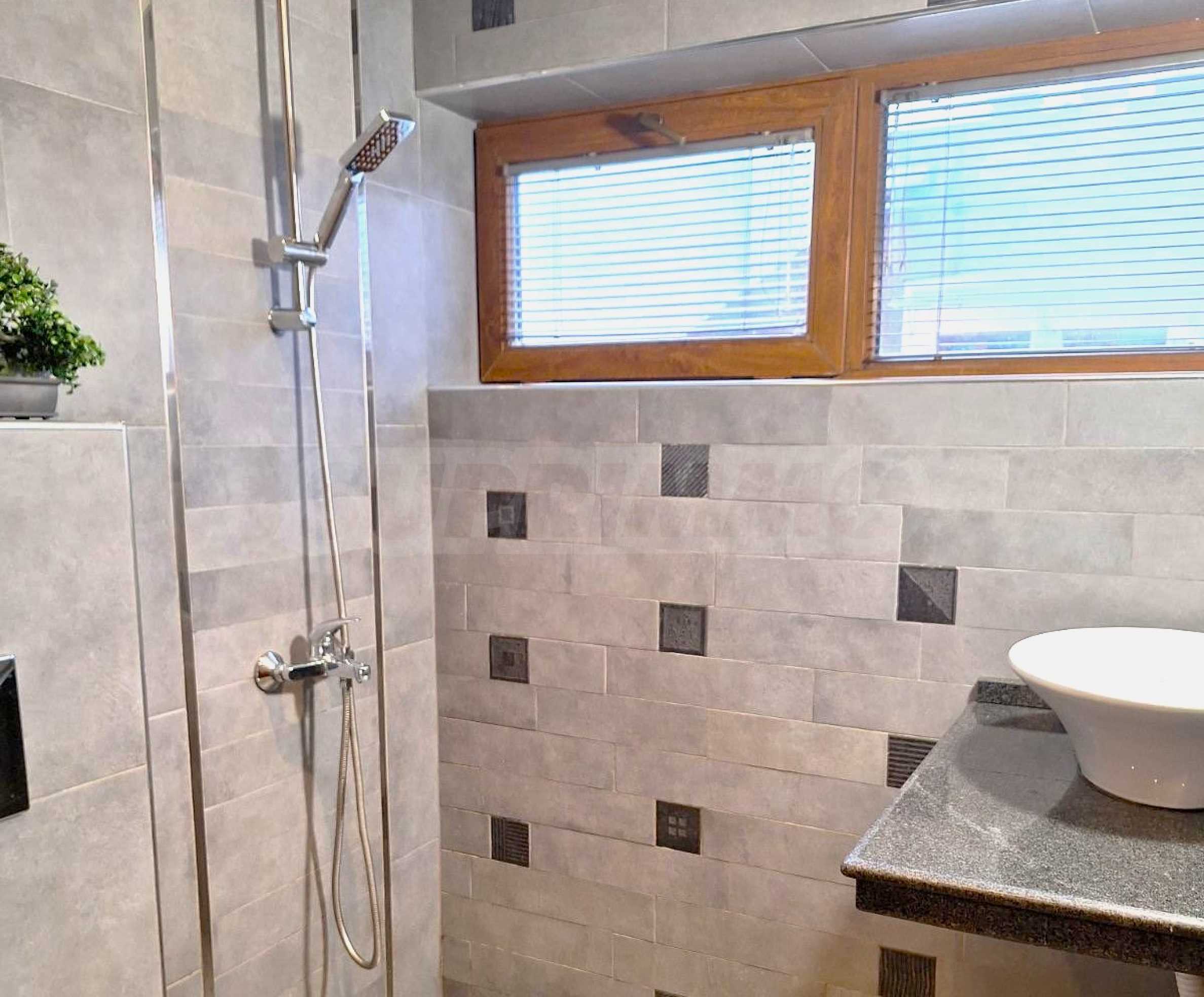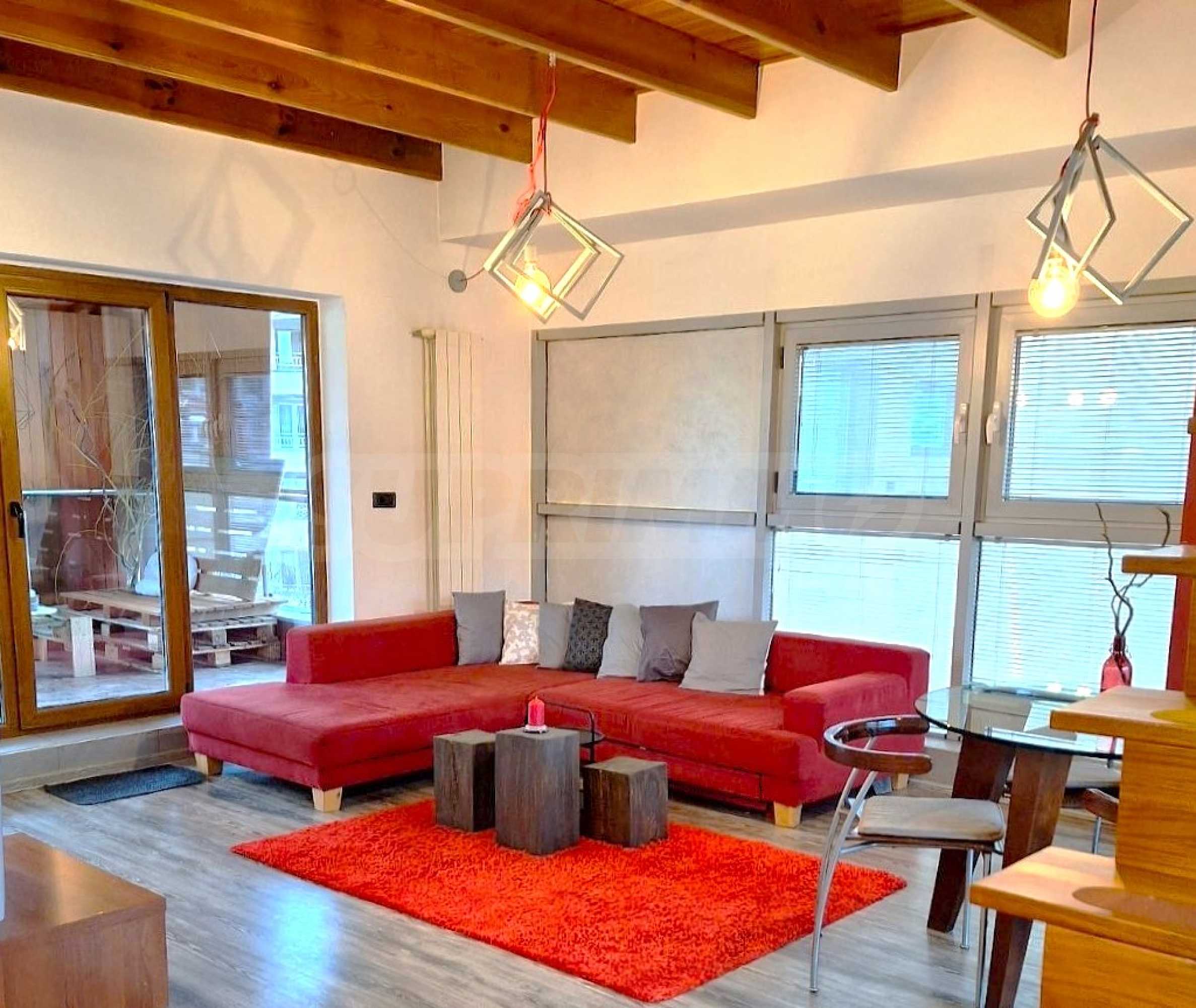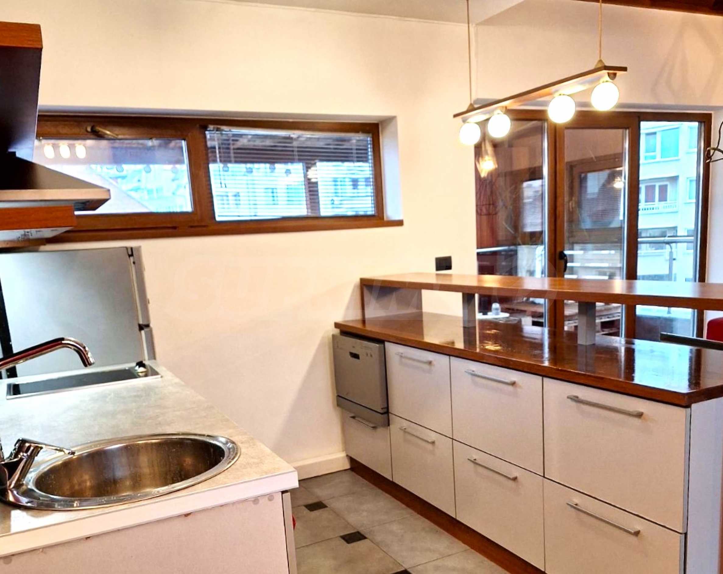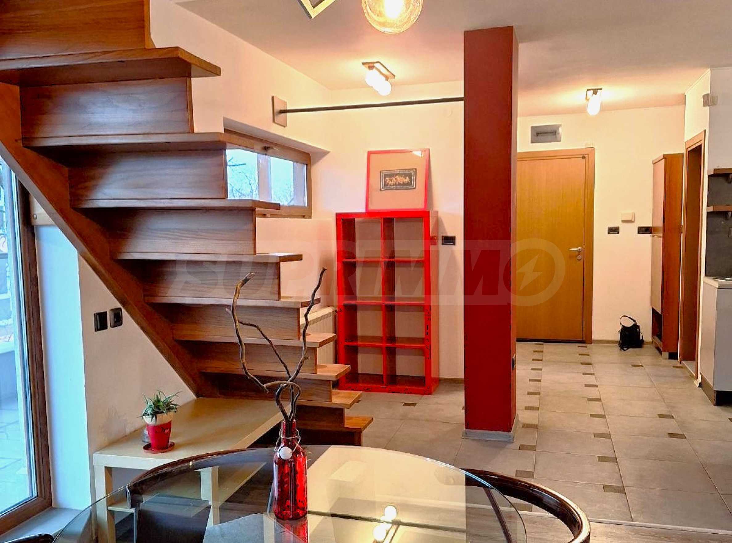 Мезонетът е разпределен функционално на две нива, създавайки усещане за простор и отделни зони за почивка и дневни занимания. На първото ниво ще откриете светла и просторна дневна зона с големи прозорци, които осигуряват естествена светлина през целия ден.Кухнята е напълно оборудвана с всички необходими уреди и е стилно интегрирана към дневната зона, което създава модерен и функционален интериор.