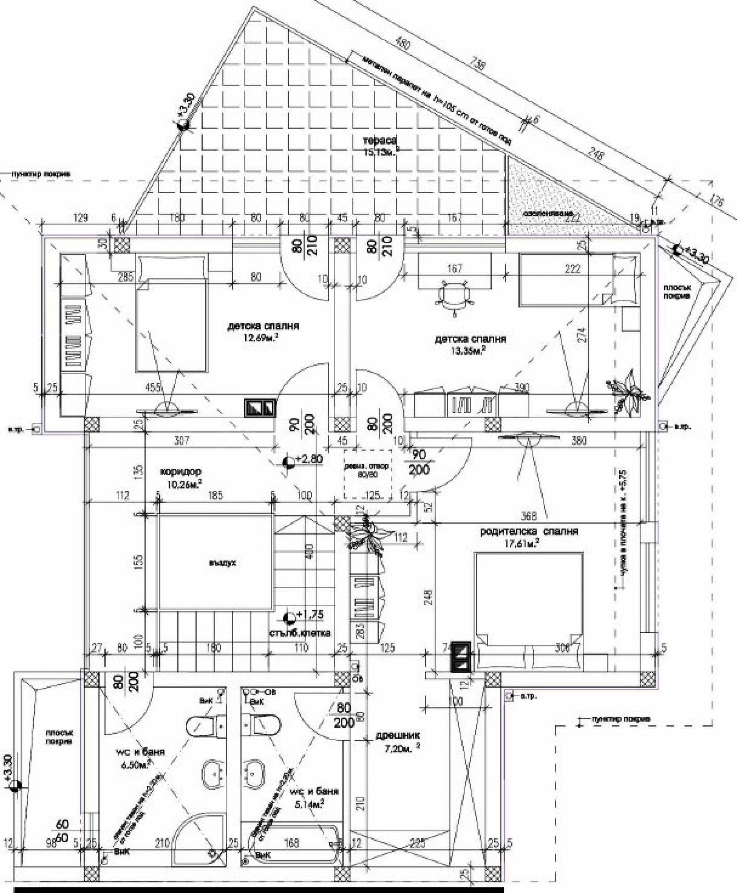 - втори етаж - три спални - 17.61 кв.м, 13.35 кв.м и 12.69 кв.м, дрешник - 7.20 кв.м, голяма тераса - 15.13 кв.м, две бани с тоалетни - 6.50 кв.м и 5.14 кв.м. с вана и сауна