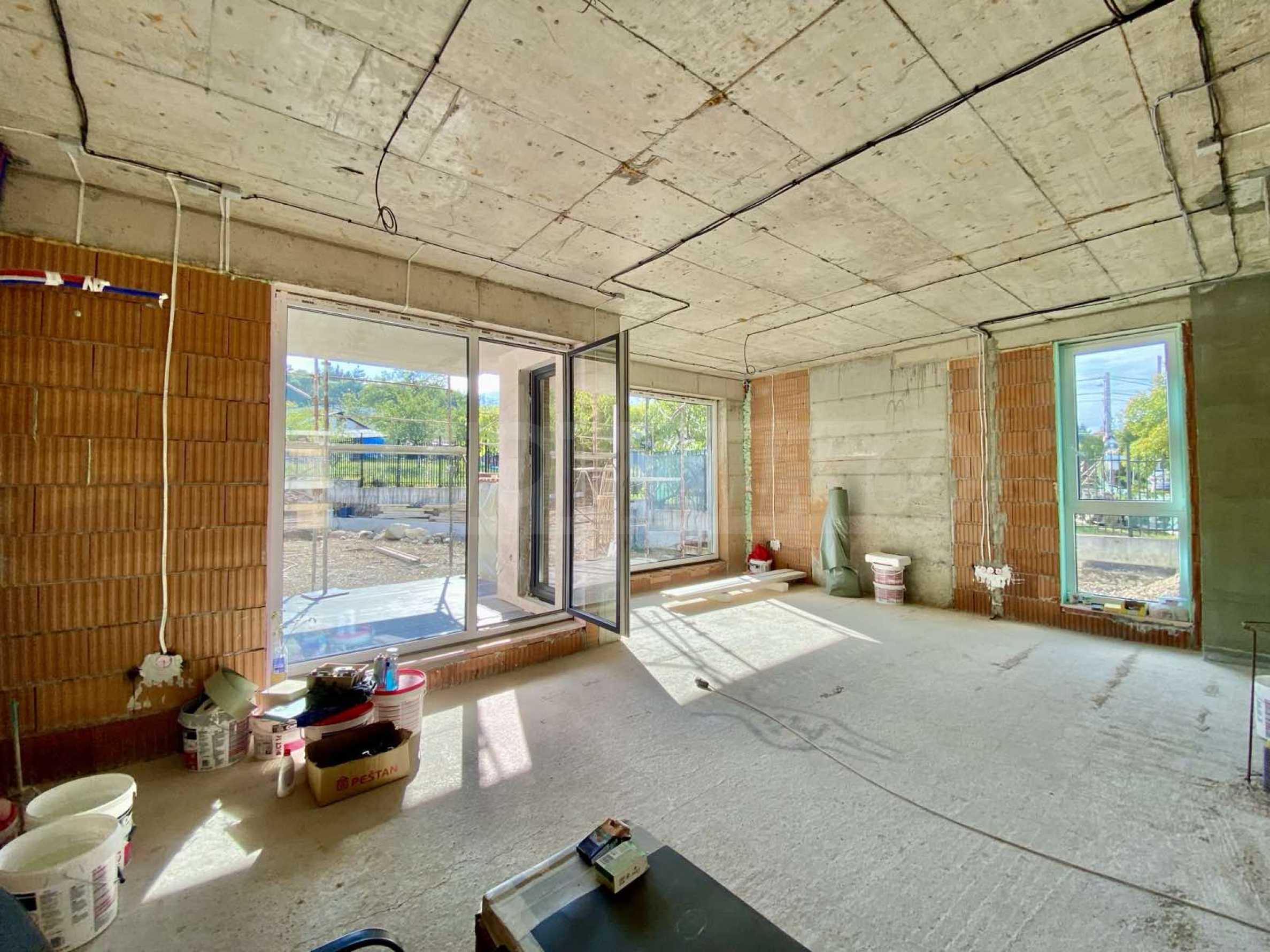 Първи етаж: Просторен хол с директен излаз към веранда и собствен озеленен двор, модерна кухня с трапезария, балкон и санитарен възел.