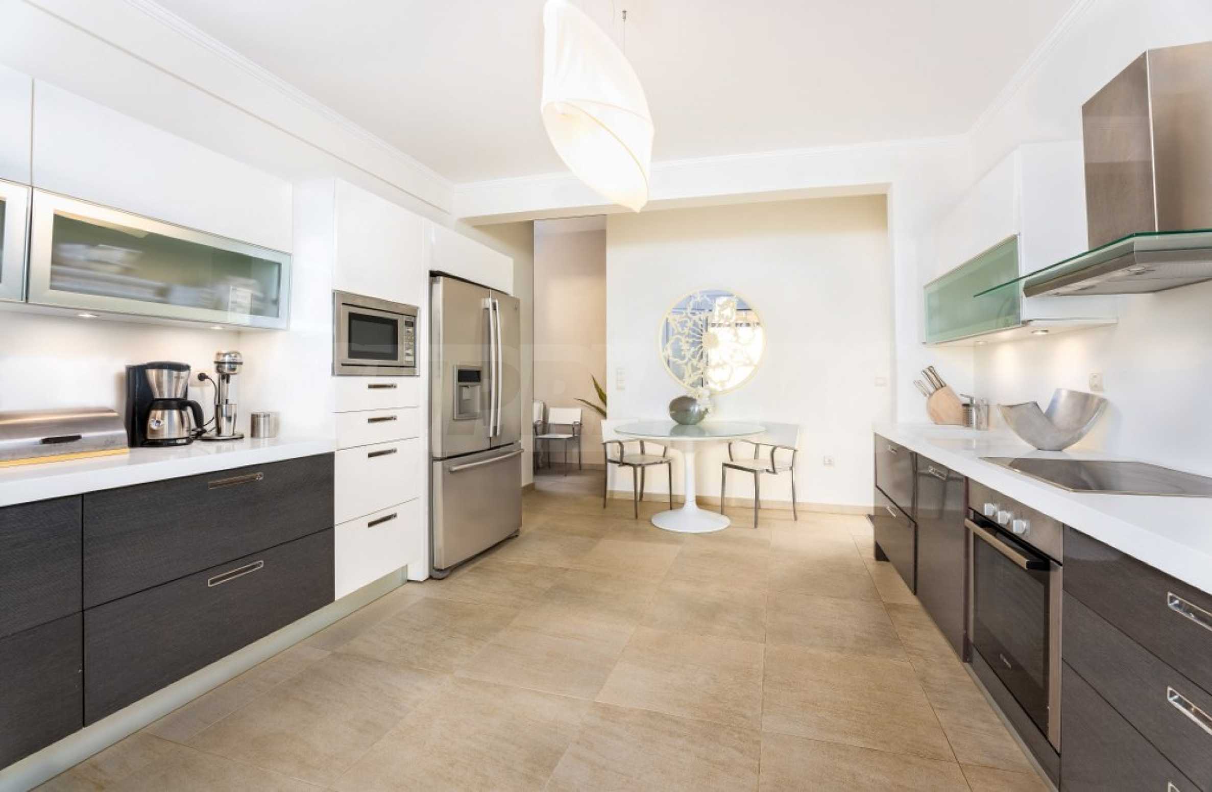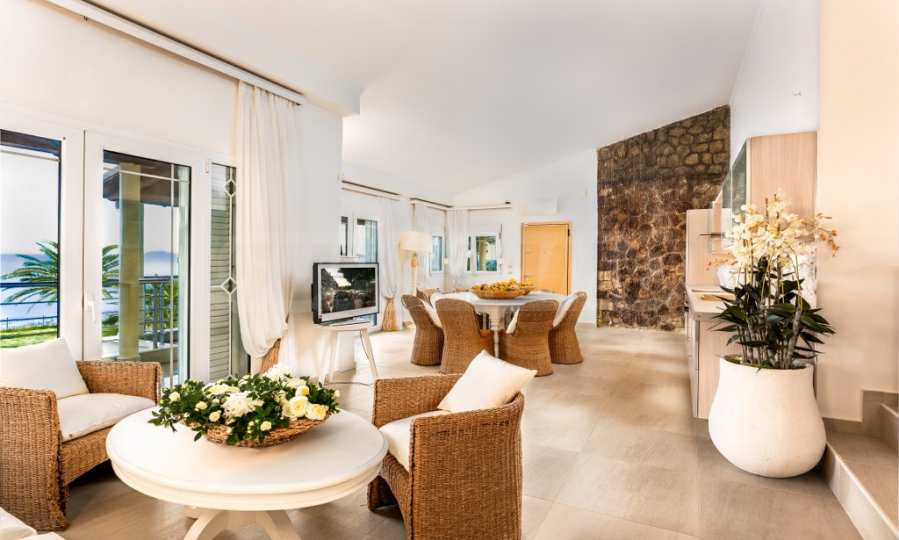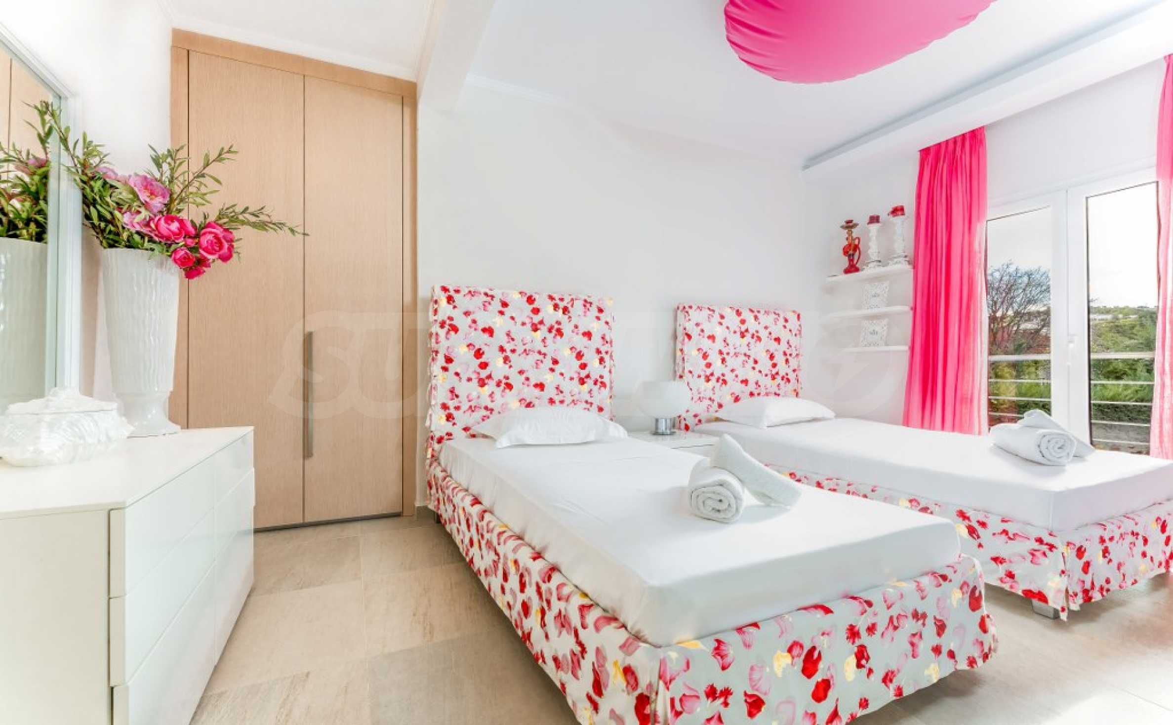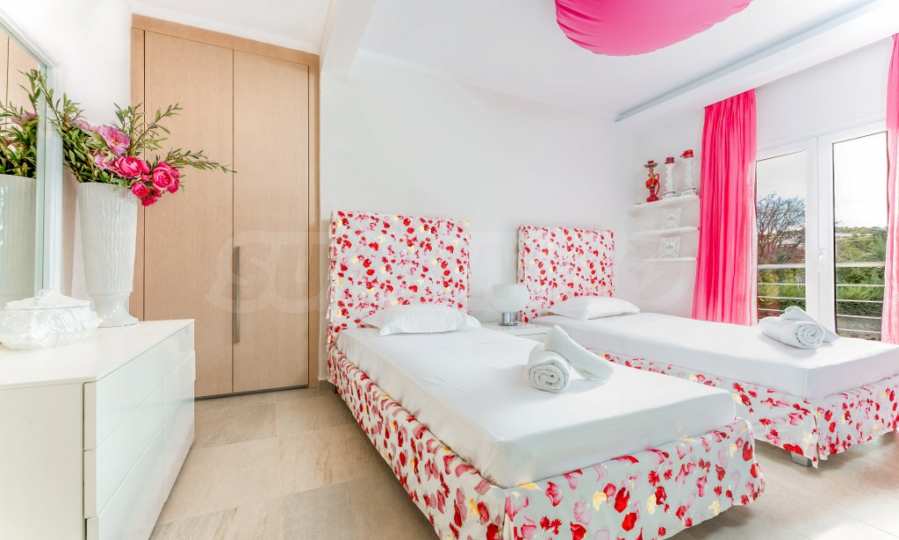 Със своите 5 просторни спални и 4 стилни бани, вилата предлага достатъчно пространство и уют за цялото ви семейство, също и за вашите гости. Светлите и просторни помещения са създадени с мисъл за съвременния живот, като същевременно запазват връзката с природата, благодарение на големите прозорци и тераси, откриващи неописуеми морски гледки.