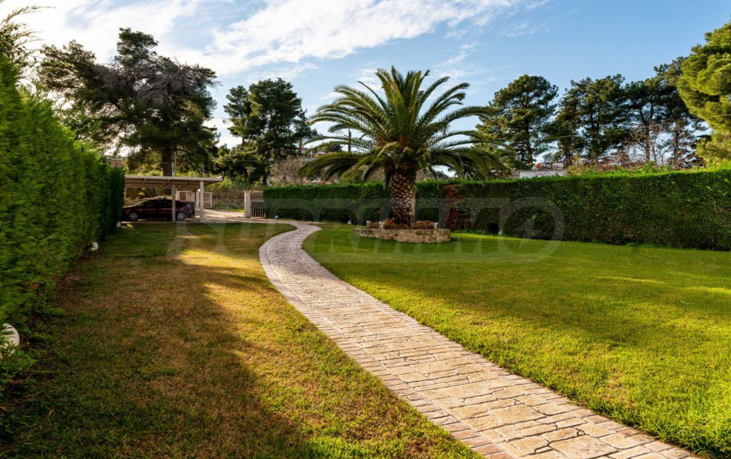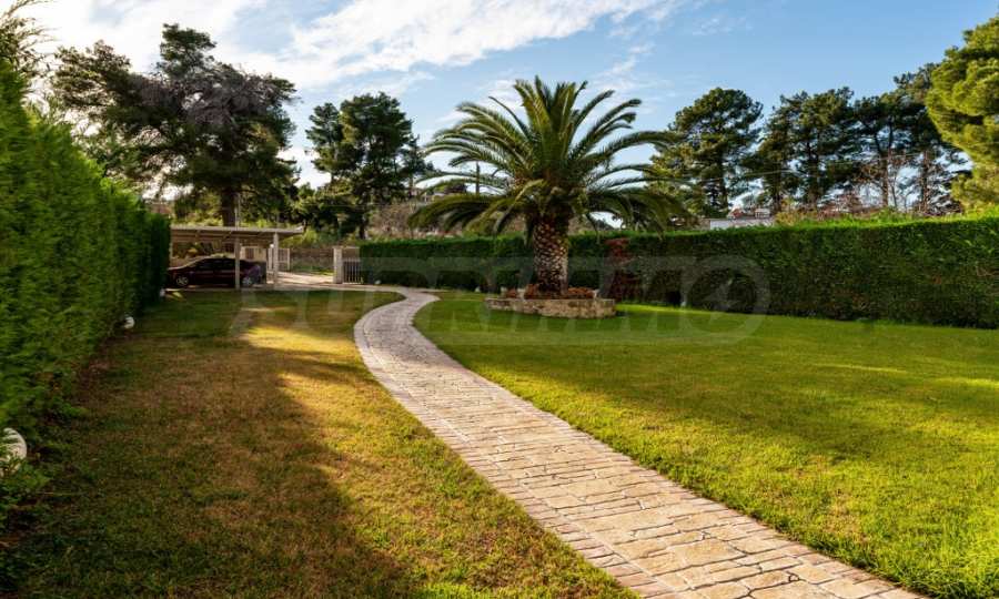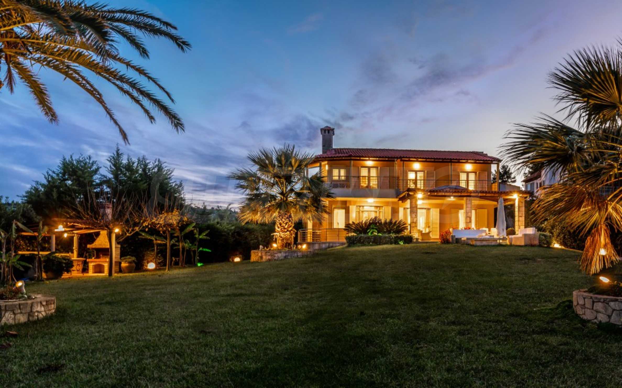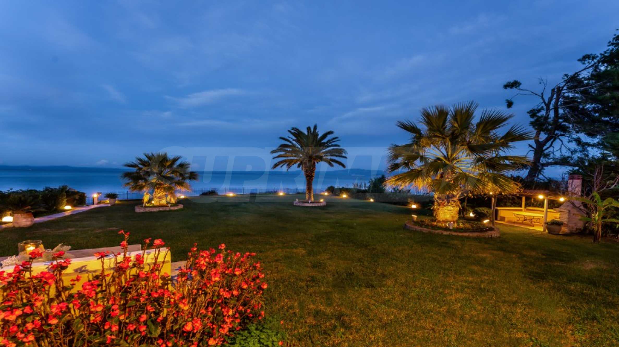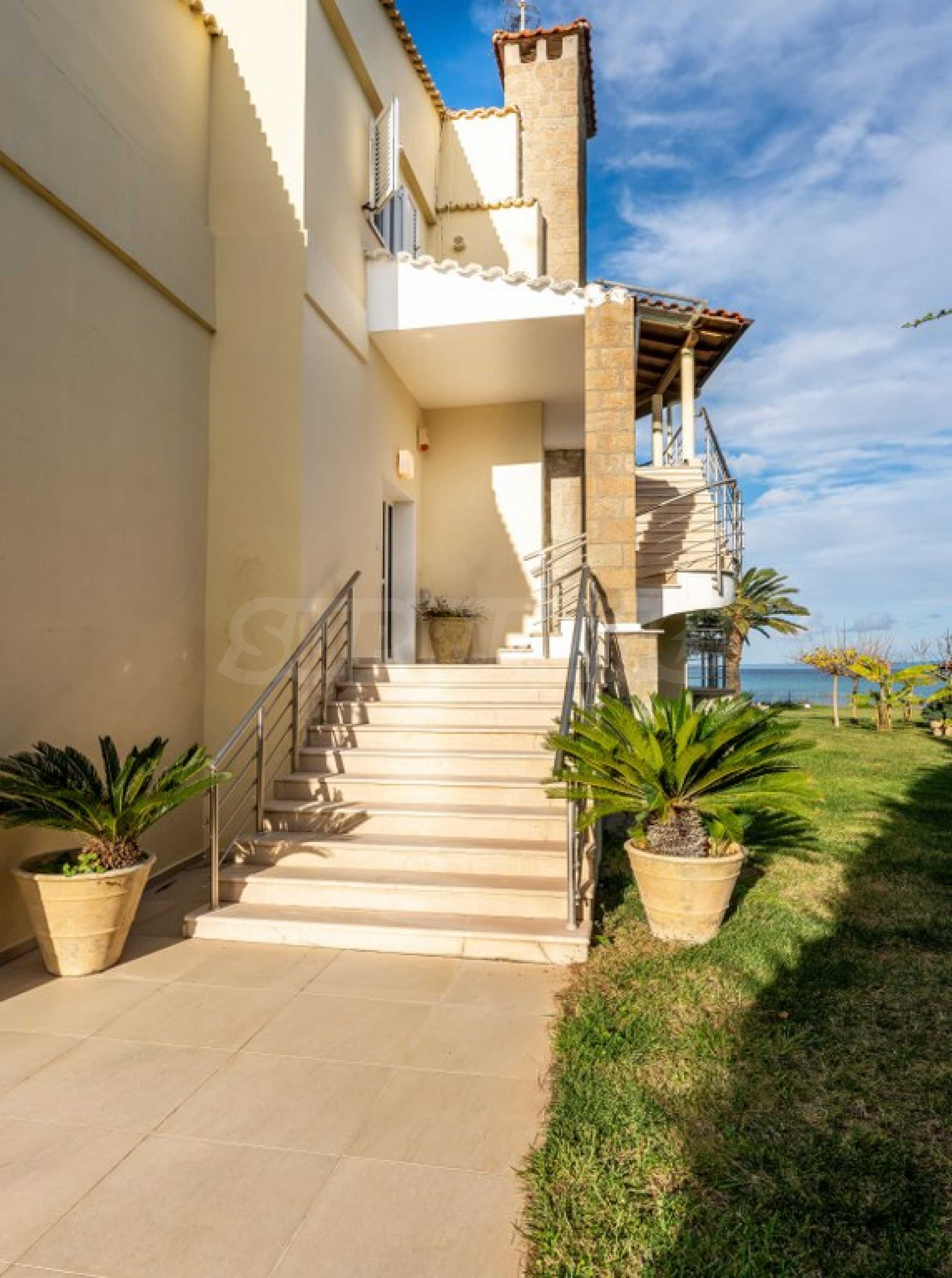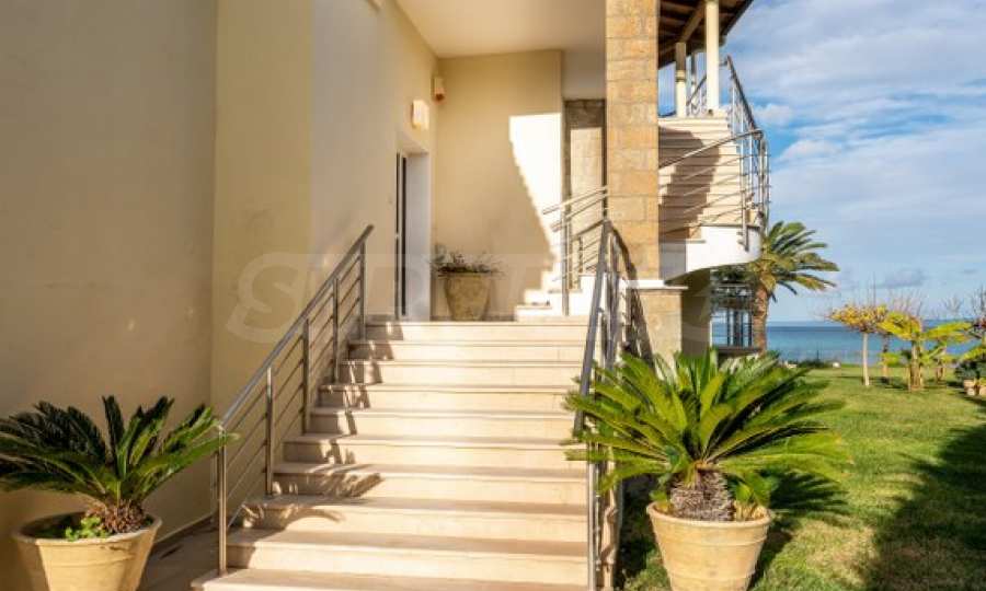Екстериорът на вилата е обгърнат от просторна градина, където палмовите дървета и цветни лехи създават усещане за тропически рай. В непосредствена близост до морето, плажът е буквално на една ръка разстояние, предлагащ уникална възможност за наслаждаване на звука на вълните и чистия морски въздух.
