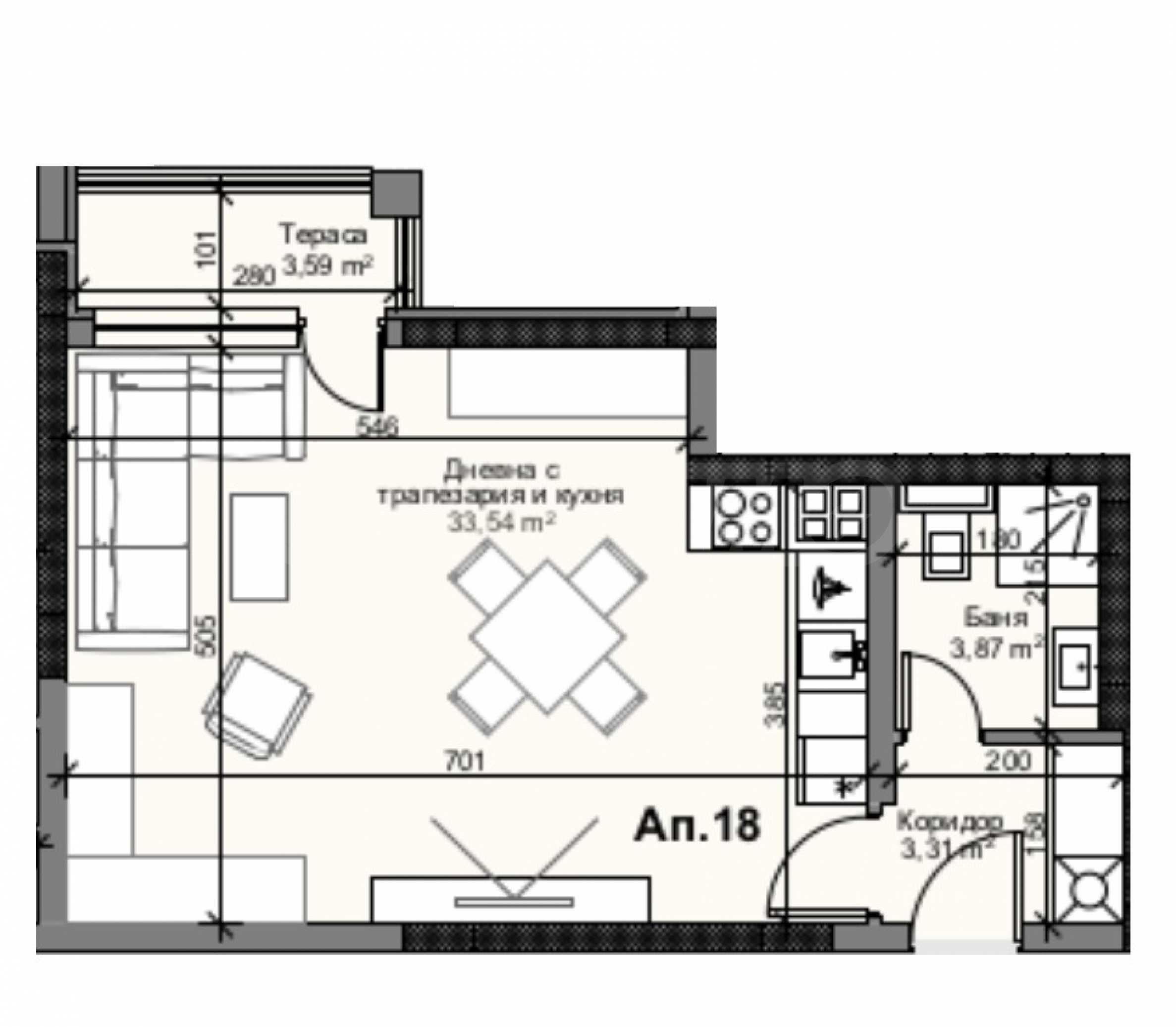 - дневна, трапезария и кухненски кът;