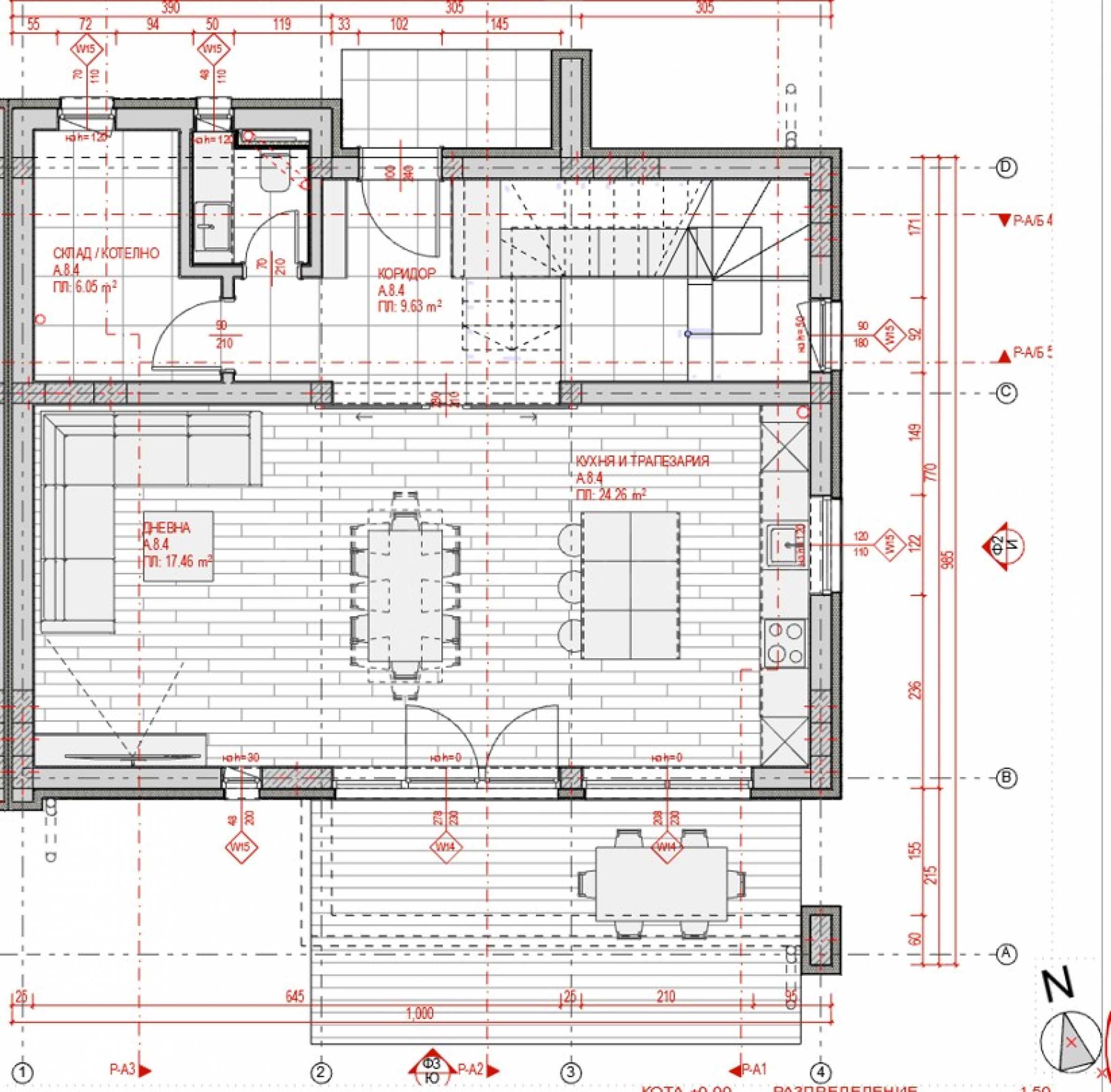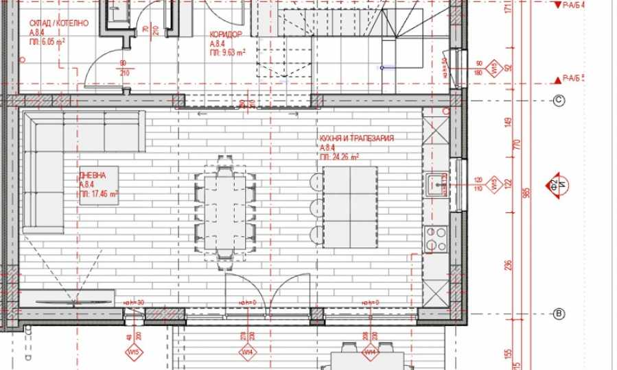 - 1-ви етаж: предверие 10 кв.м, дневна с трапезария и кухненски бокс 42 кв.м, тоалетна 2 кв.м, склад 6 кв.м, покрита веранда 17.94 кв.м;