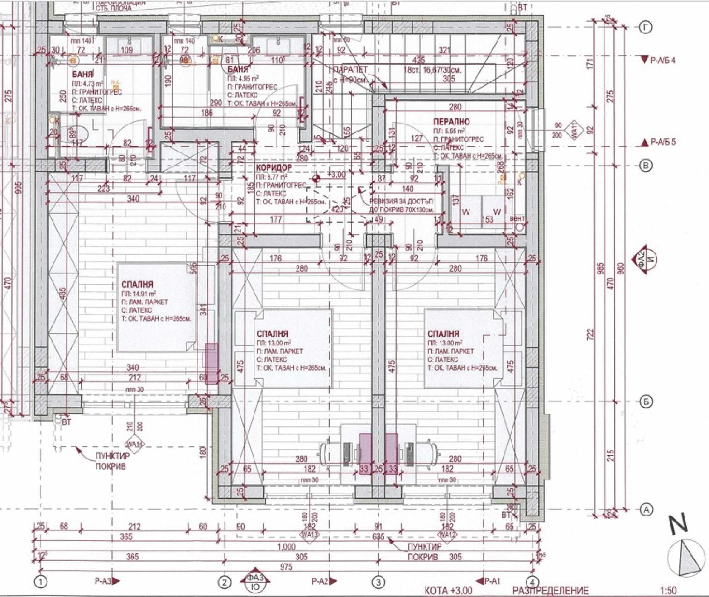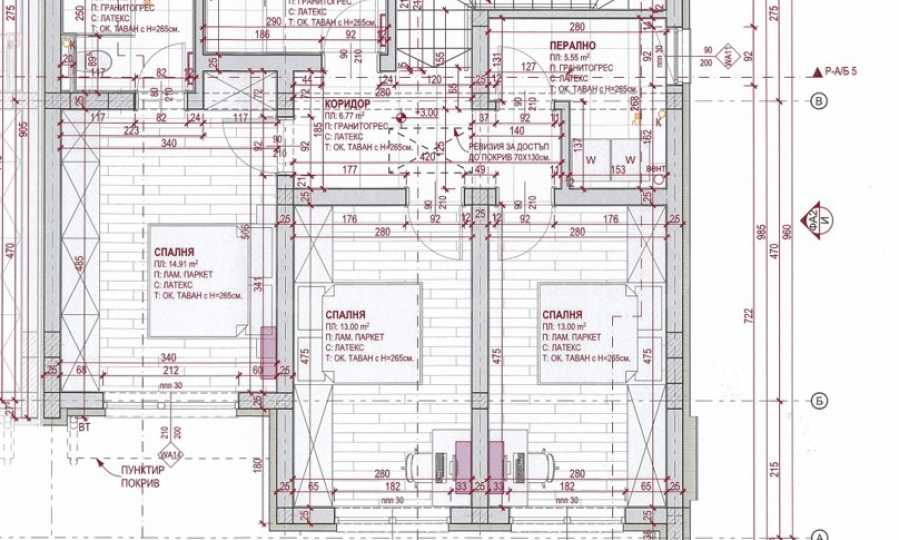 - 2-ри етаж: три спални, две по 13 кв.м и една от 15 кв.м, два санитарни възела и перално помещение.