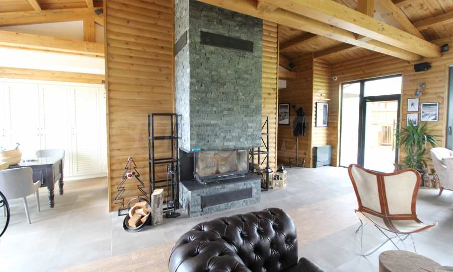 Светъл дневен тракт с удобни мебели, плоскоекранен телевизор и панорамни прозорци;