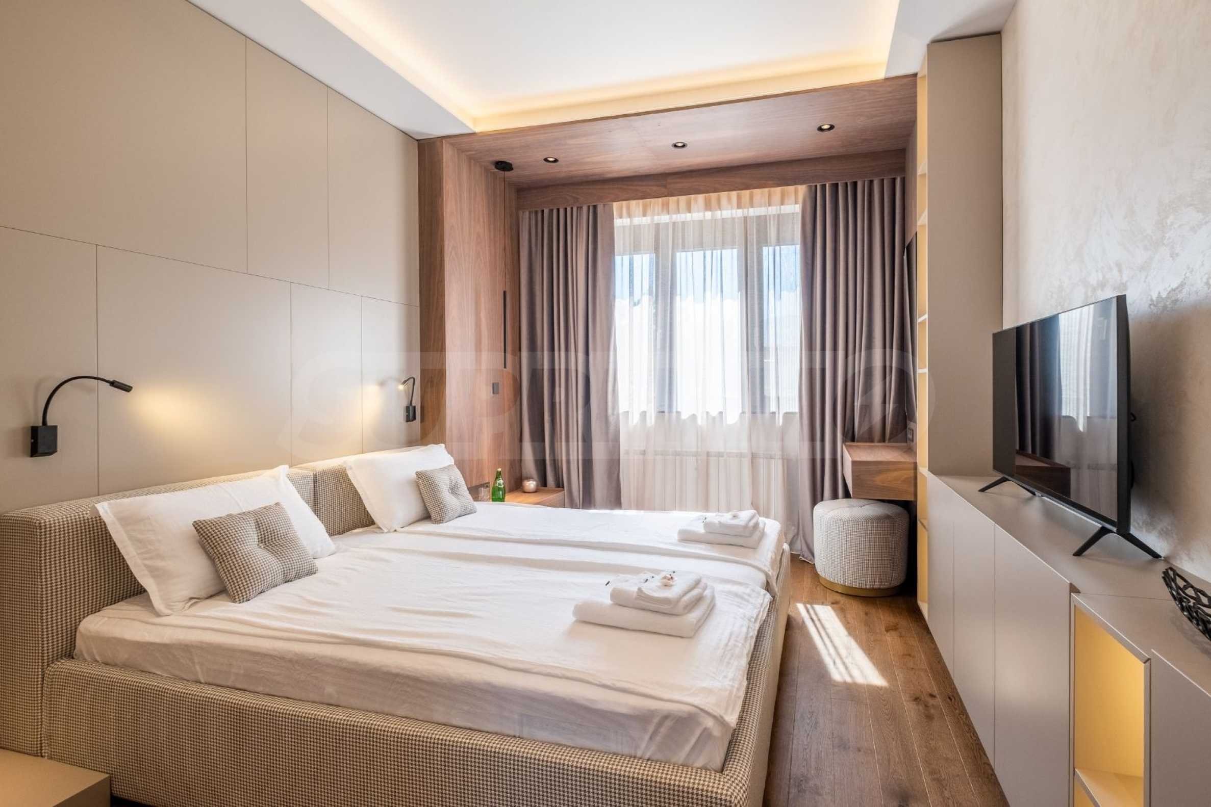 Дневната е обзаведена с дизайнерски мебели, разполага с действаща камина, както и с изключителна гледка към най-емблематичните архитектурни забележителности на София. Кухнята е напълно оборудвана и разполага с първокласни уреди, идеални за кулинарни ентусиасти. Всички настилки са от висококачествени естествени материали, допълващи цялостното усещане за комфорт в апартамента.
