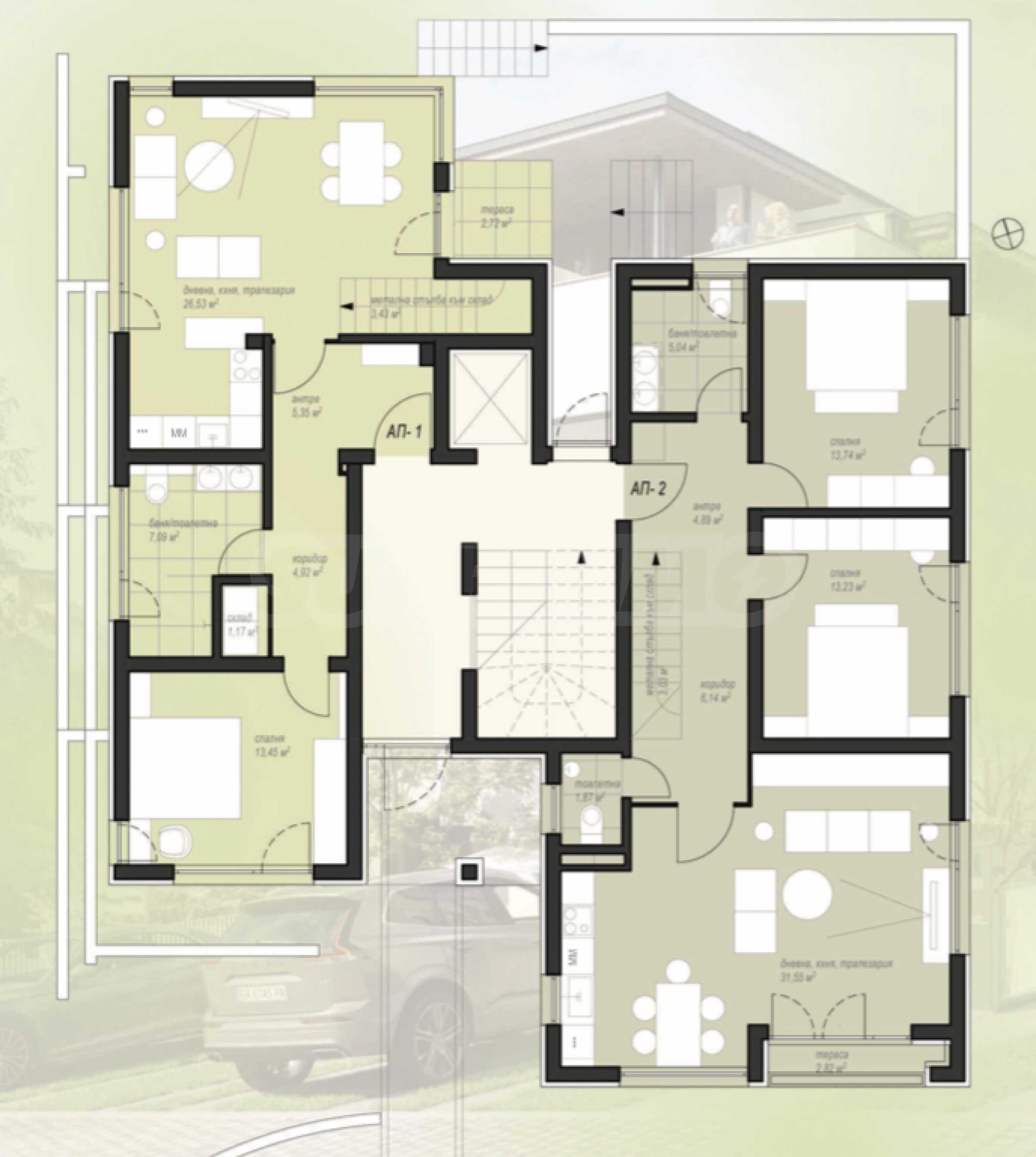 - модерна фасада - комбинация от силиконова мазилка и фасадна облицовка от естествен камък;