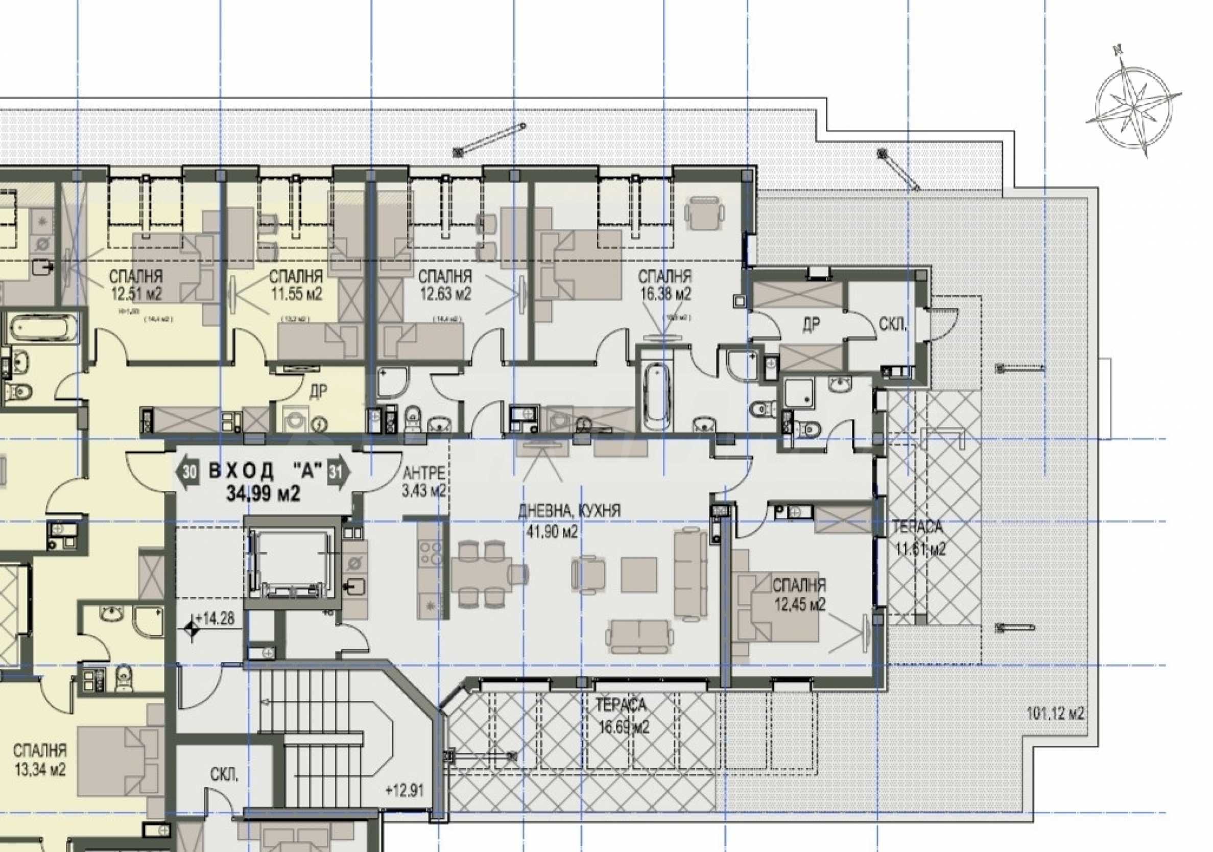 • големи тераси – 130 кв.м (допълнителни) ориентирани на изток и юг, идеални за релакс и зони за игра, заобикалящи целия апартамент.