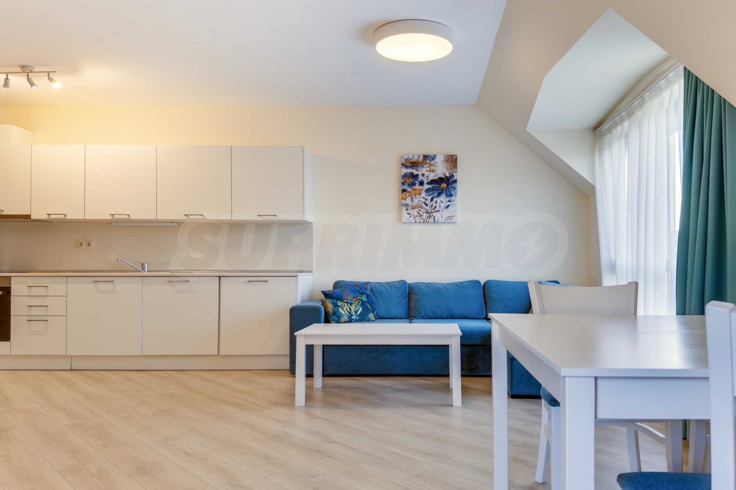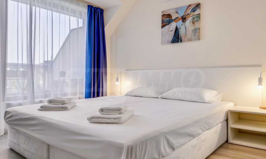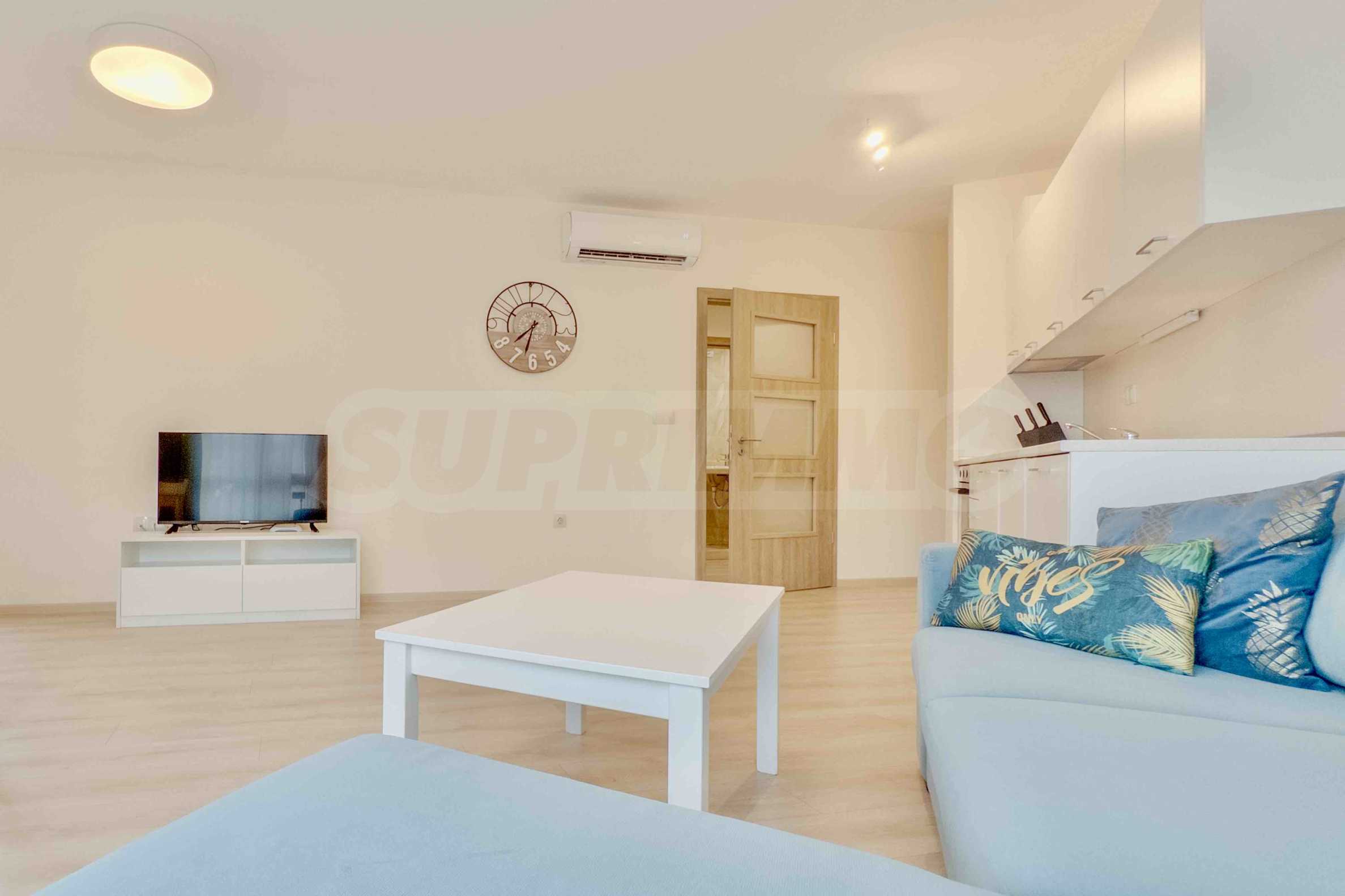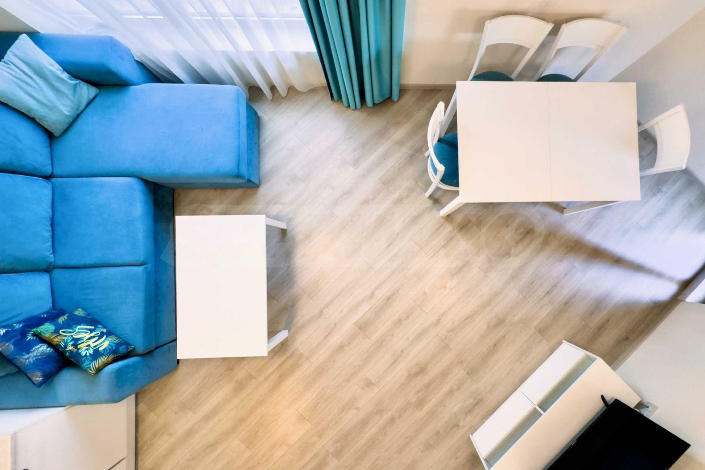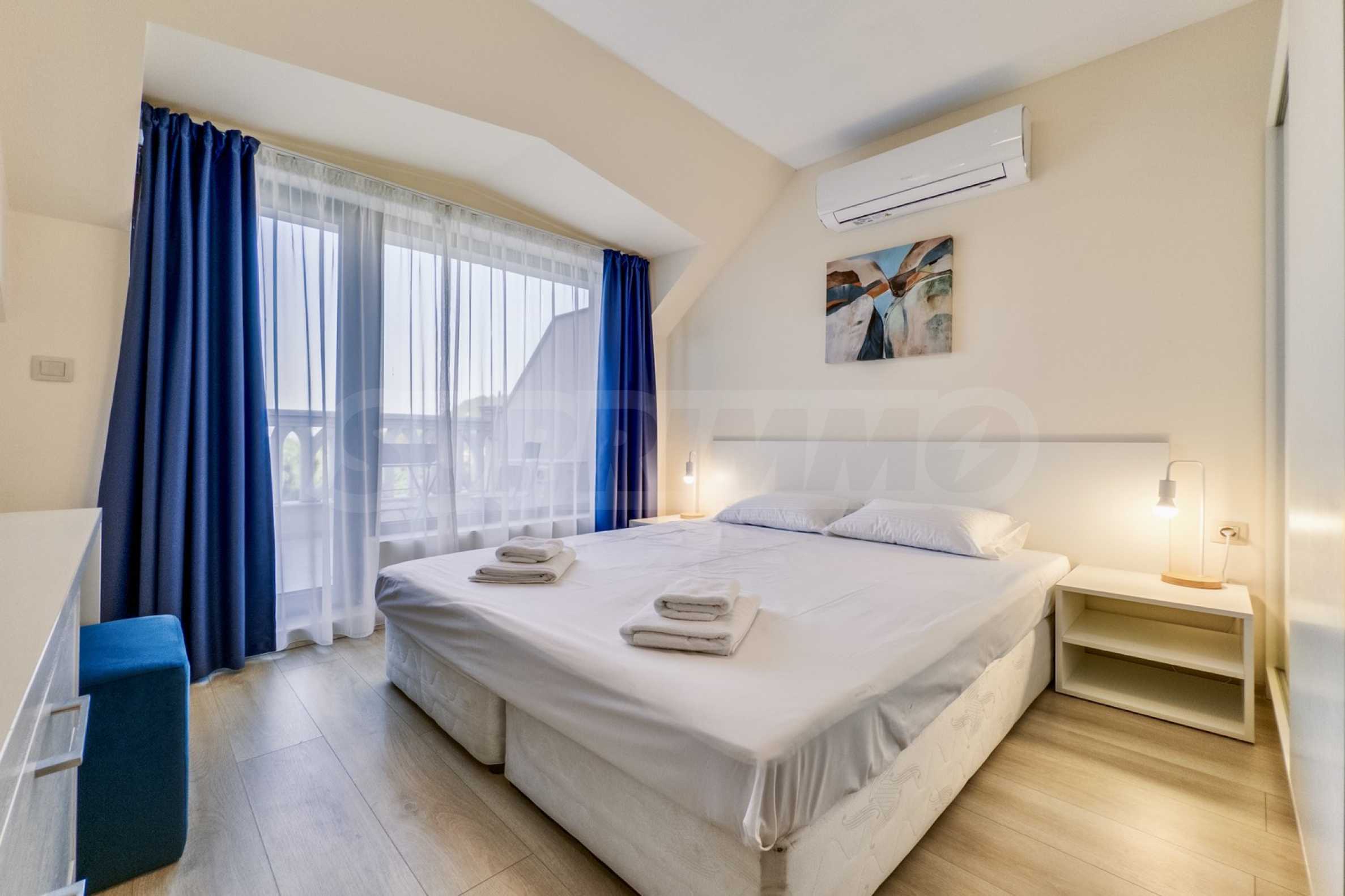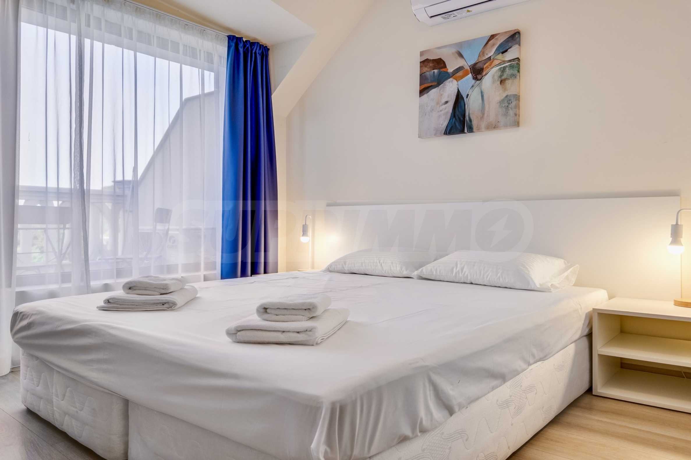 Представяме уютно обзаведен двустаен апартамент под наем, в луксозен затворен комплекс на брега на морето, в кв. "Аспарухово" на град Варна.