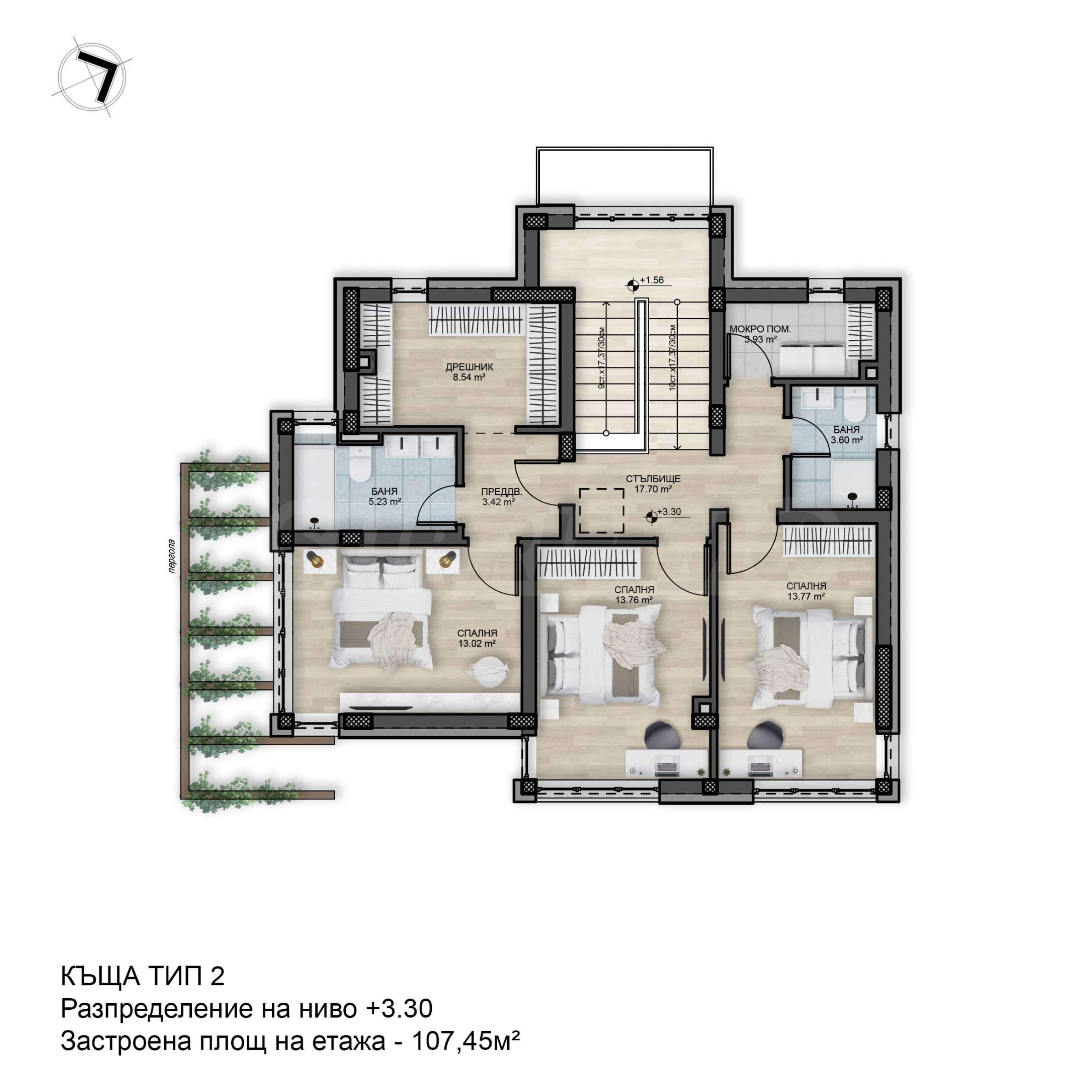 Етаж 2: три спални, две бани, дрешник, мокро помещение.